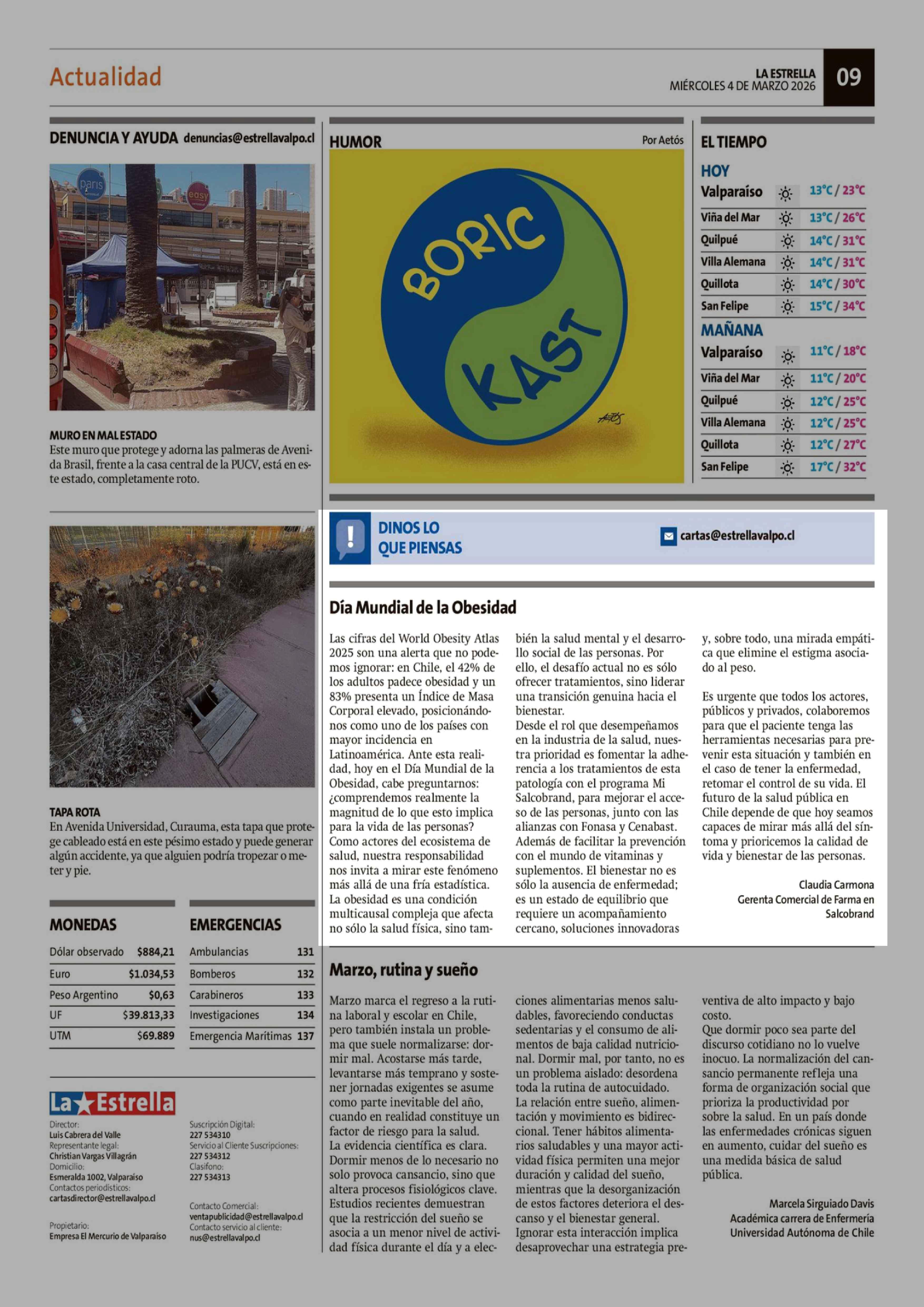 Columnas de Opinión: Día Mundial de la Obesidad 04-03-2026 La Estrella de Valparaíso |