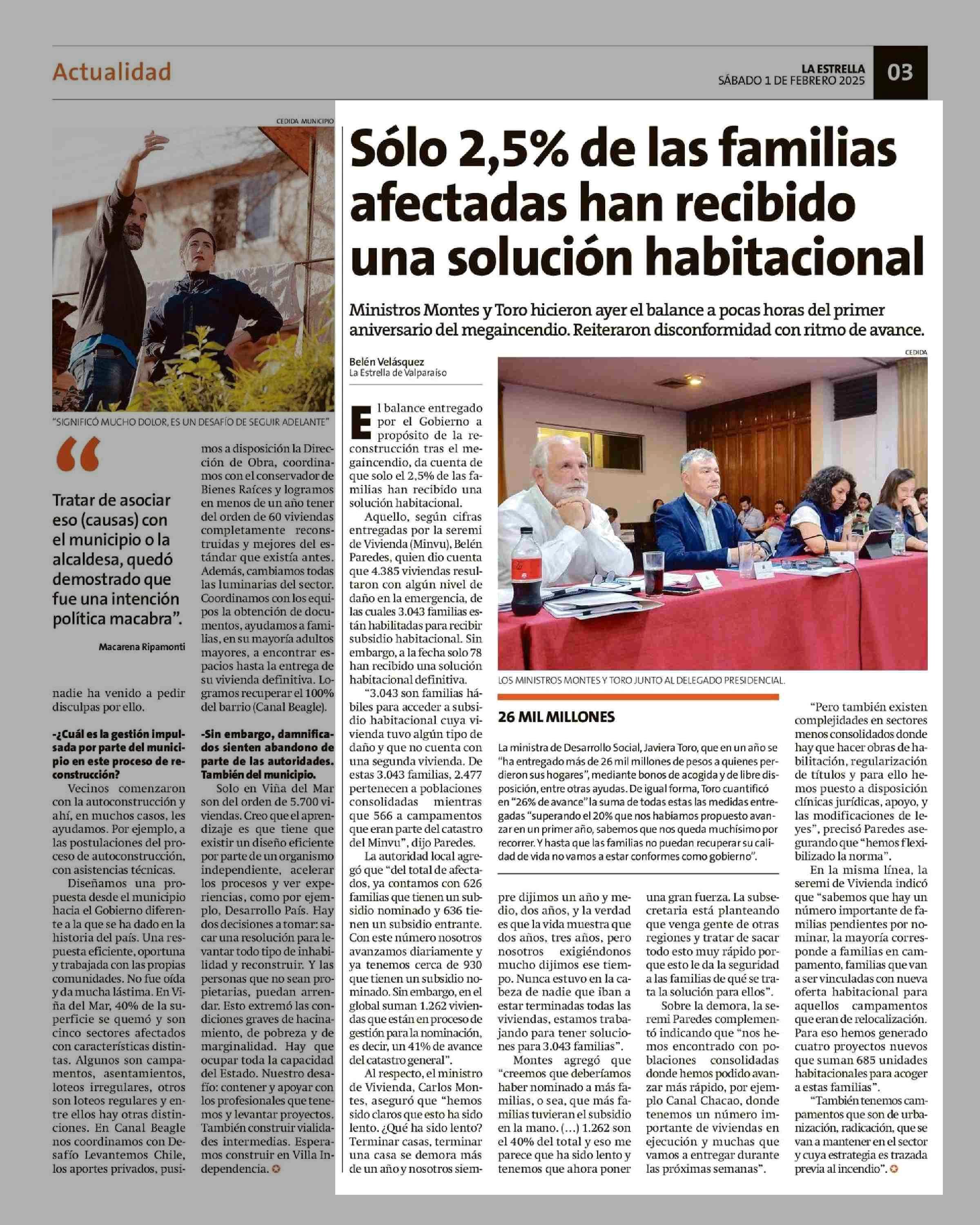 Sólo 2,5% de las familias una solución habitacional afectadas han recibido 01-02-2025 La Estrella de Valparaíso |