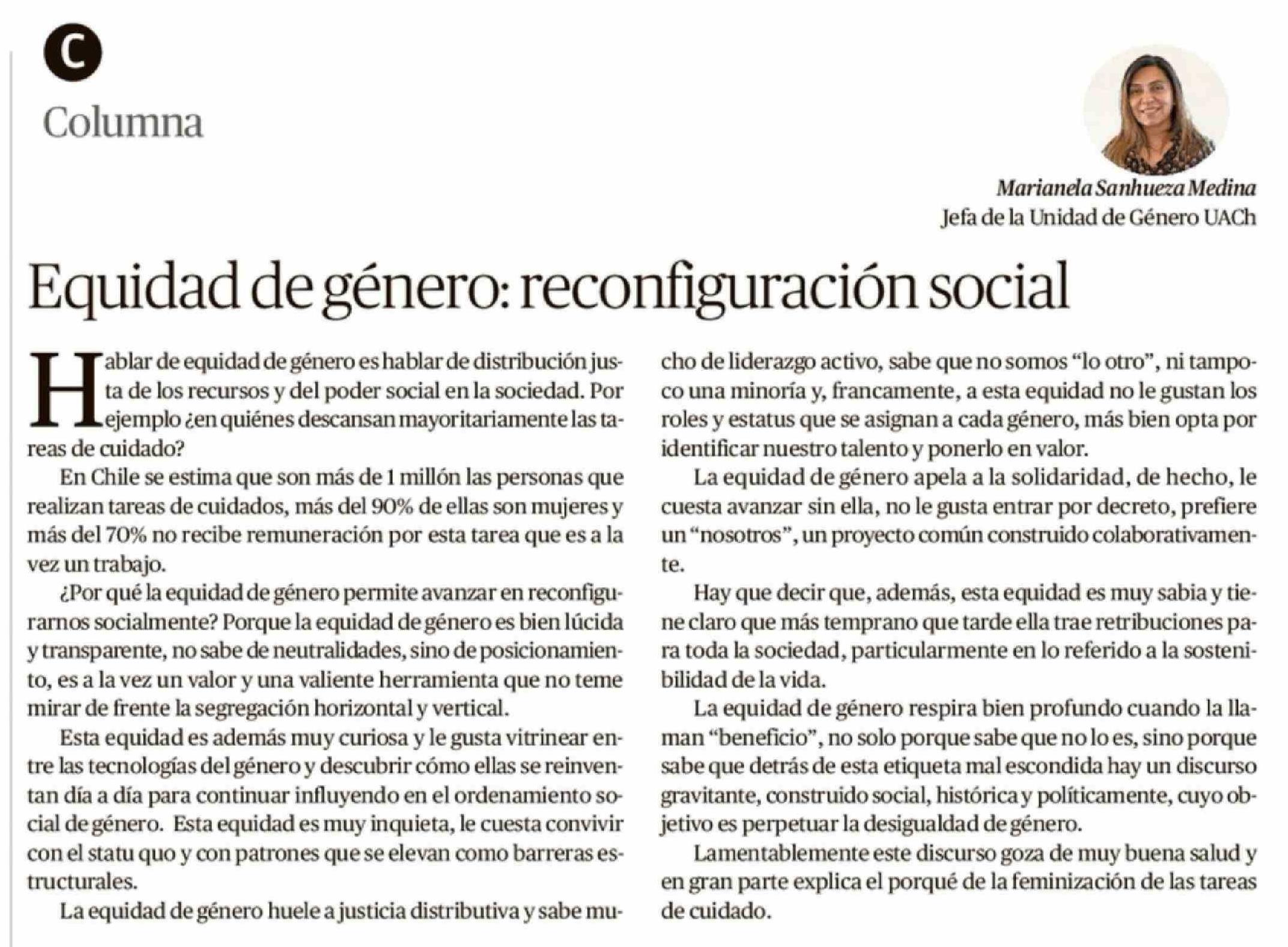 Columnas de Opinión: Equidad de género: reconfiguración social 12-03-2026 Diario Austral Región de Los Ríos |