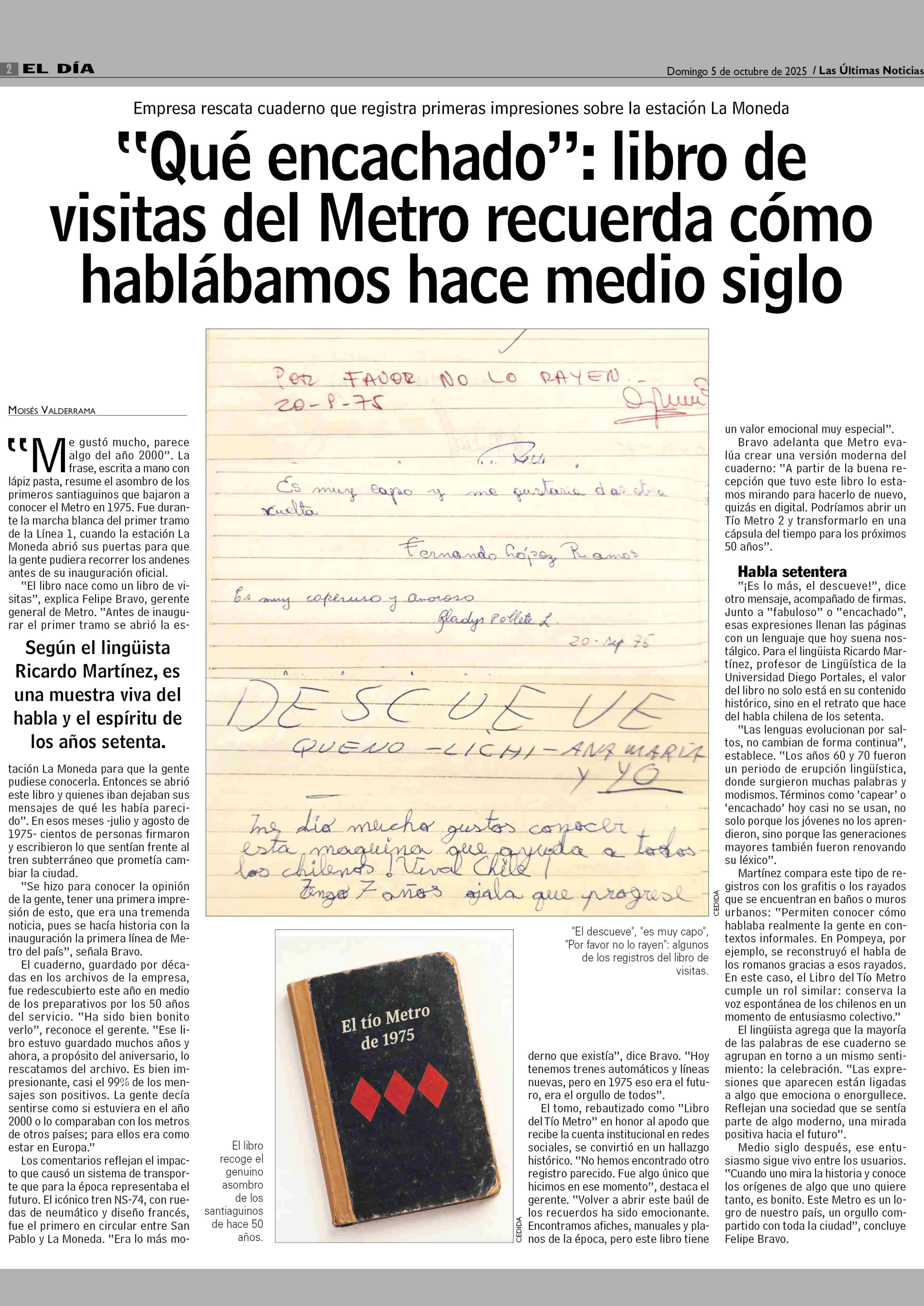 "Qué encachado": libro de visitas del Metro recuerda cómo hablábamos hace medio siglo 05-10-2025 Las Últimas Noticias |