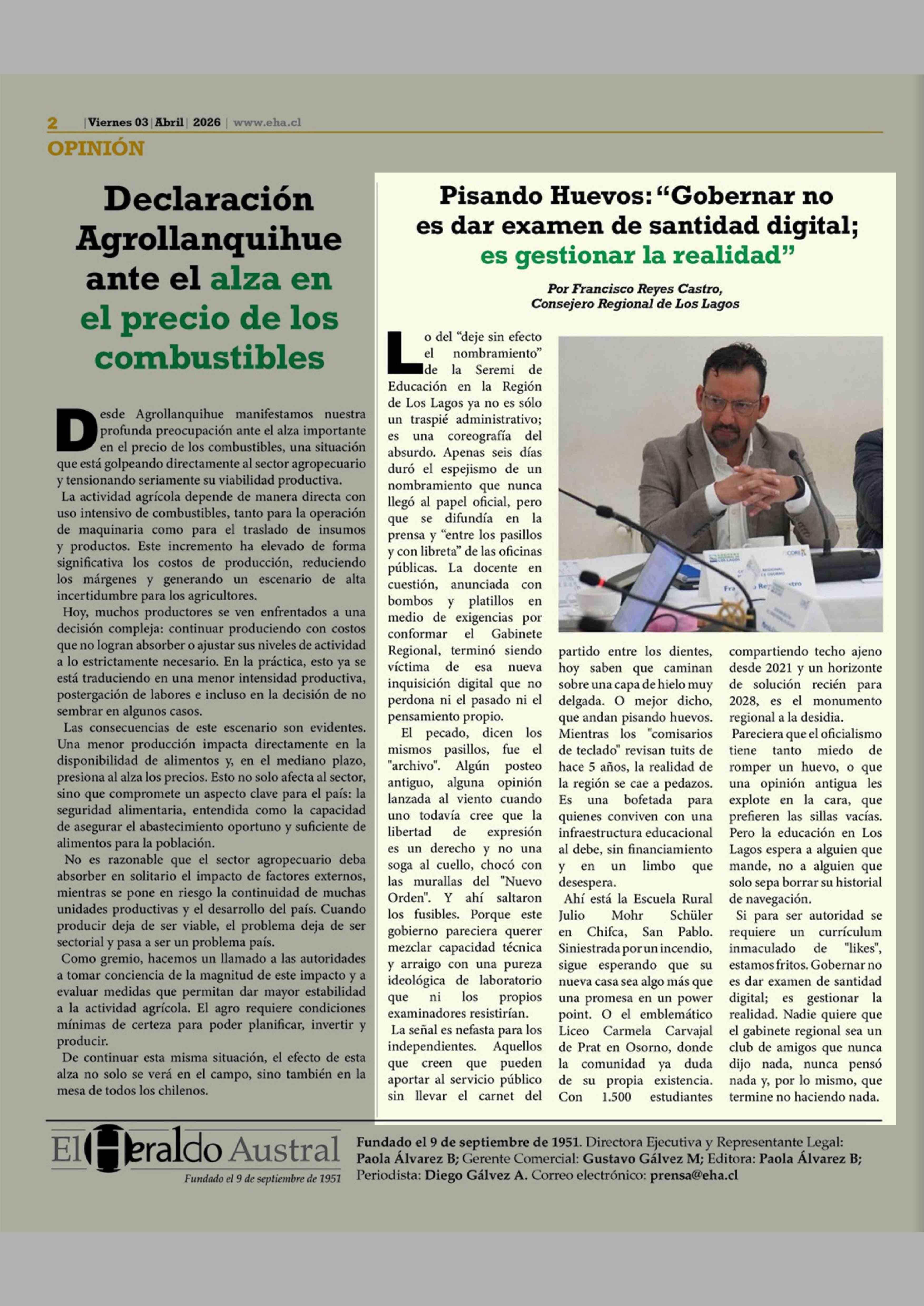 Columnas de Opinión: Pisando Huevos: "Gobernar no es dar examen de santidad digital; es gestionar la realidad" 03-04-2026 El Heraldo Austral |
