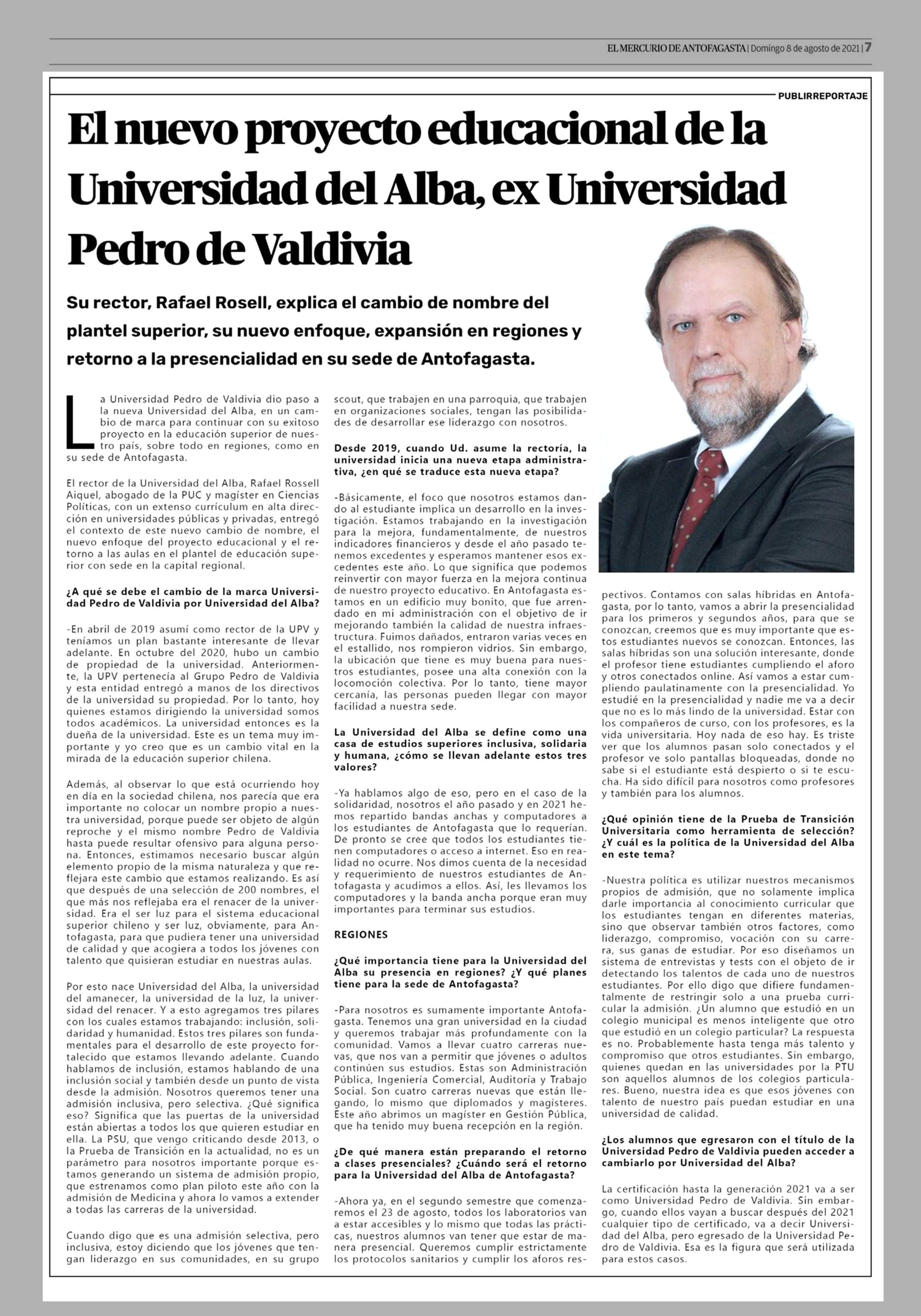 El nuevo proyecto educacional de la Universidad del Alba, ex Universidad Pedro de Valdivia 08-08-2021 El Mercurio de Antofagasta |
