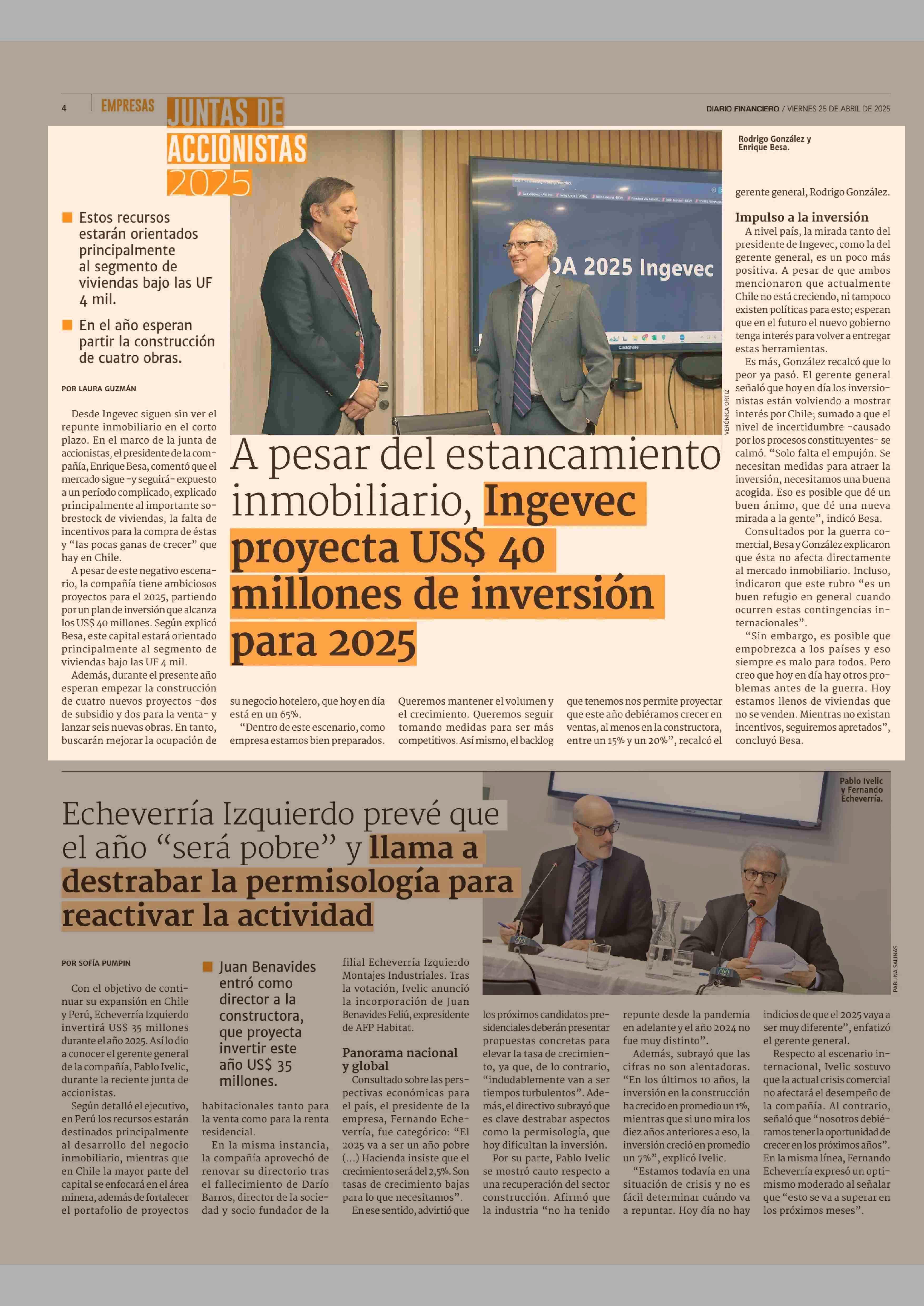 A pesar del estancamiento inmobiliario, Ingevec proyecta US$ 40 millones de inversión para 2025 25-04-2025 Diario Financiero |