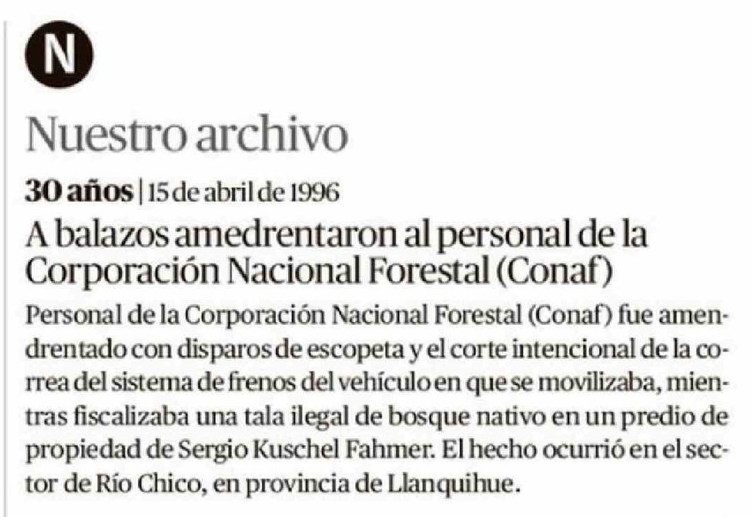 | Título: | 30 años | 15 de abril de 1996 A balazos amedrentaron al personal de la Corporación Nacional Forestal (Conaf) Personal de la Corporación Nacional Forestal (Conaf) fue amendrentado con disparos de escopeta y el corte intencional de la correa del sistema de frenos del vehículo en que se movilizaba, mie |