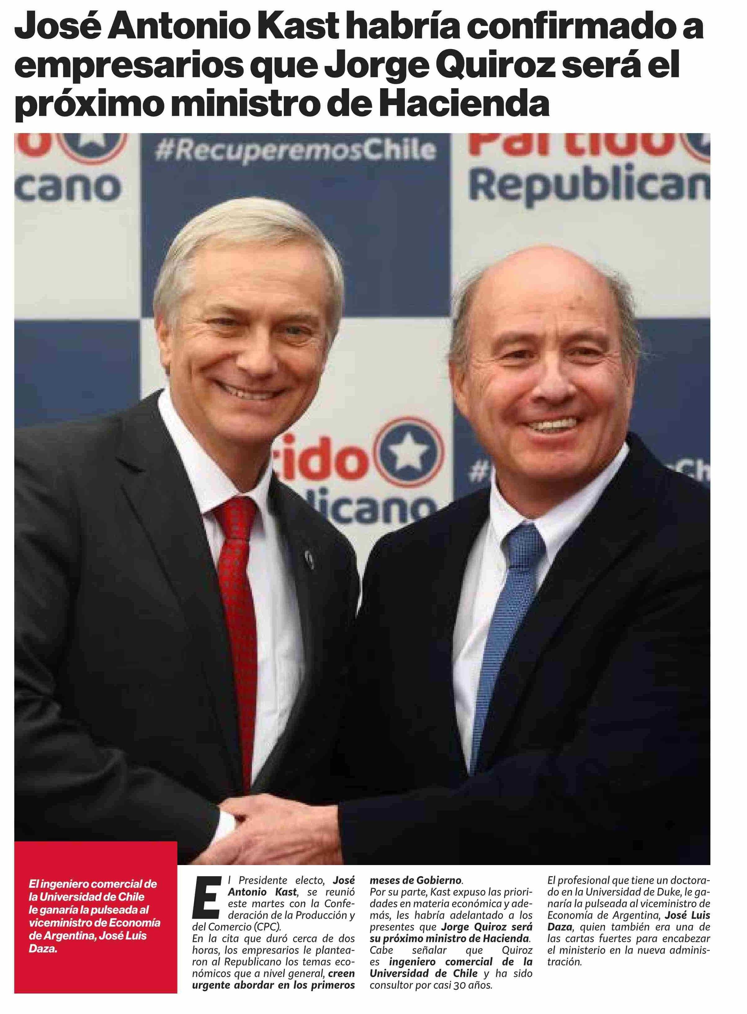 | Título: | José Antonio Kast habría confirmado a empresarios que Jorge Quiroz será el próximo ministro de Hacienda |