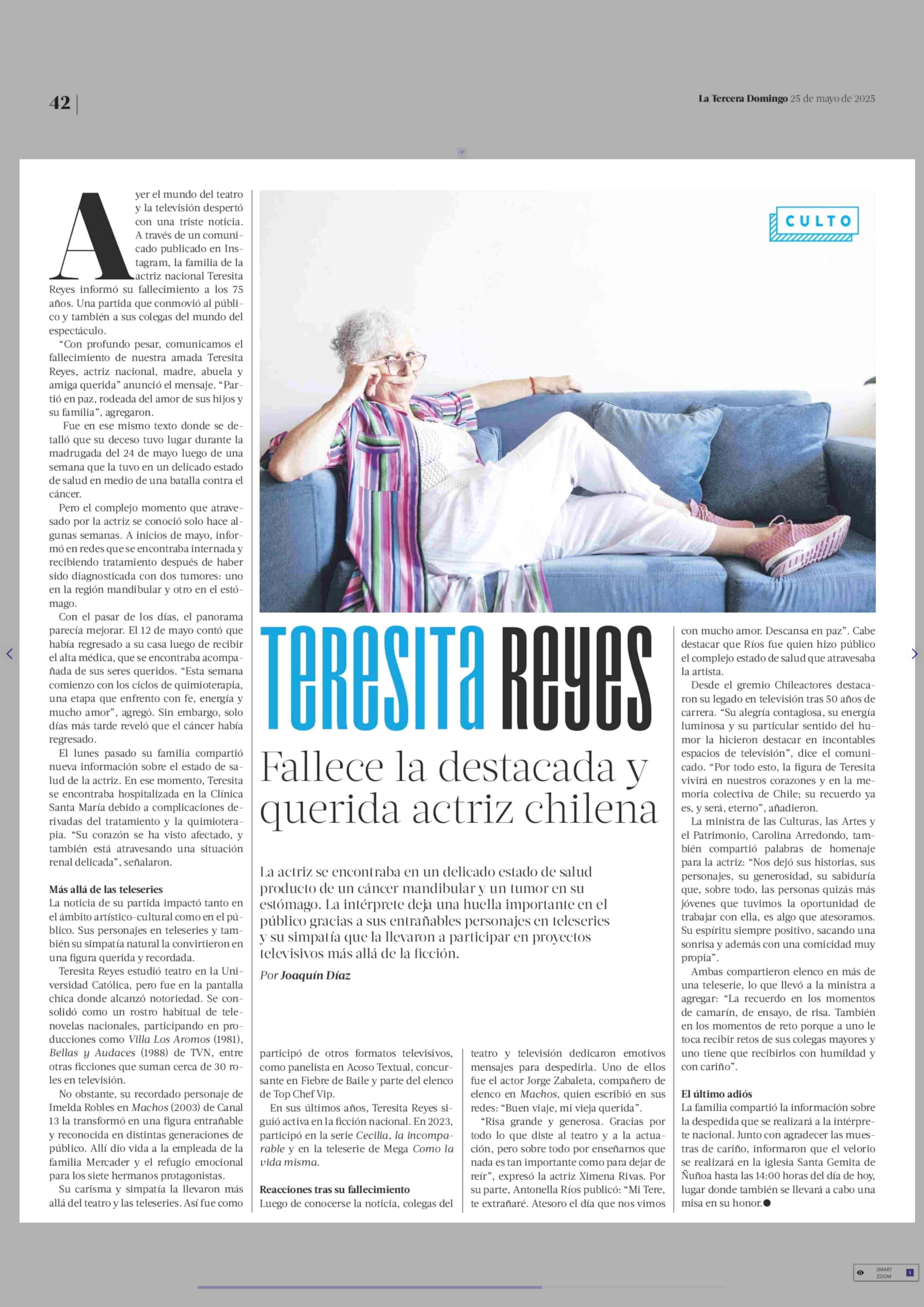 TERESITA REYES Fallece la destacada y querida actriz chilena 25-05-2025 La Tercera |
