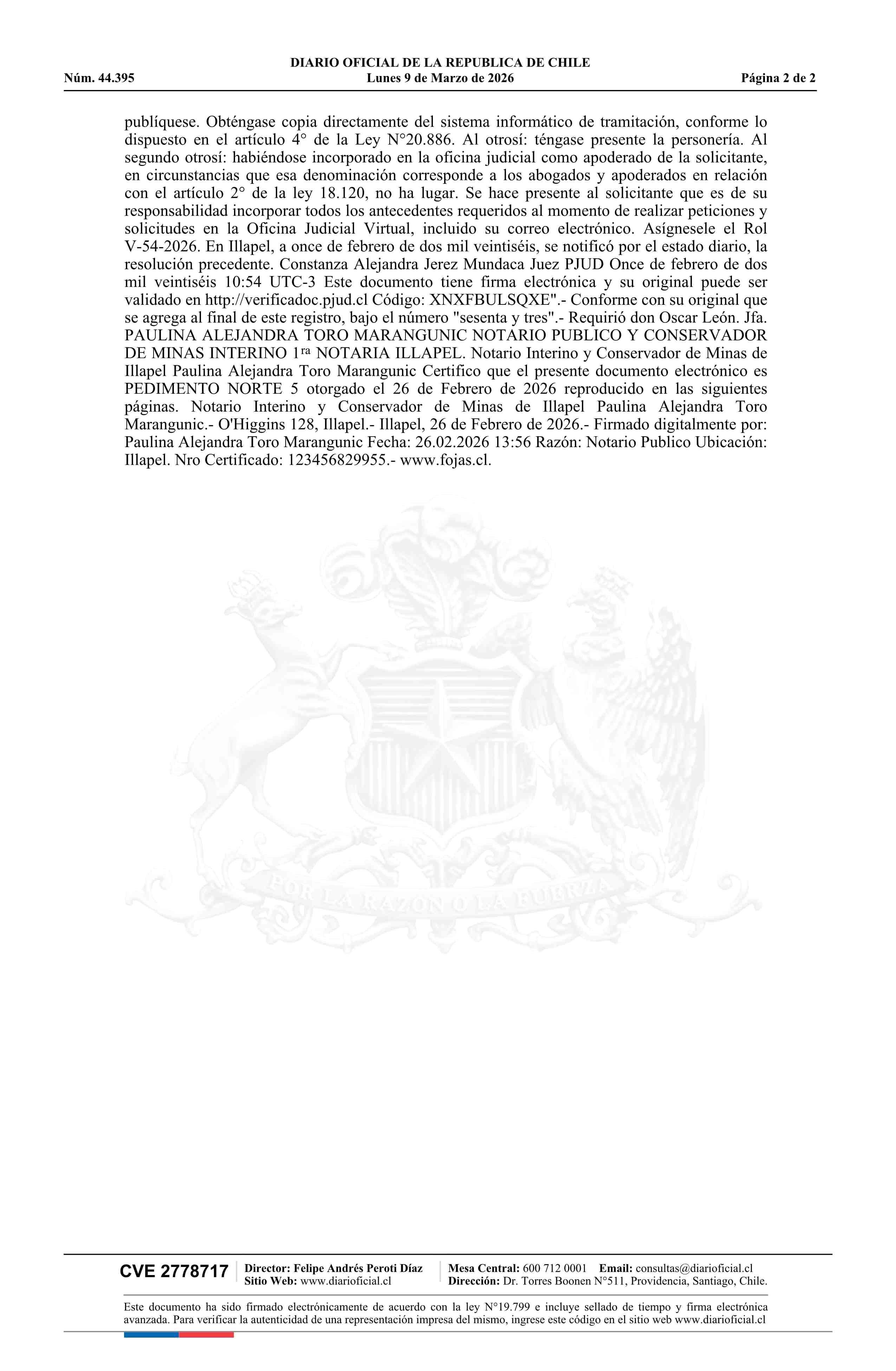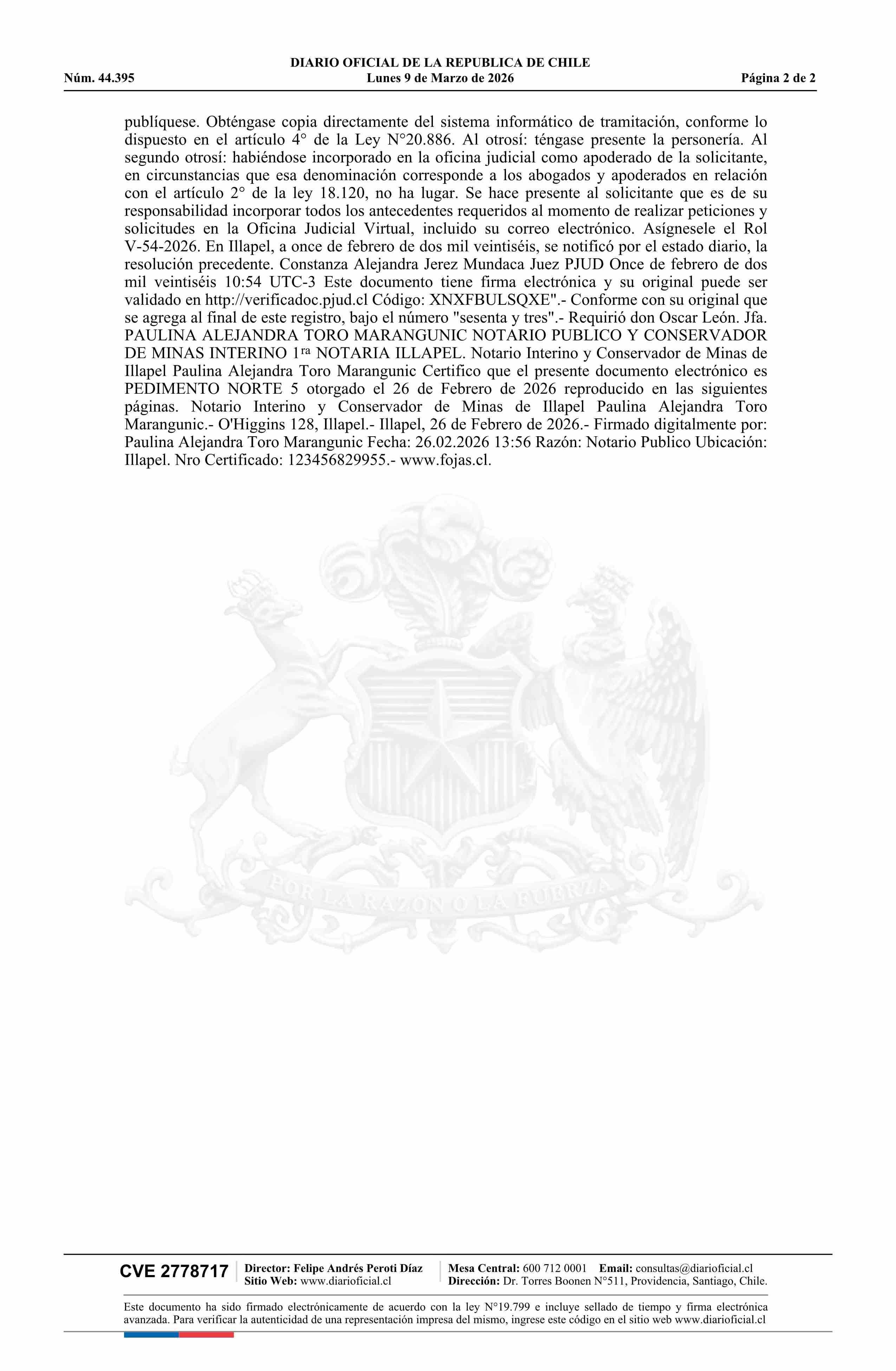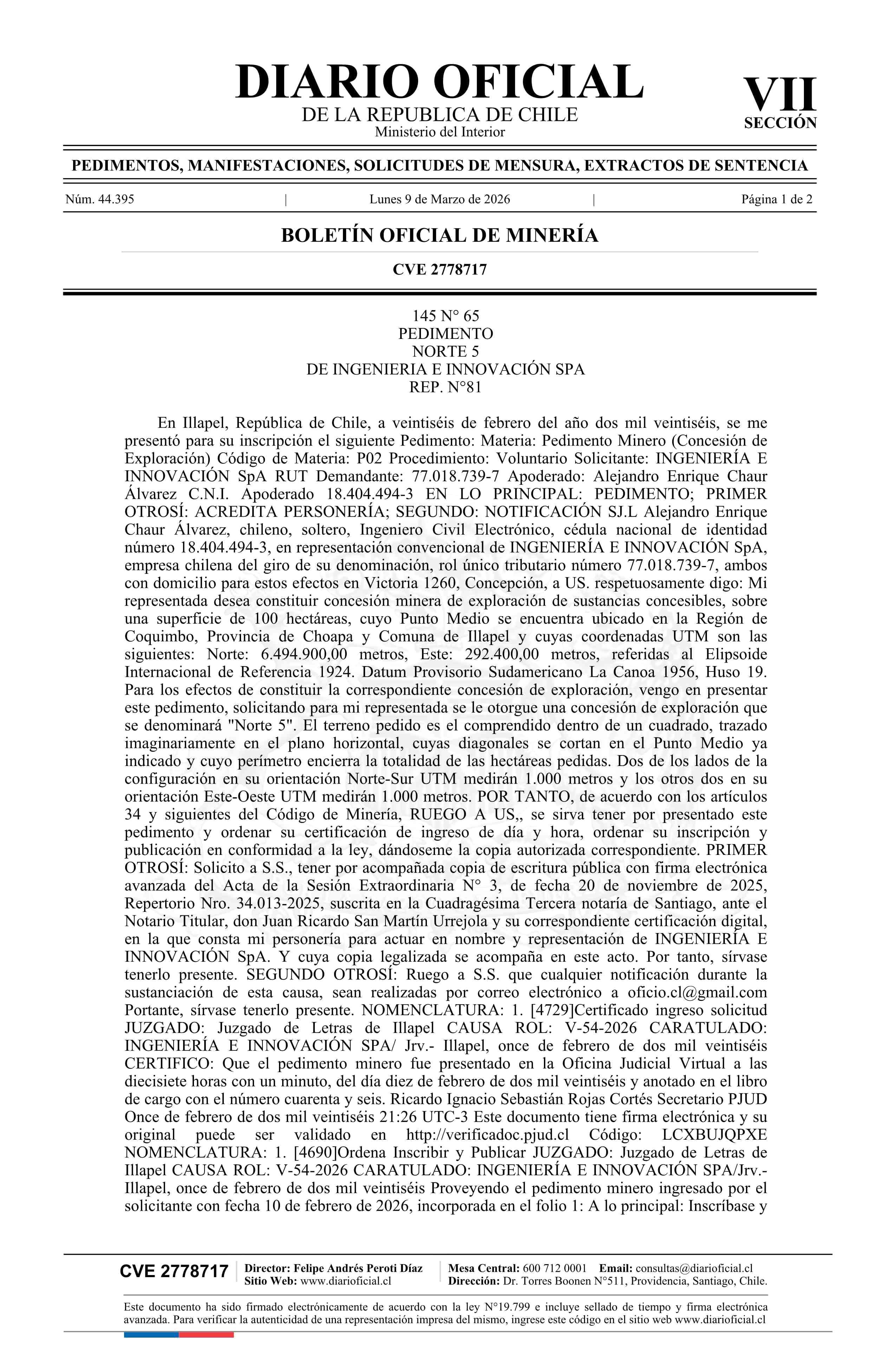 NORTE 5 / Ingeniería e Innovación SpA 09-03-2026 DIARIO OFICIAL CHILE - BOLETÍN OFICIAL DE MINERÍA |