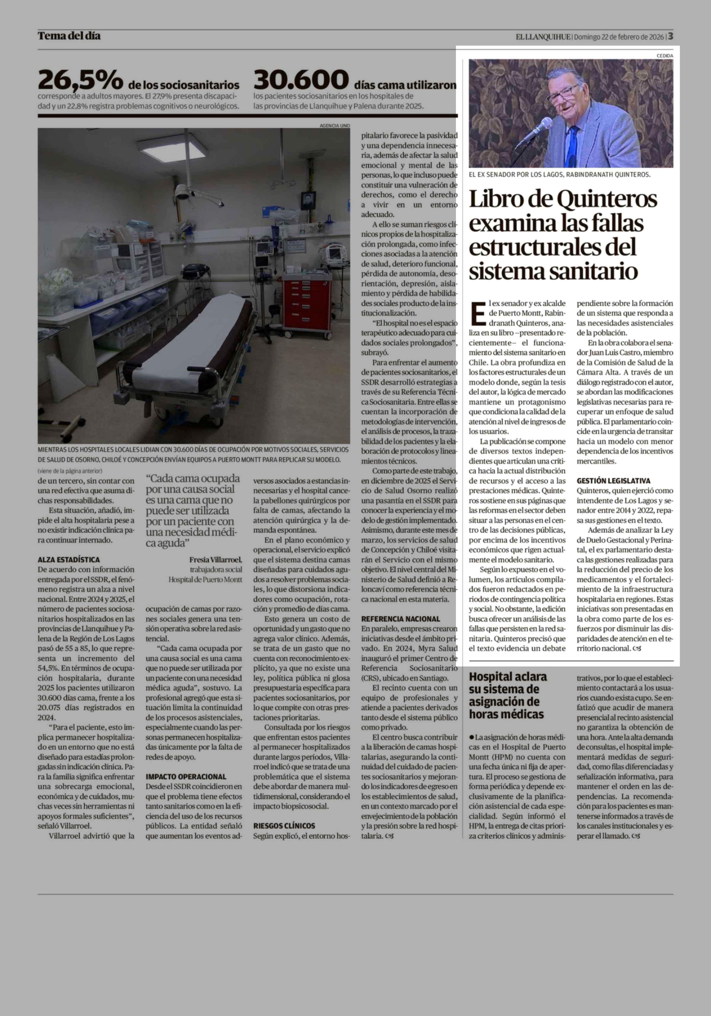 Libro de Quinteros examina las fallas estructurales del sistema sanitario 22-02-2026 El Llanquihue |