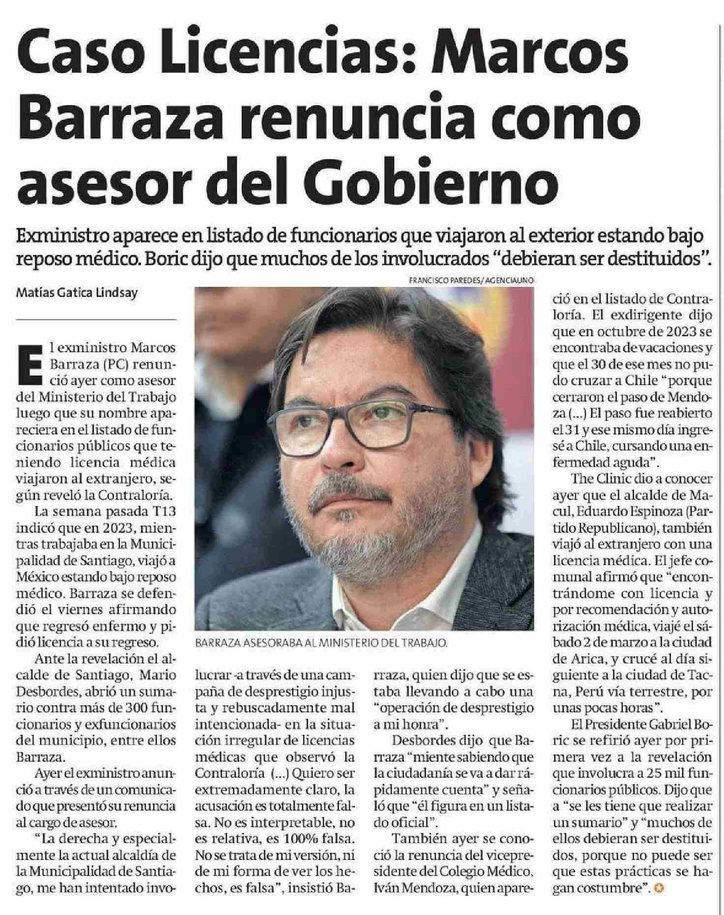Caso Licencias: Marcos Barraza renuncia como asesor del Gobierno 27-05-2025 La Estrella de Arica |