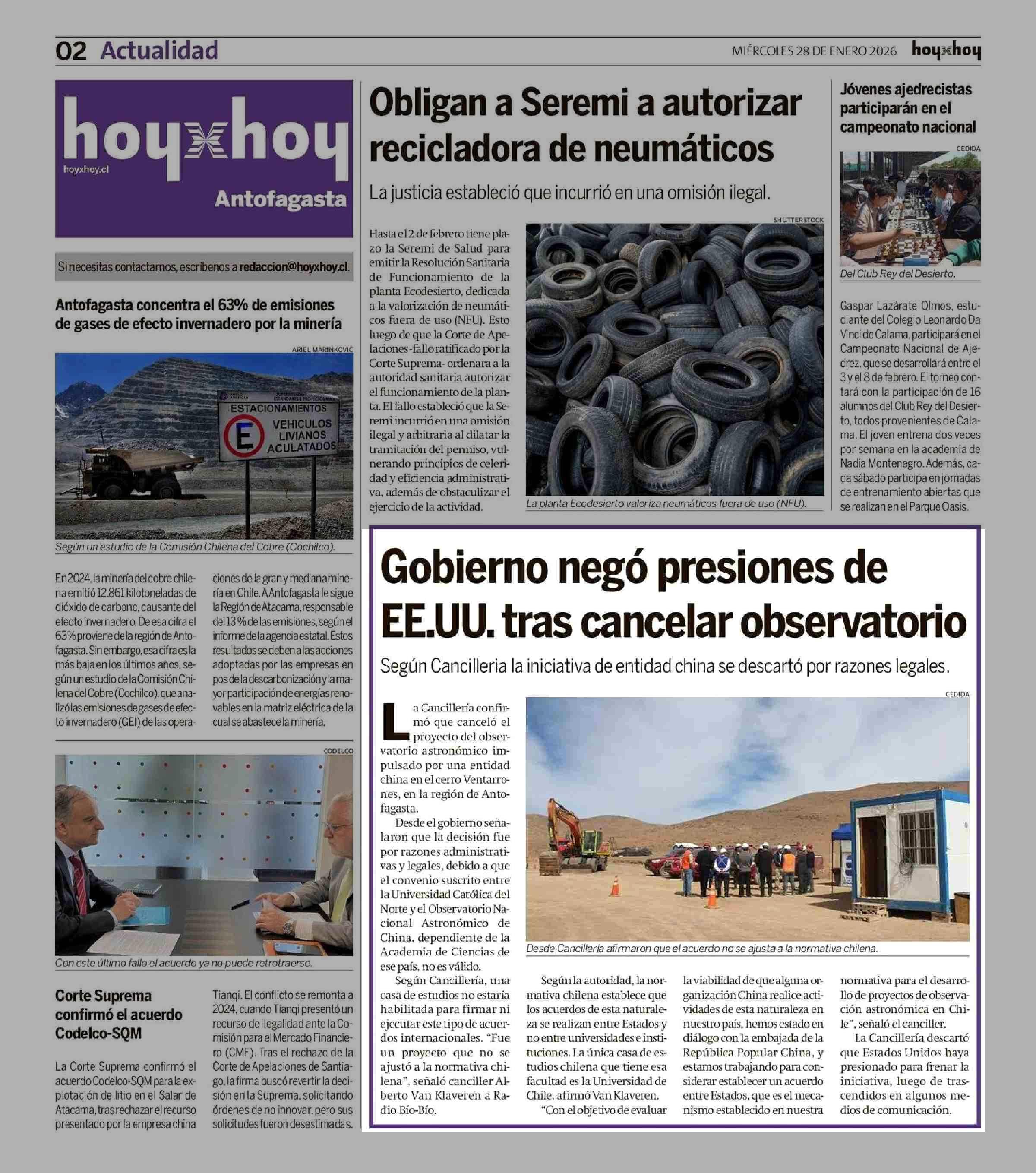 Gobierno negó presiones de EE.UU. tras cancelar observatorio 28-01-2026 Hoy x Hoy Antofagasta |