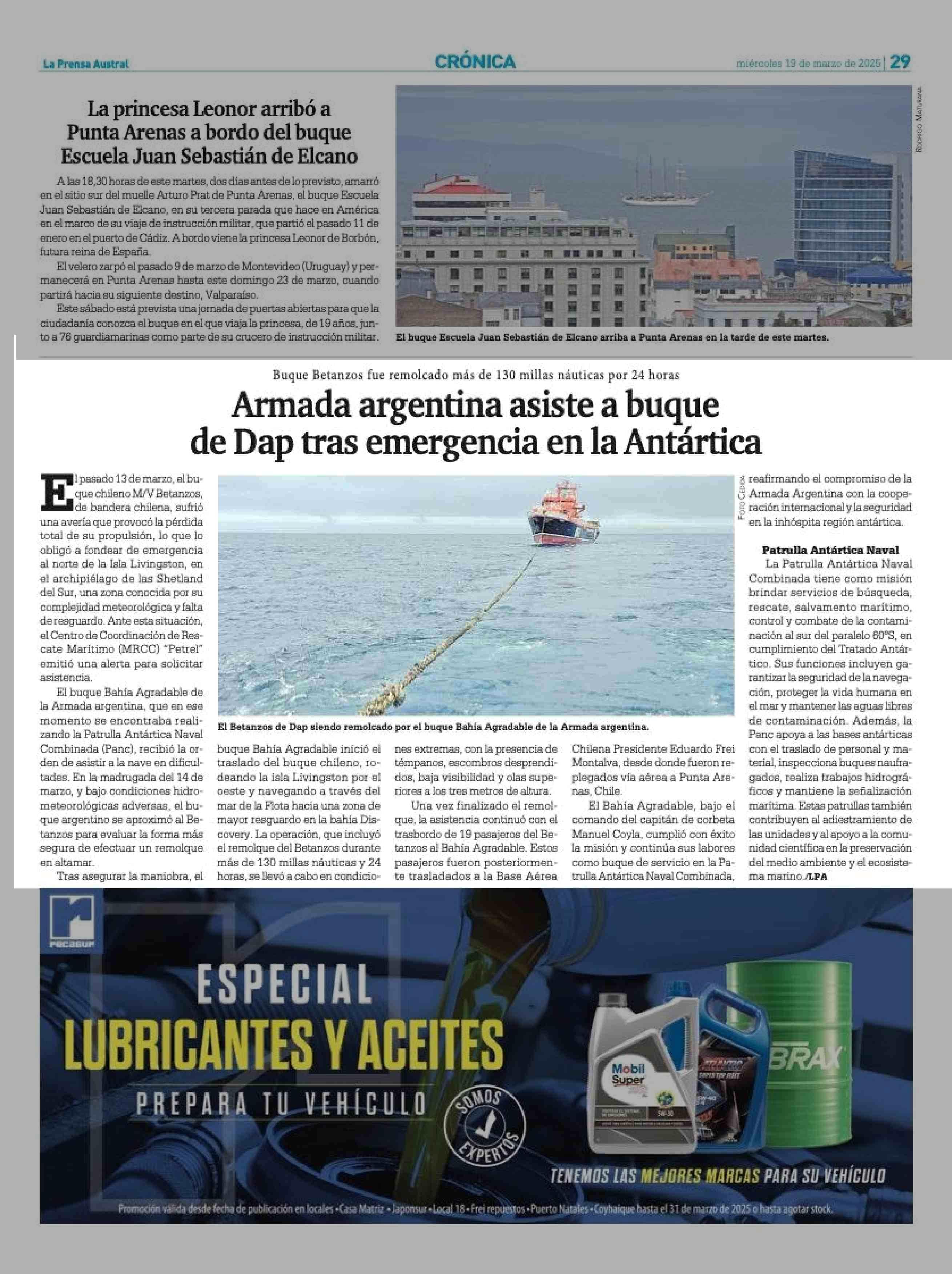| Fecha: | 19-03-2025 | Sector: | Noticia general | Región: | Región de Magallanes y de la Antártica Chilena |