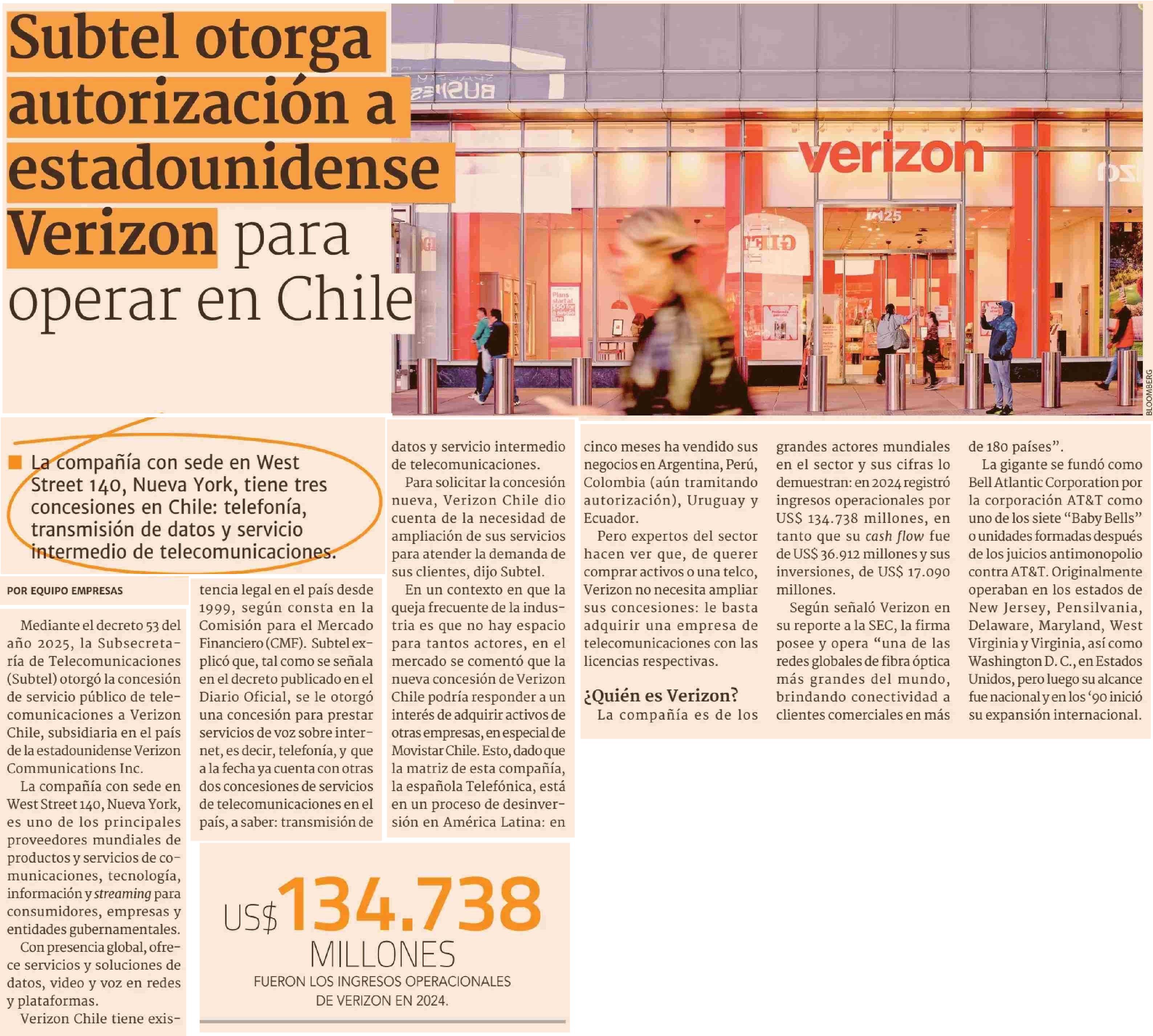 Subtel otorga autorización a estadounidense Verizon para operar en Chile 25-06-2025 Diario Financiero |