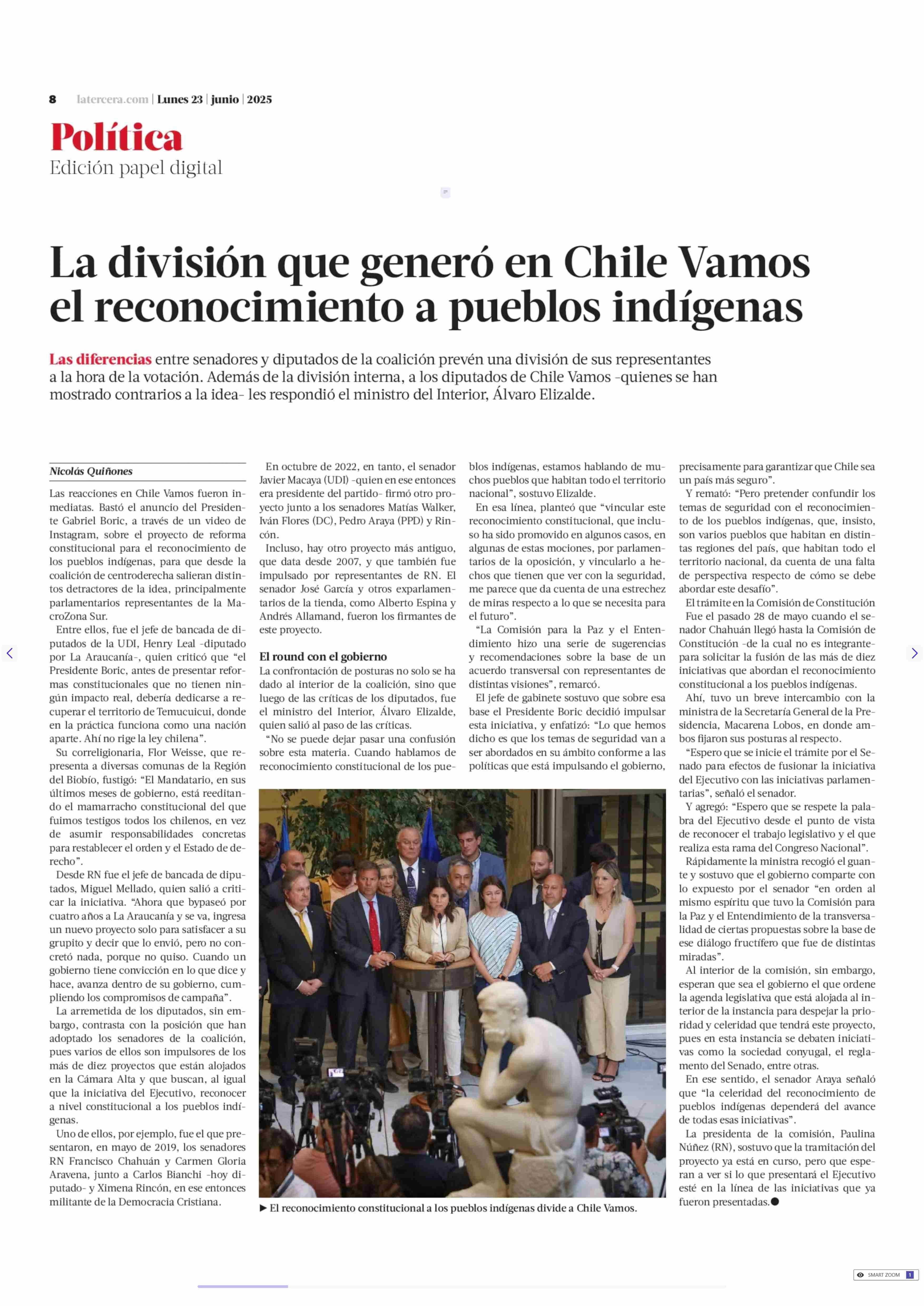 La división que generó en Chile Vamos el reconocimiento a pueblos indígenas 23-06-2025 La Tercera |