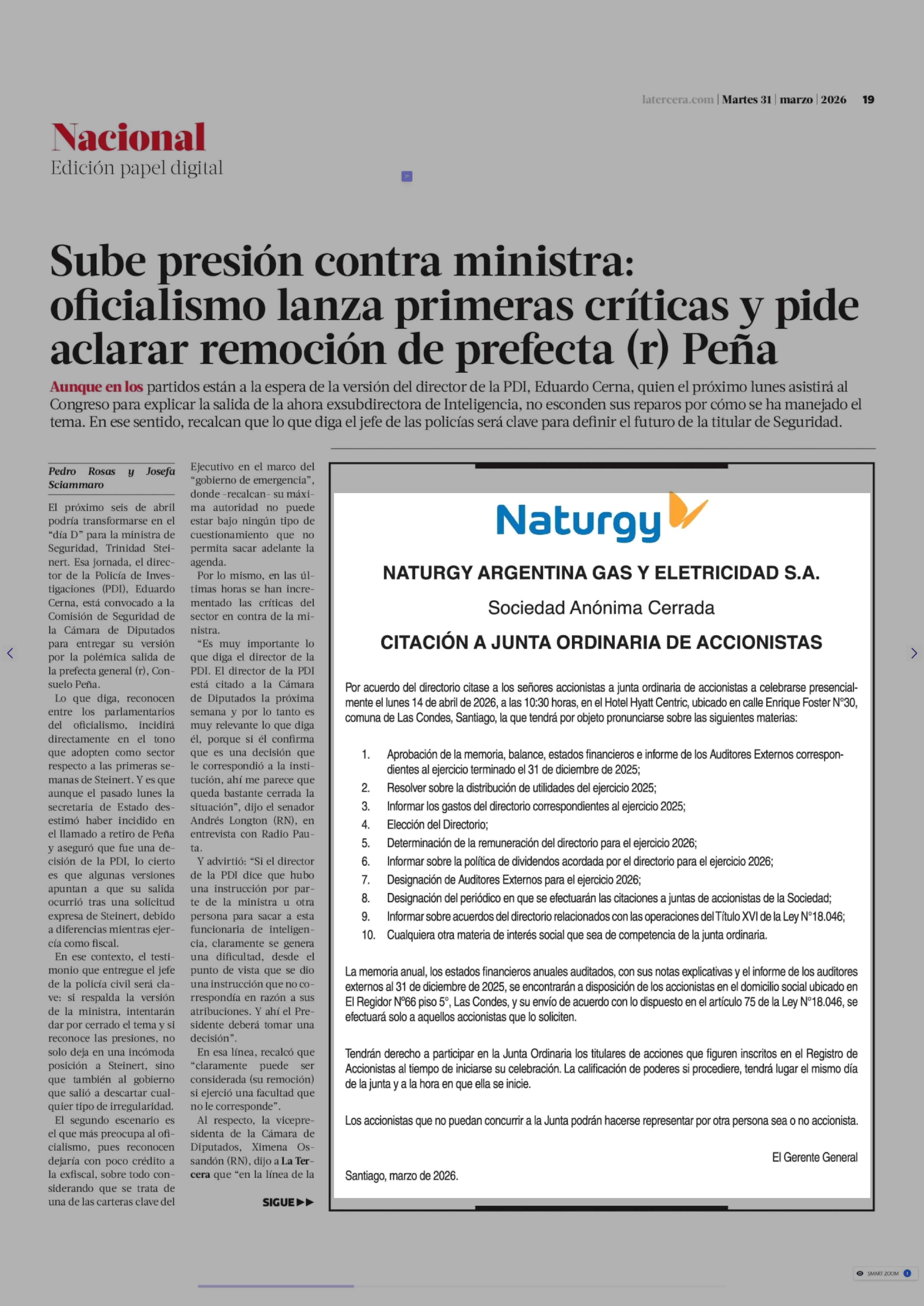Extractos: NATURGY ARGENTINA GAS Y ELETRICIDAD S.A. 31-03-2026 La Tercera |