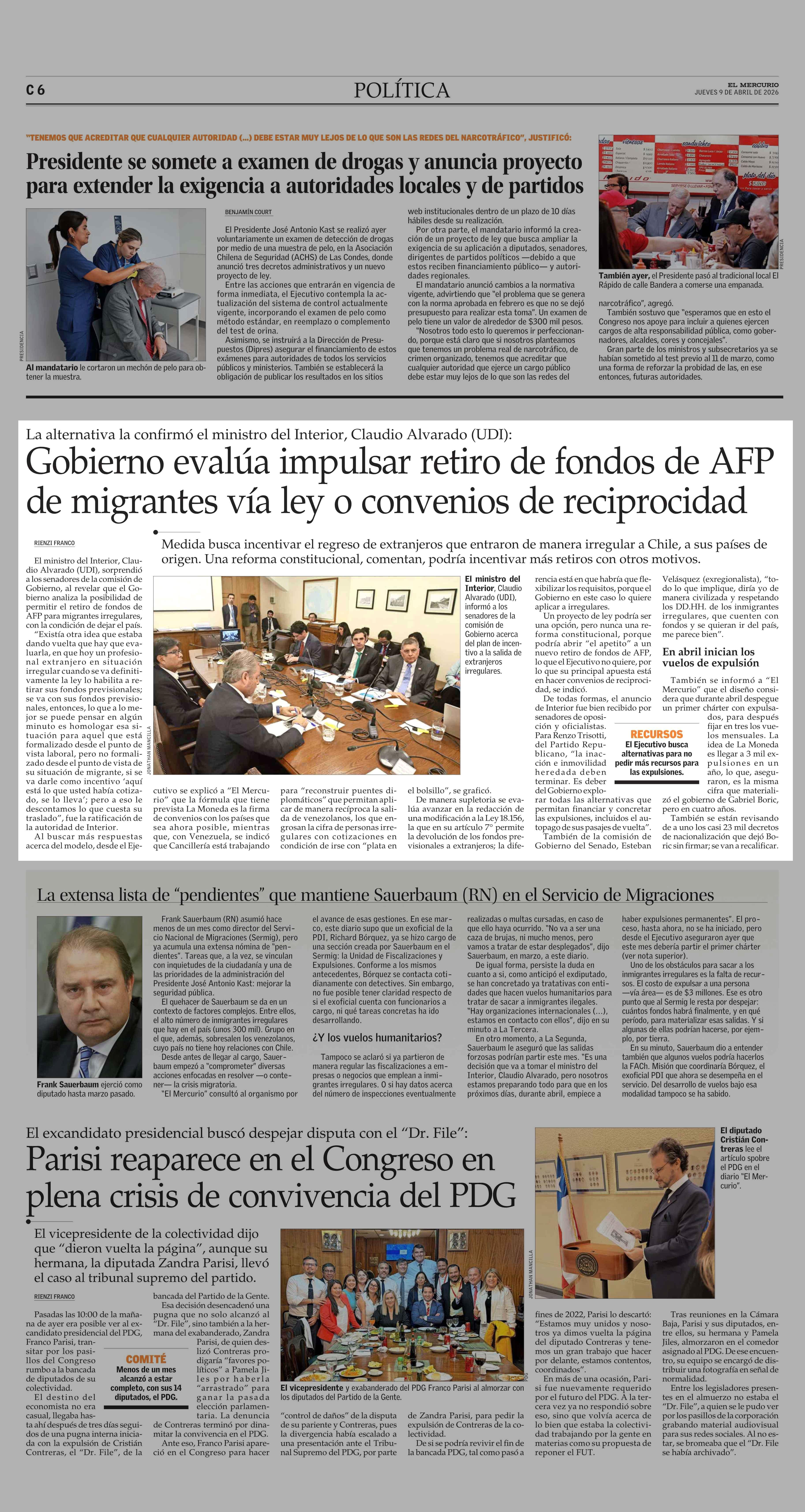 Gobierno evalúa impulsar retiro de fondos de AFP de migrantes vía ley o convenios de reciprocidad 09-04-2026 El Mercurio |
