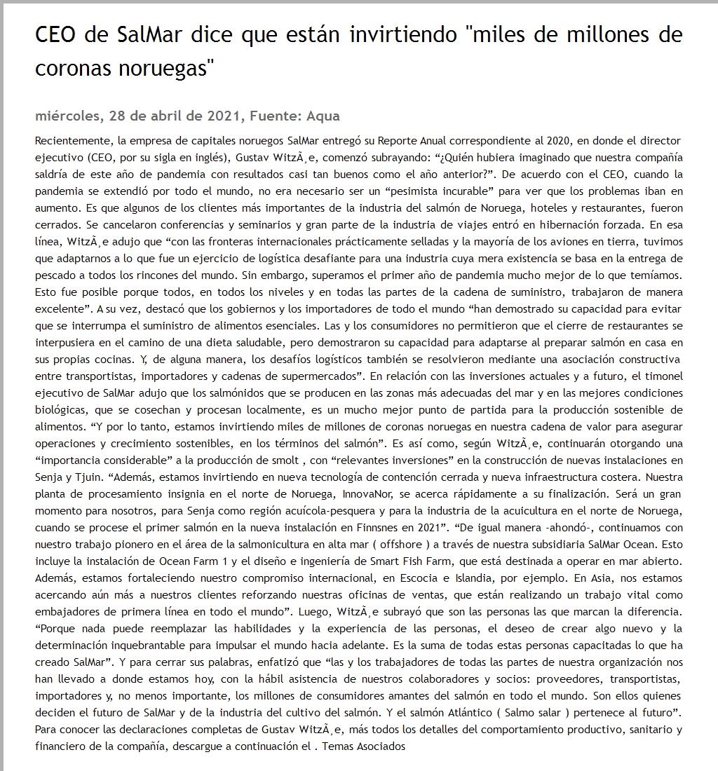 CEO de SalMar dice que están invirtiendo "miles de millones de coronas noruegas" 28-04-2021 Aqua.cl - Chile |