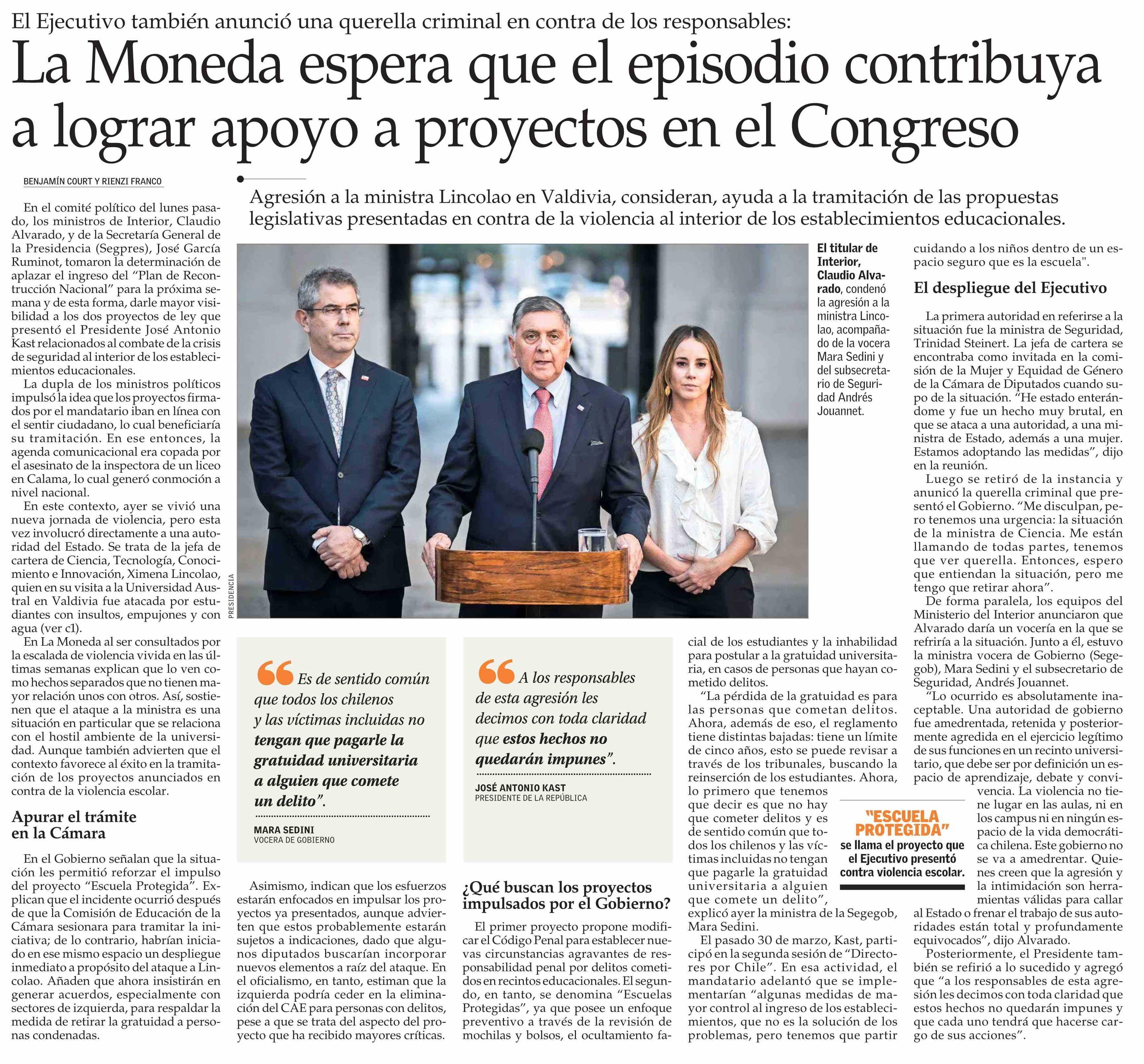 La Moneda espera que el episodio contribuya a lograr apoyo a proyectos en el Congreso 09-04-2026 El Mercurio |