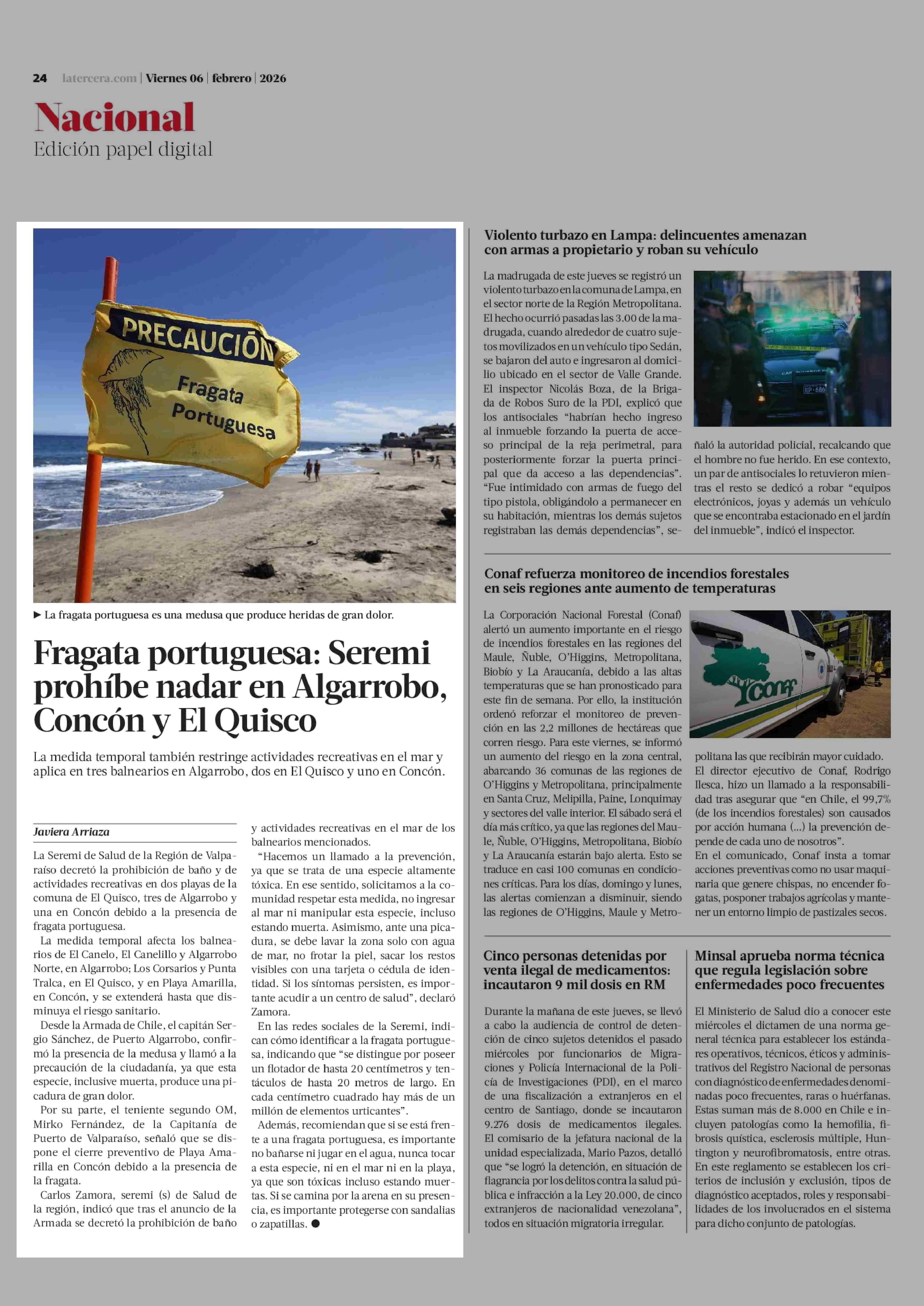 Título: Fragata portuguesa: Seremi prohíbe nadar en Algarrobo. Concón y El Quisco