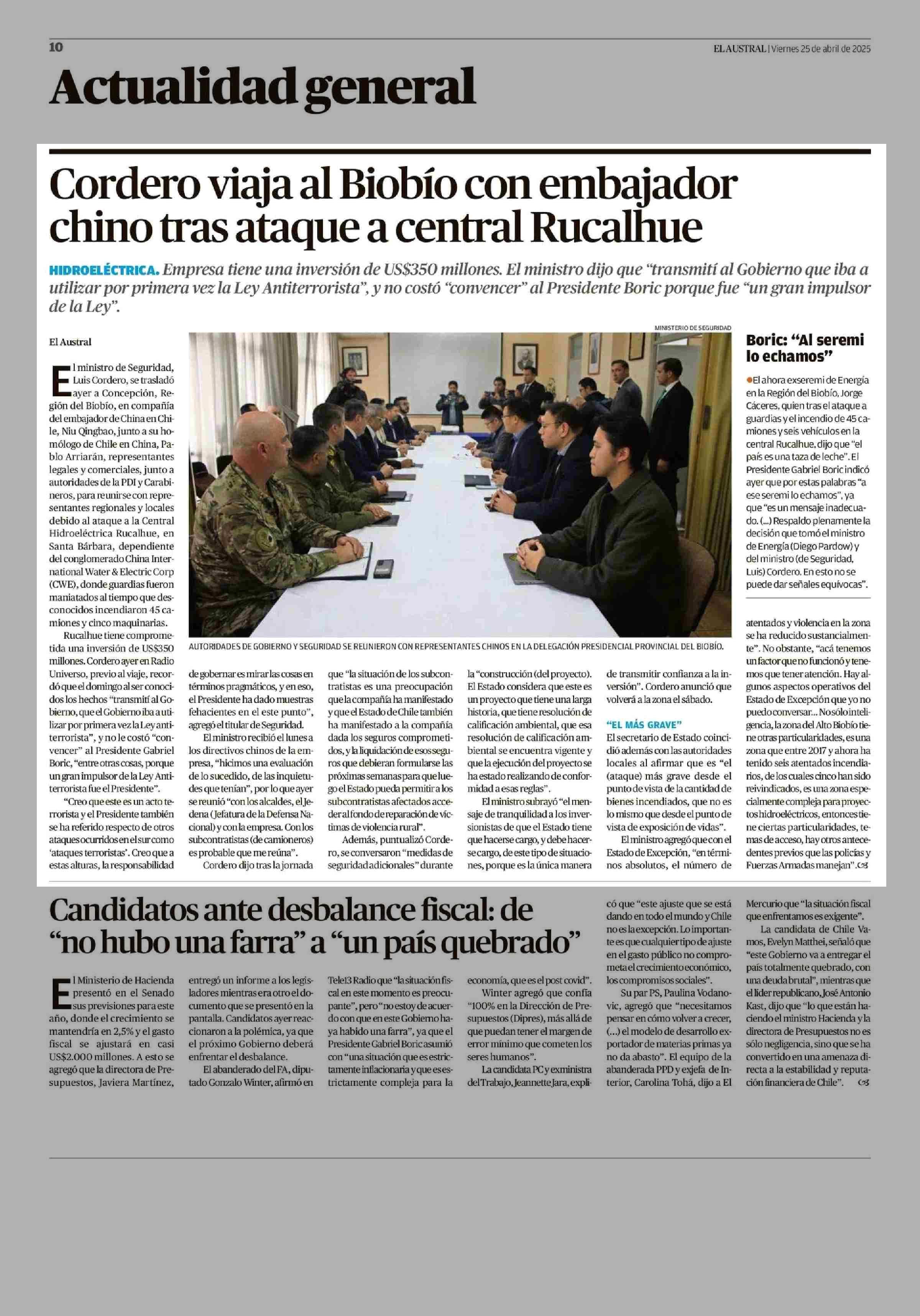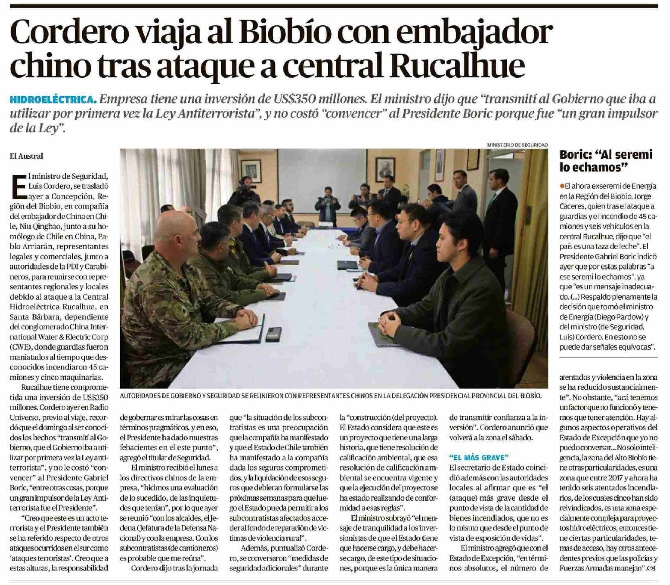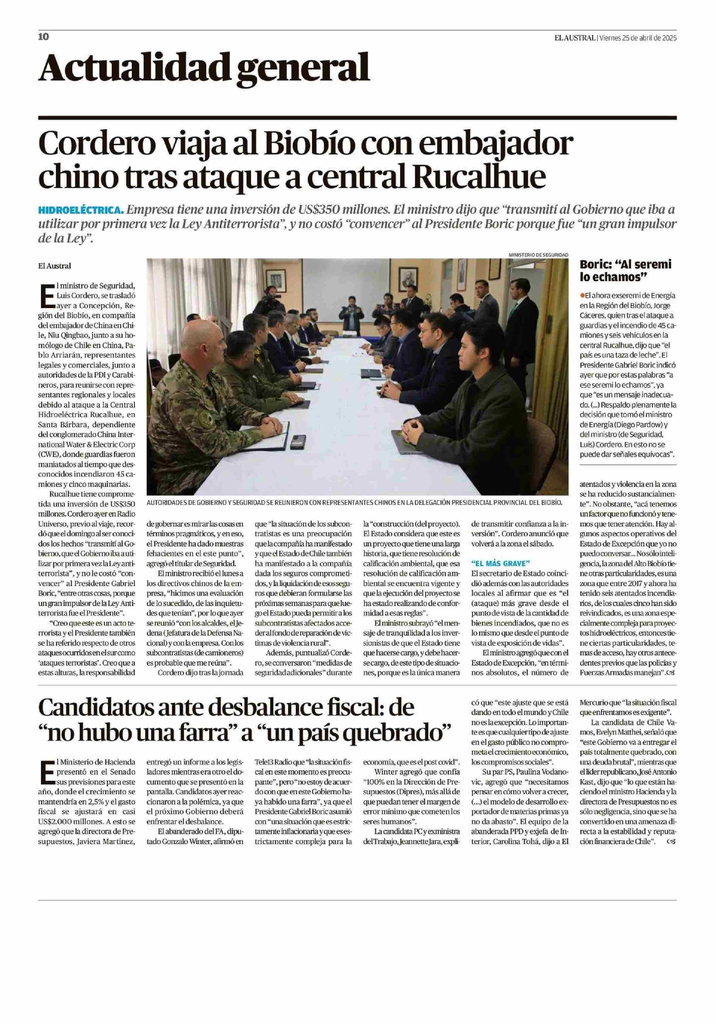 Cordero viaja al Biobío con embajador chino tras ataque a central Rucalhue 25-04-2025 El Austral de la Araucanía |