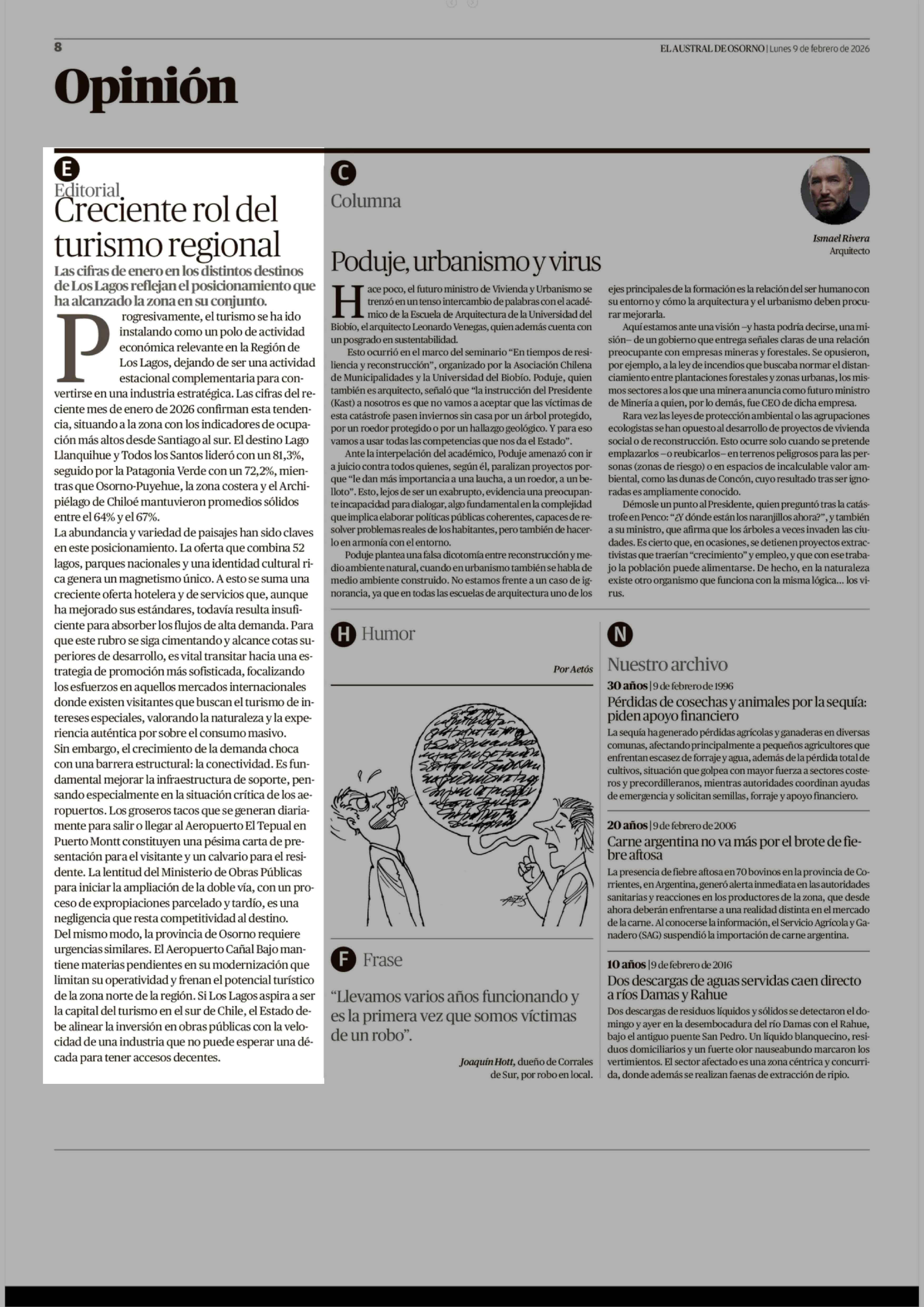 Editorial: Creciente rol del turismo regional 09-02-2026 El Austral de Osorno |