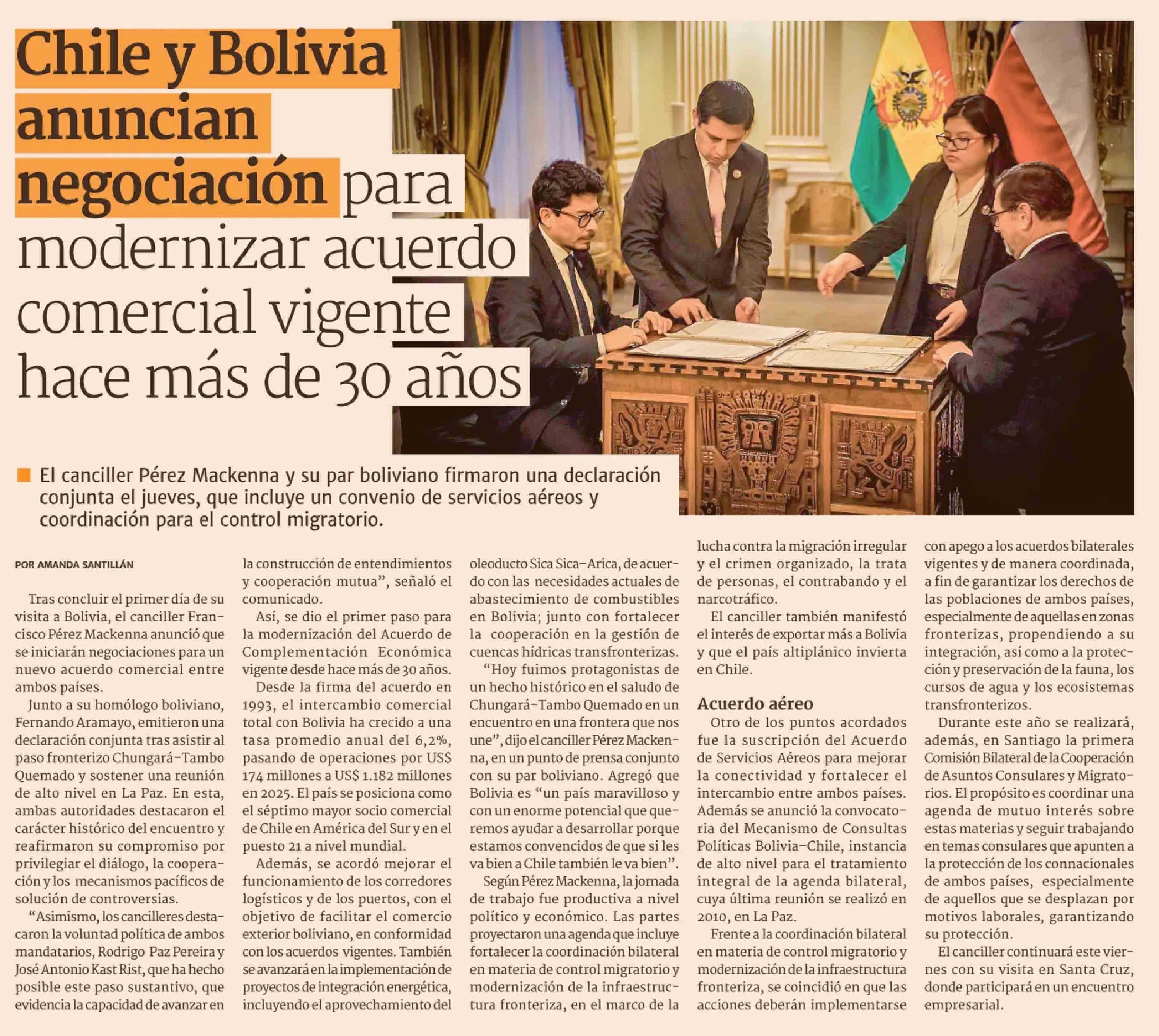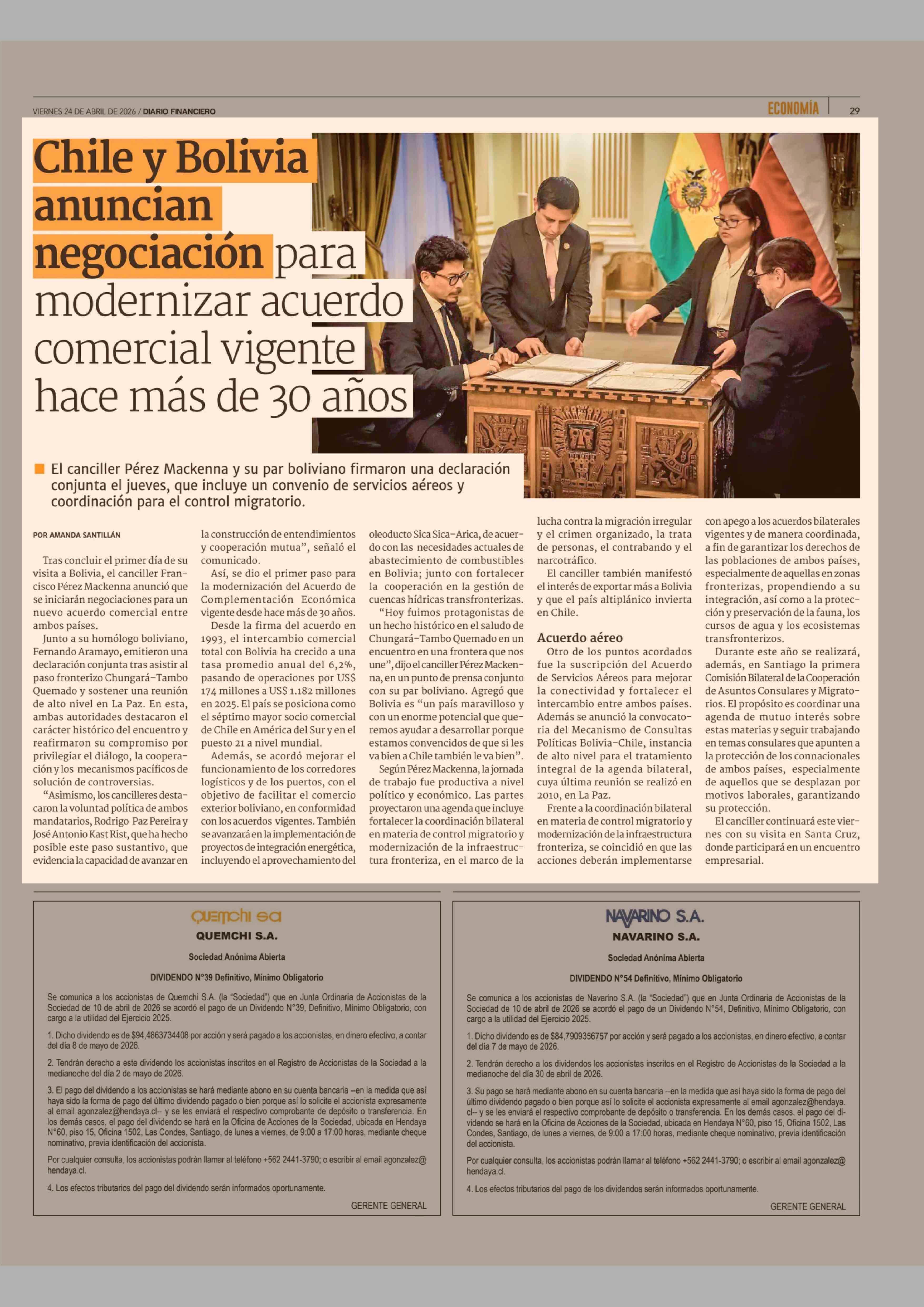 Chile y Bolivia anuncian negociación para modernizar acuerdo comercial vigente hace más de 30 años 24-04-2026 Diario Financiero |