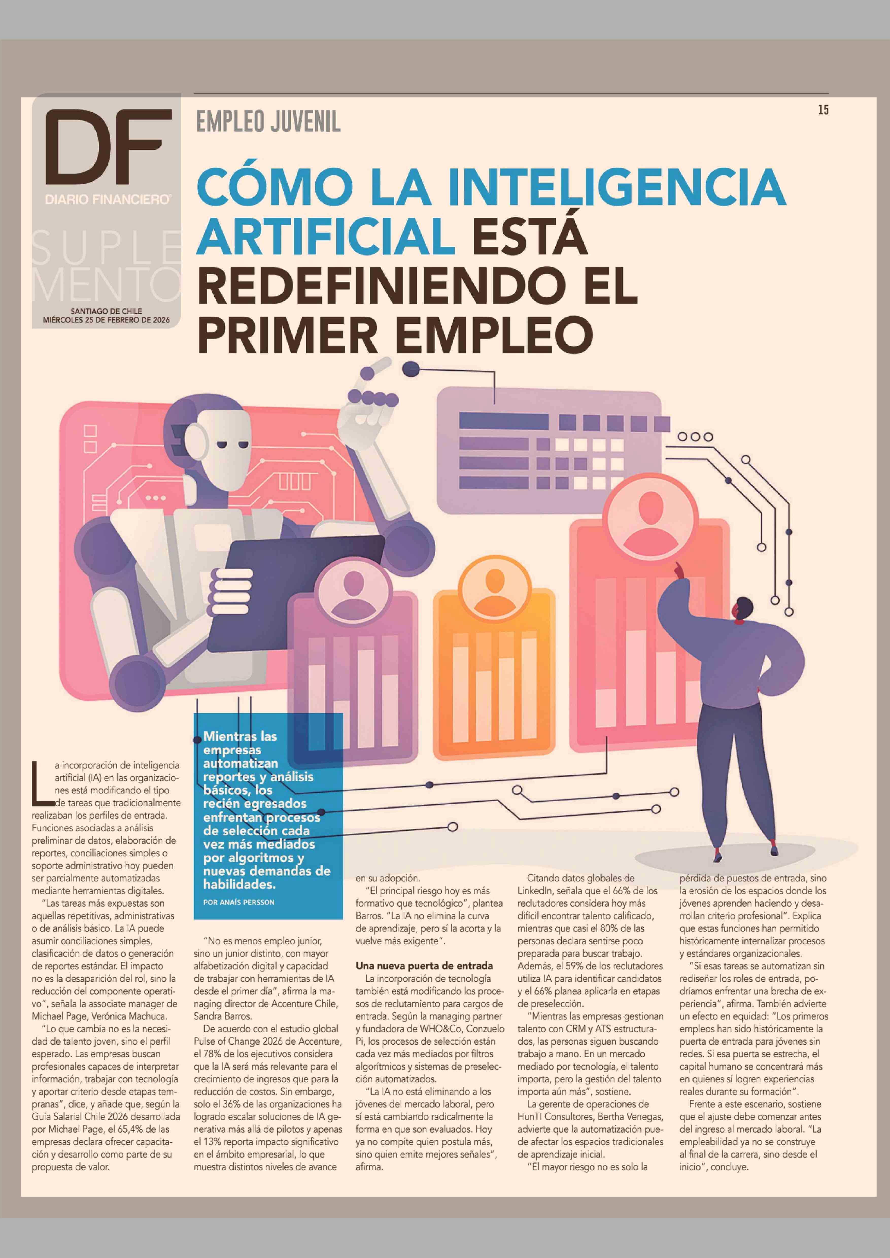 CÓMO LA INTELIGENCIA ARTIFICIAL ESTÁ REDEFINIENDO EL PRIMER EMPLEO 25-02-2026 Diario Financiero |