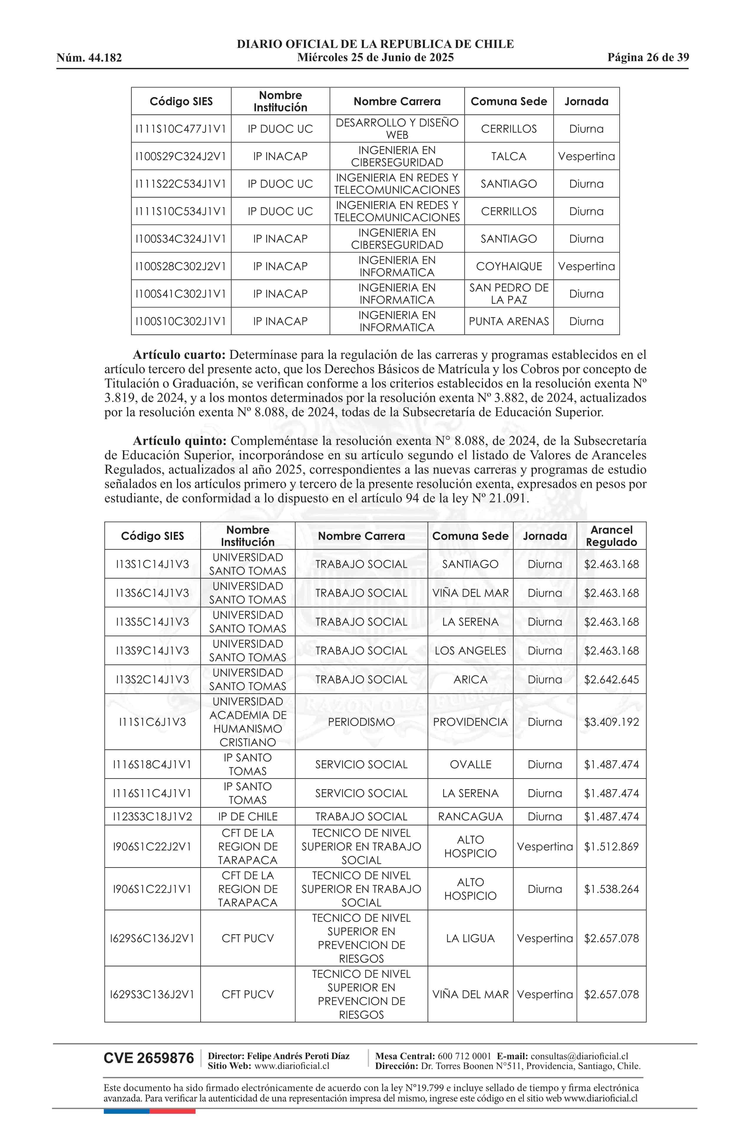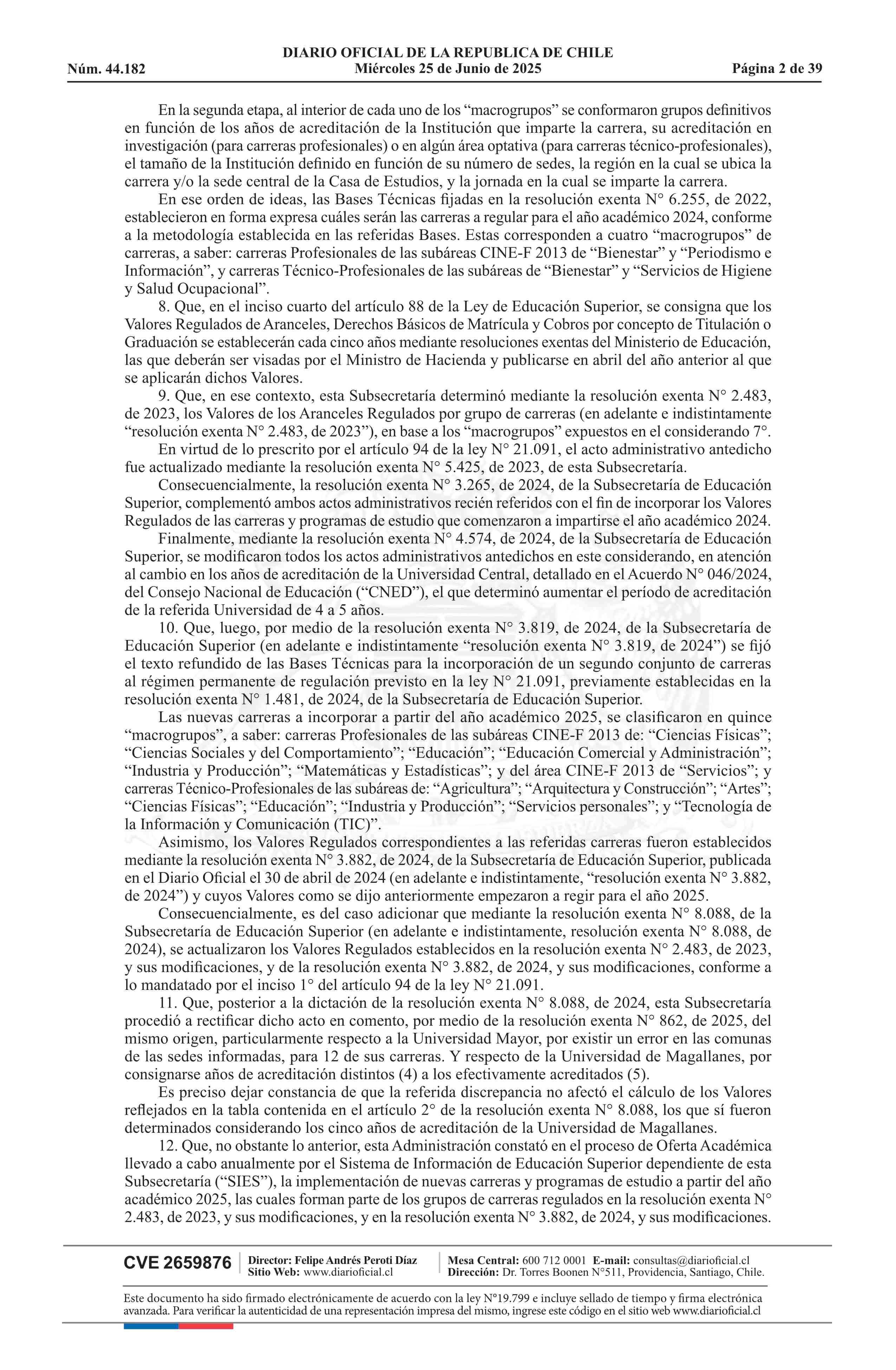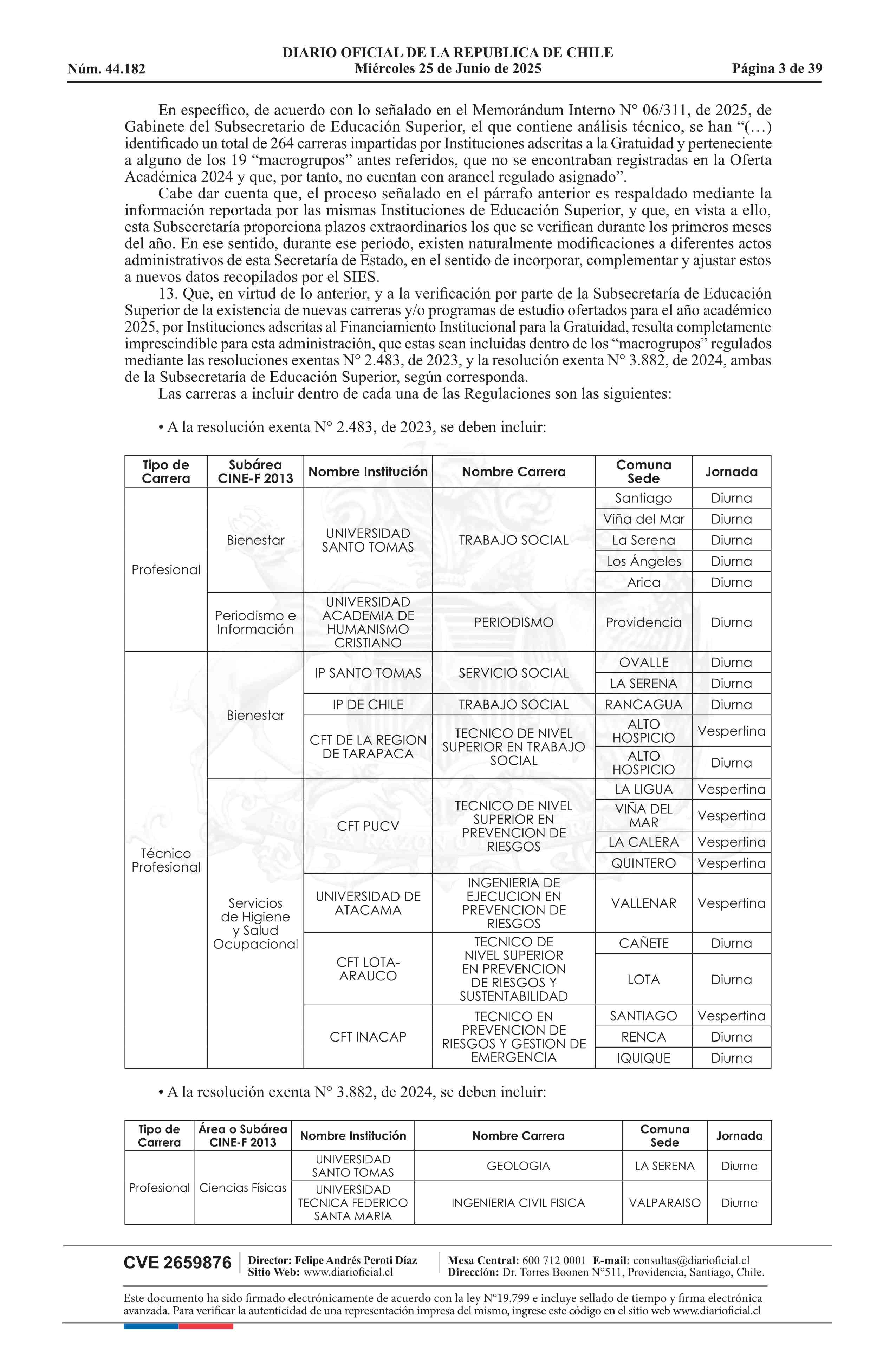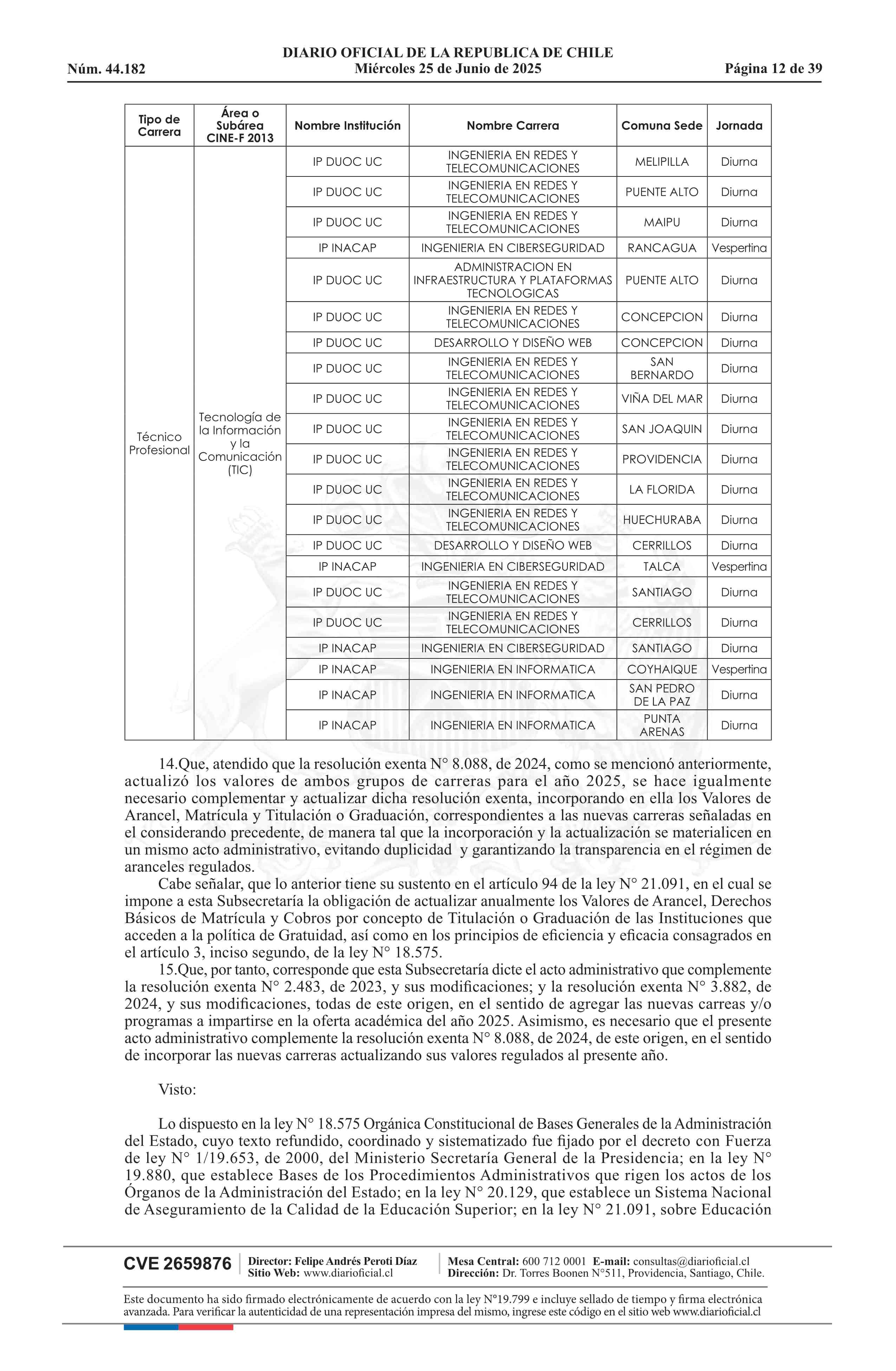 Título: Resolución exenta número 7.182, de 2025.- Complementa las resoluciones exentas N°s. 2.483, de 2023, y sus modificaciones; 3.882, de 2024, y sus modificaciones, y 8.088, de 2024, y sus modificaciones, incorporando los valores regulados de las carreras y programas de estudio que comienzan a impartirse