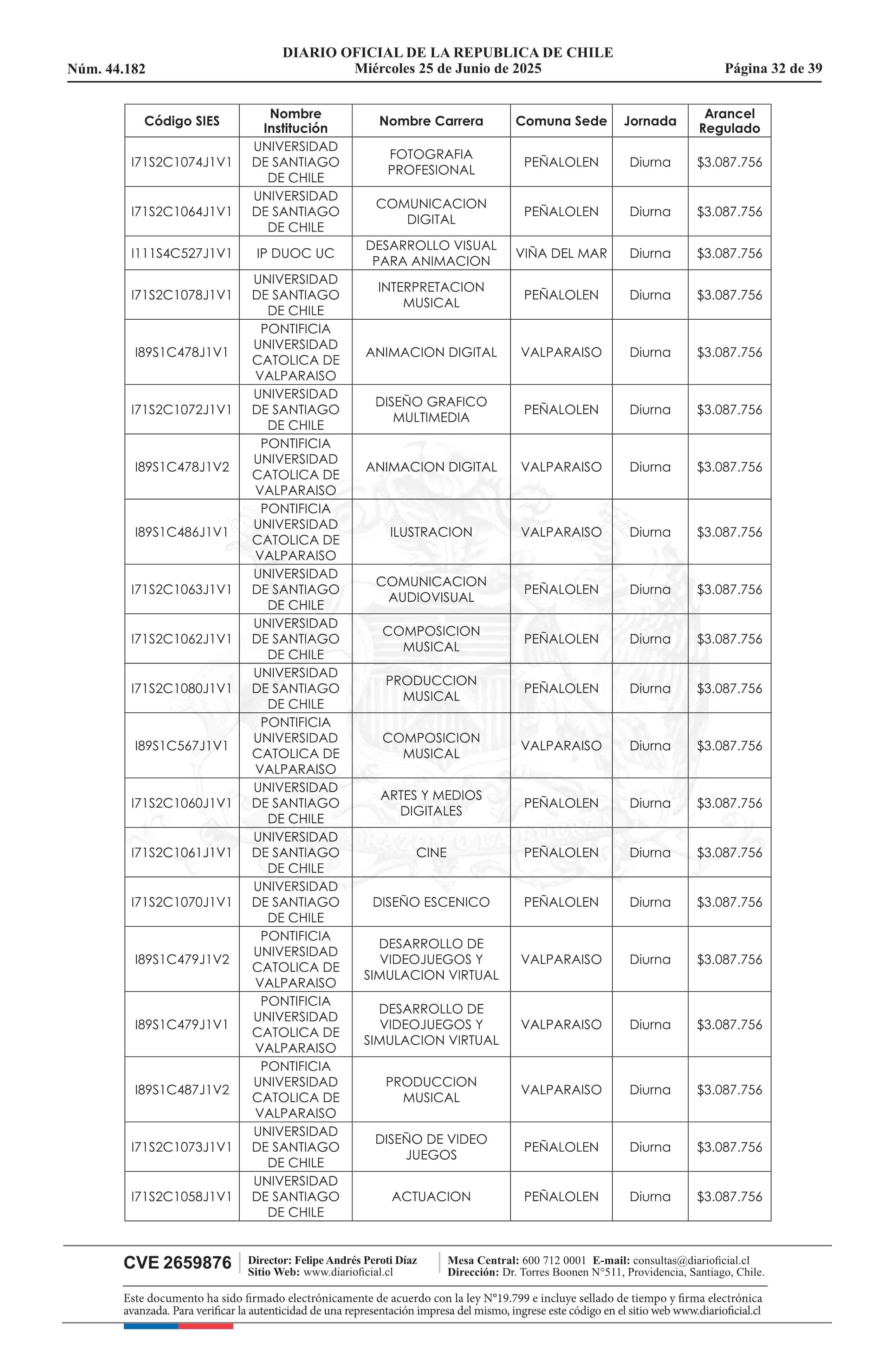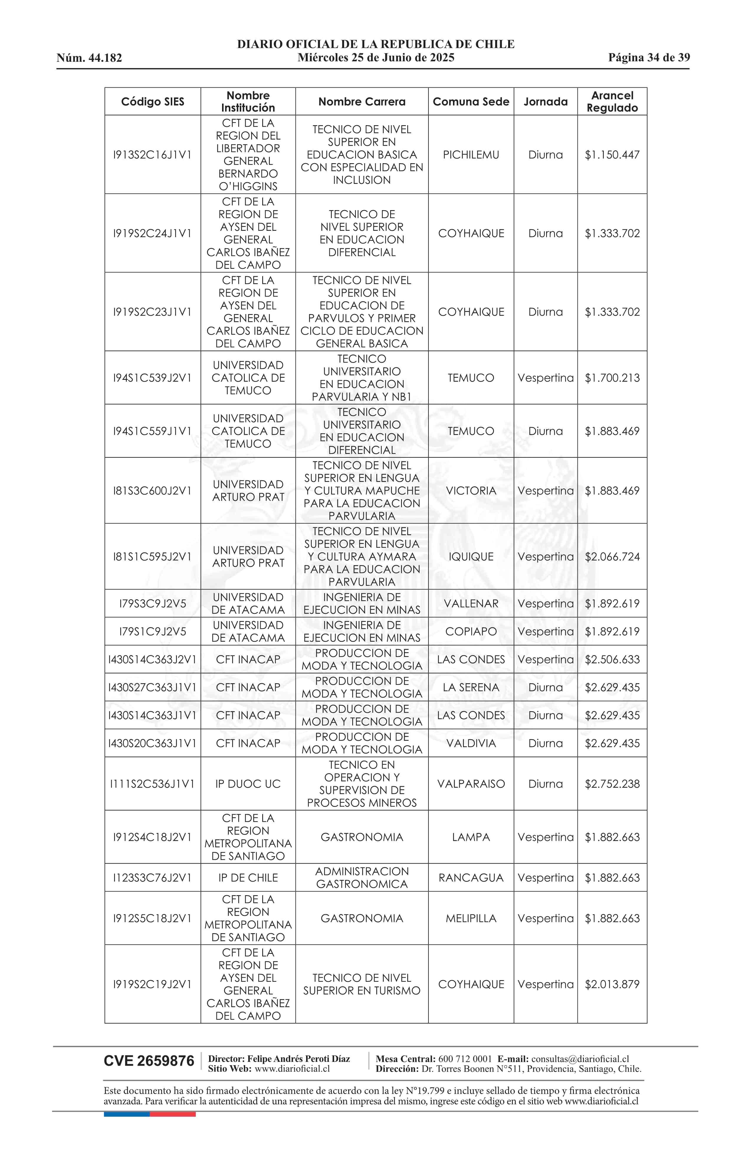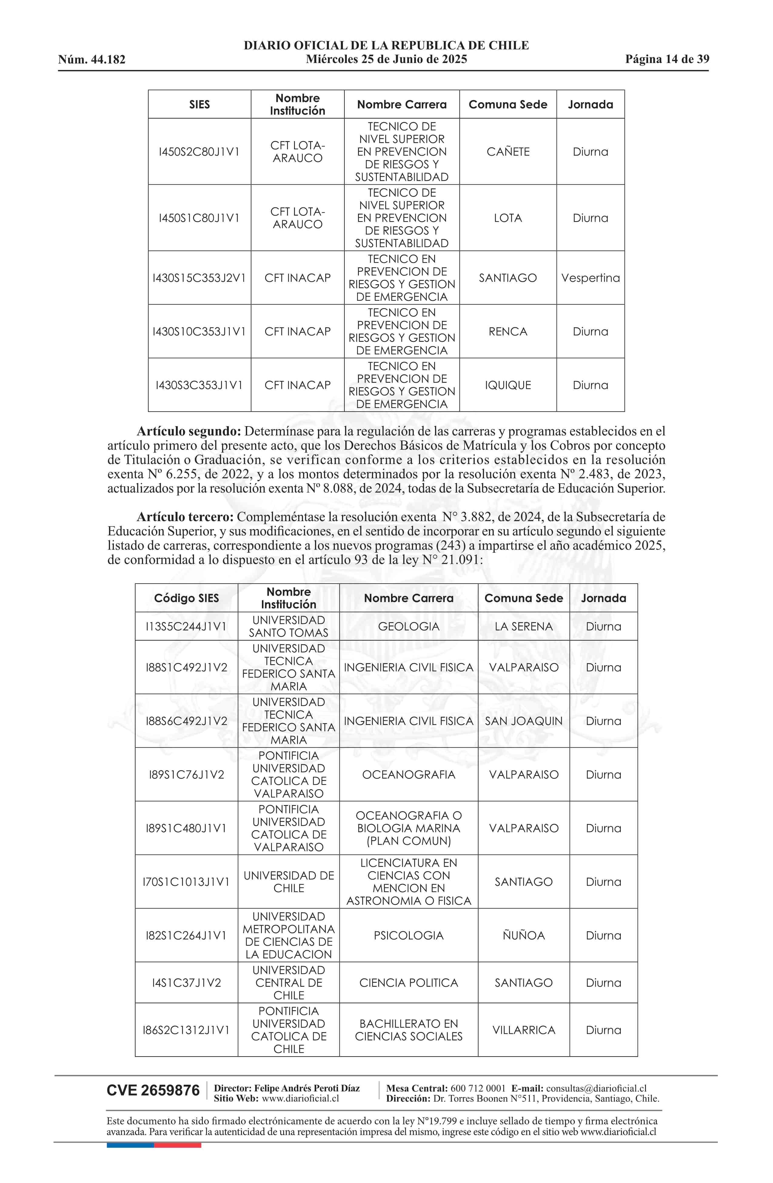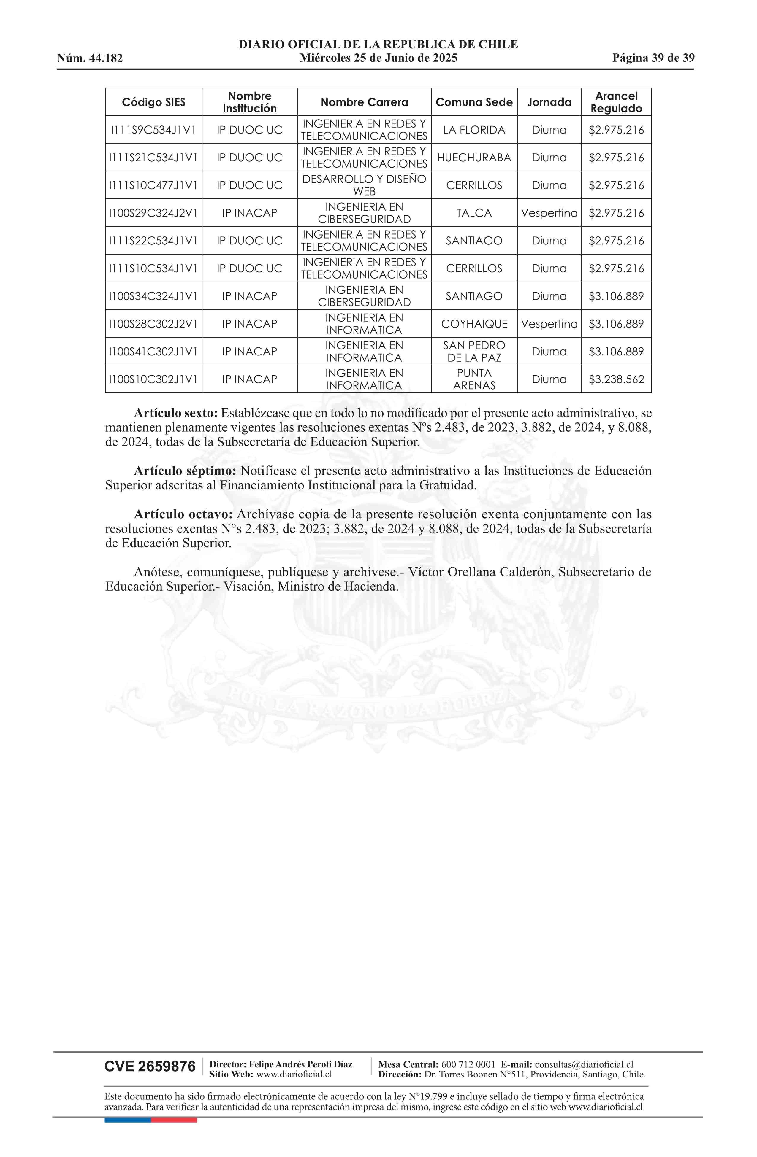 Título: Resolución exenta número 7.182, de 2025.- Complementa las resoluciones exentas N°s. 2.483, de 2023, y sus modificaciones; 3.882, de 2024, y sus modificaciones, y 8.088, de 2024, y sus modificaciones, incorporando los valores regulados de las carreras y programas de estudio que comienzan a impartirse