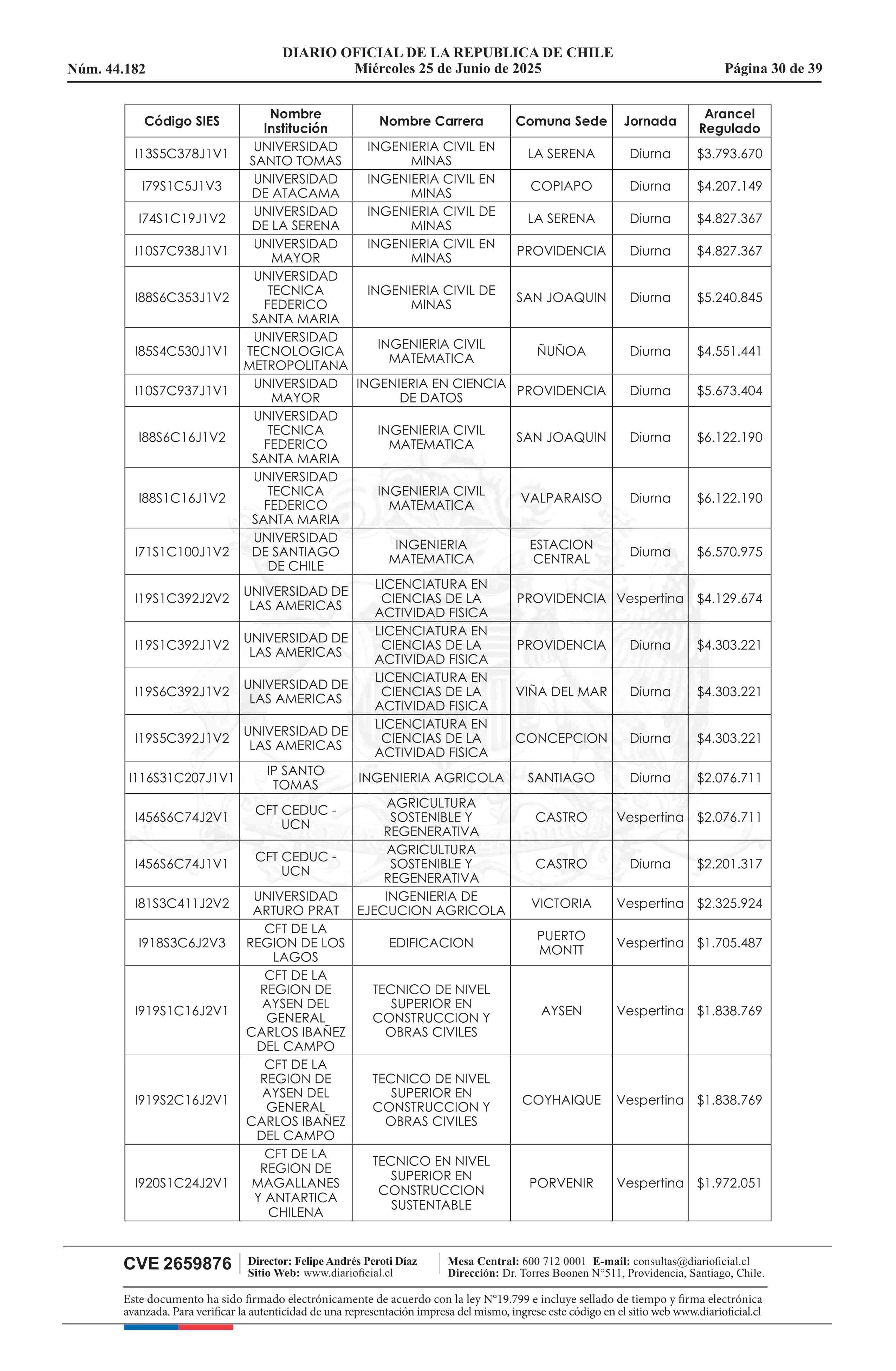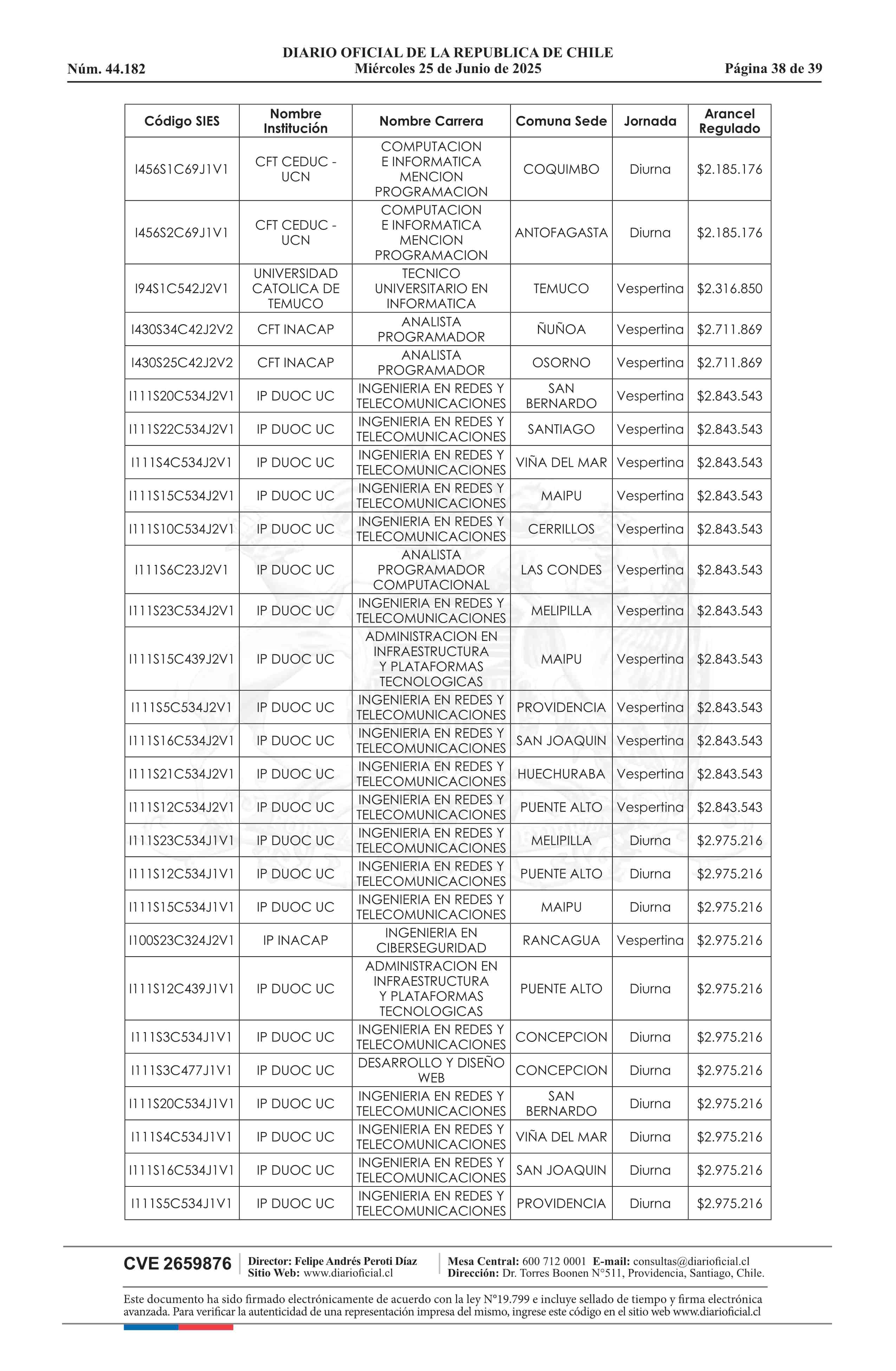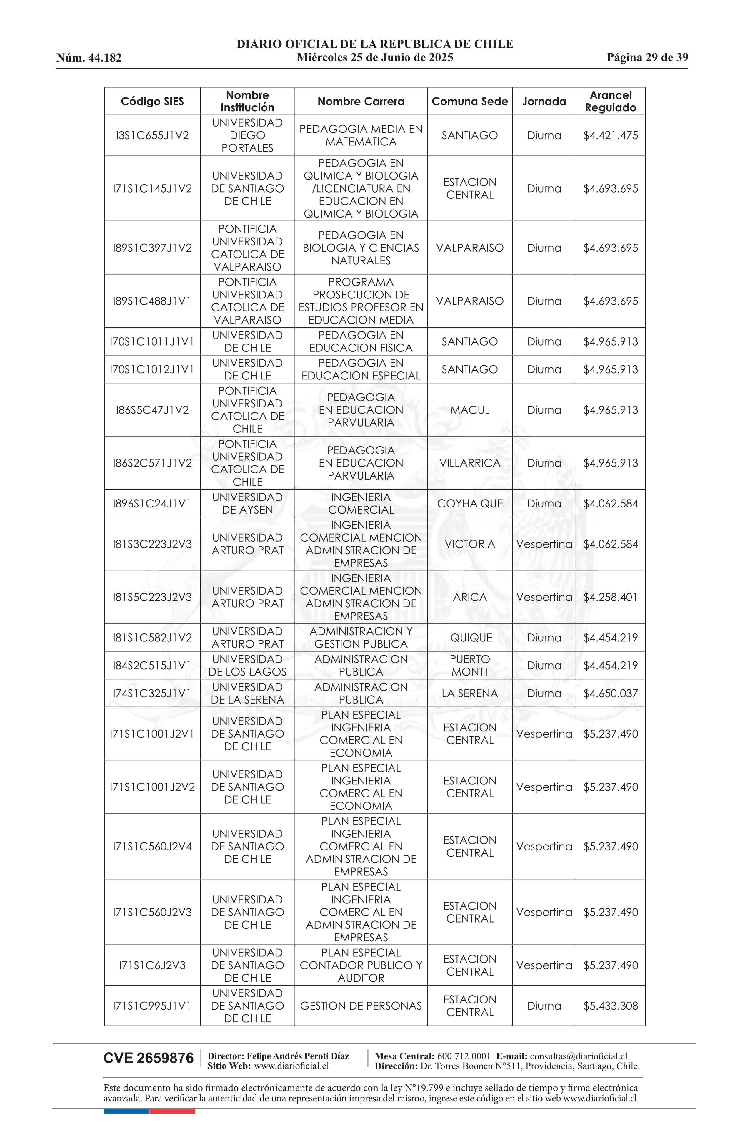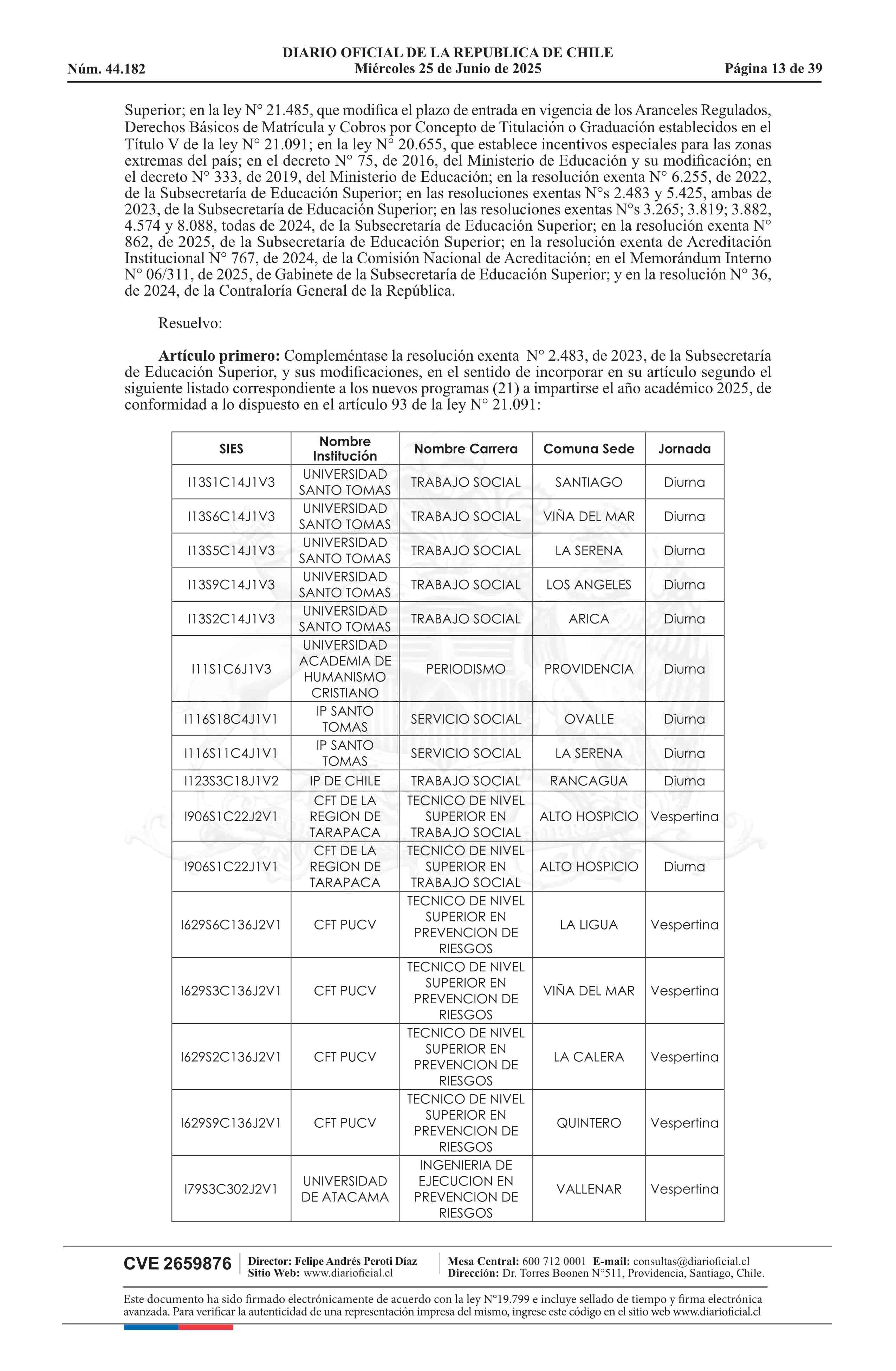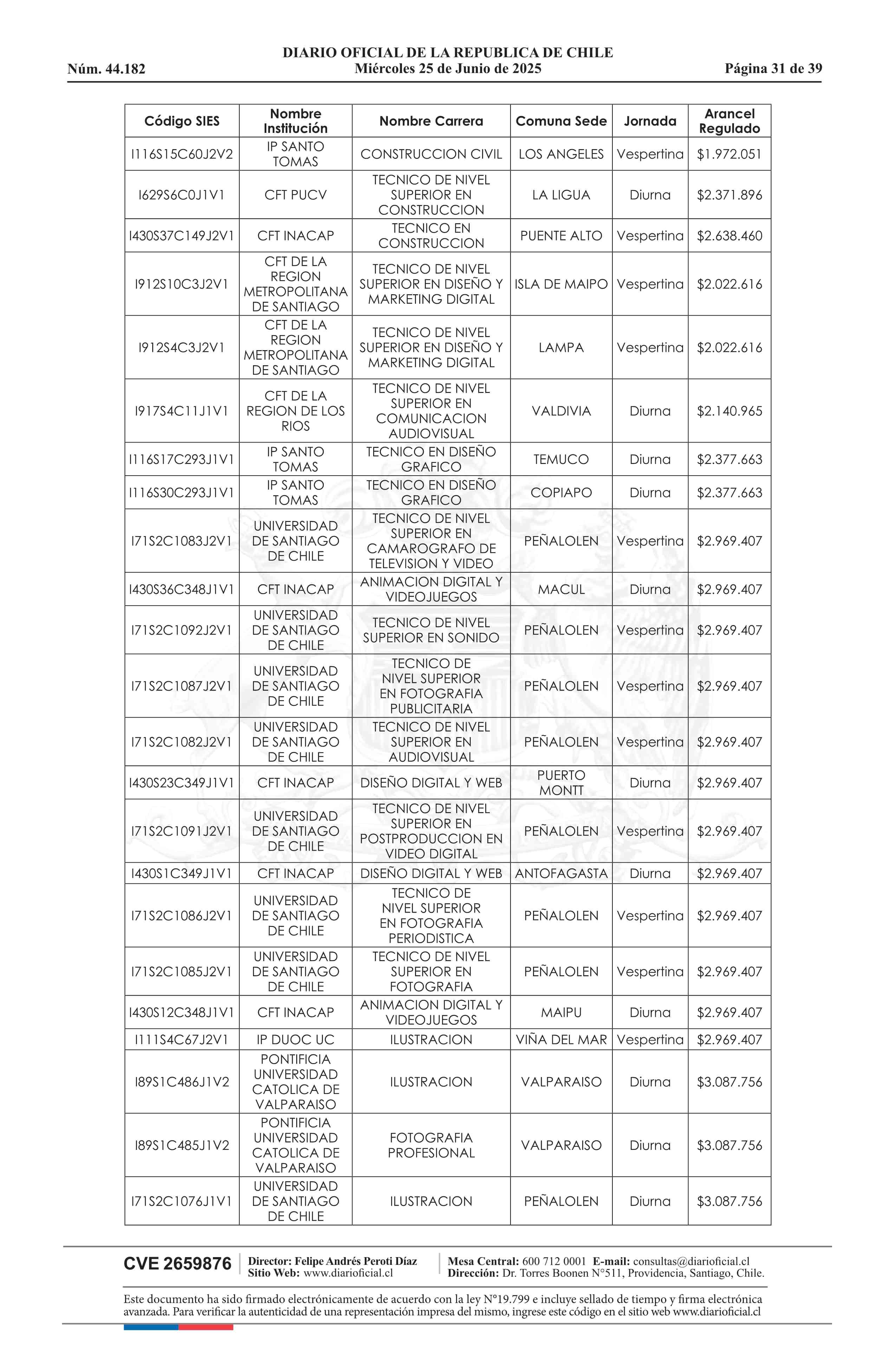 Título: Resolución exenta número 7.182, de 2025.- Complementa las resoluciones exentas N°s. 2.483, de 2023, y sus modificaciones; 3.882, de 2024, y sus modificaciones, y 8.088, de 2024, y sus modificaciones, incorporando los valores regulados de las carreras y programas de estudio que comienzan a impartirse