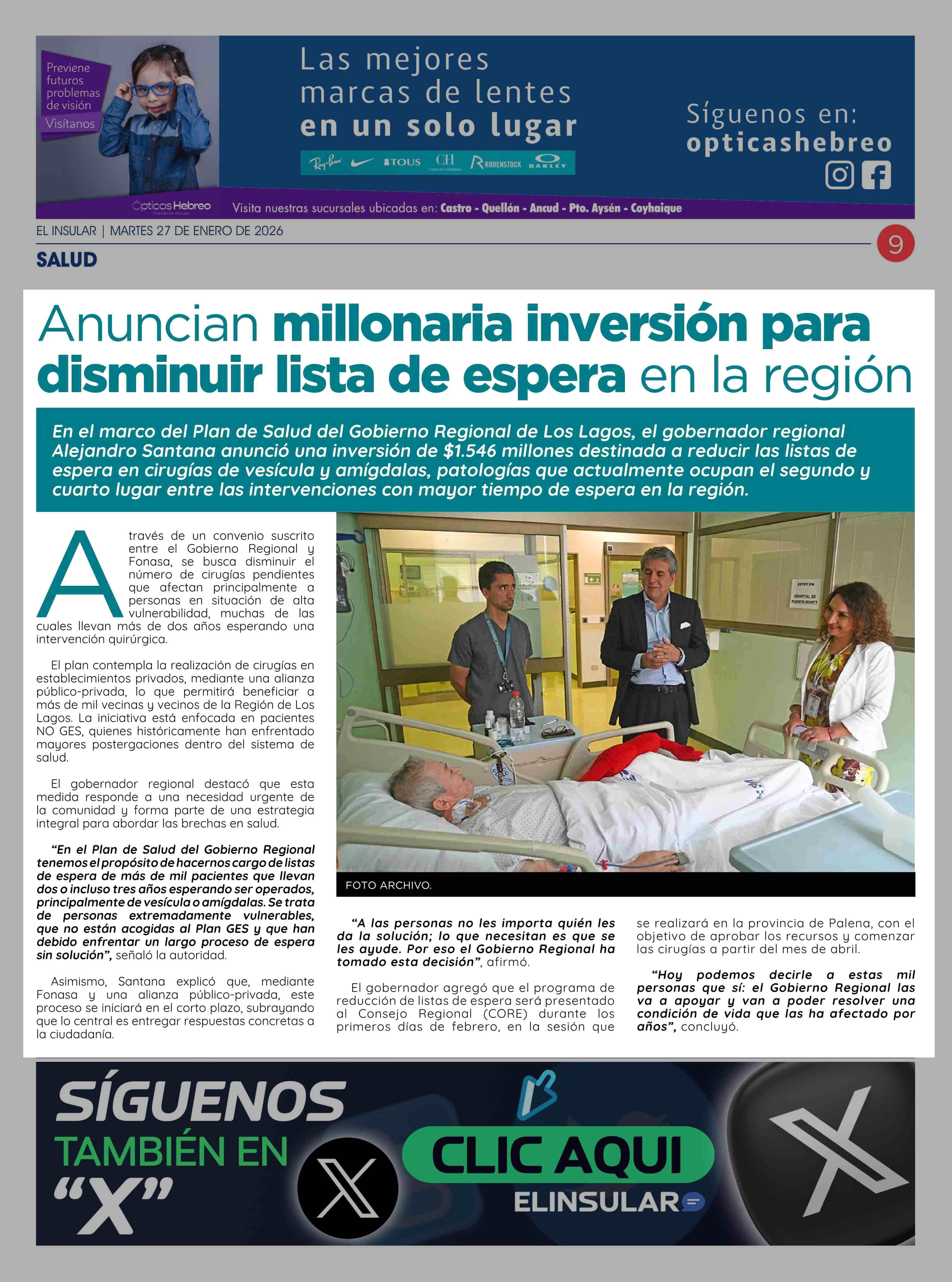 Anuncian millonaria inversión para disminuir lista de espera en la región 27-01-2026 El Insular |
