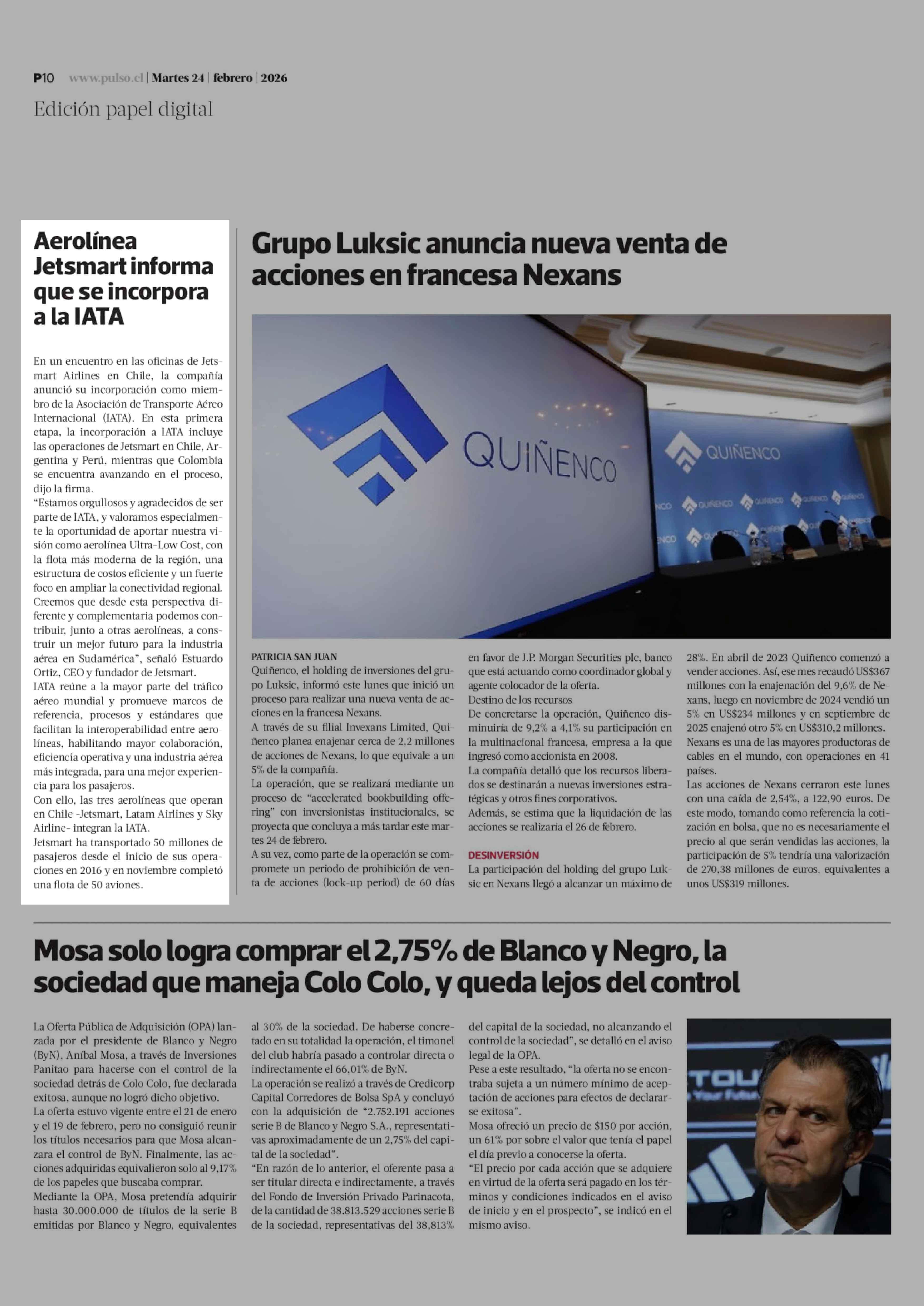 Aerolínea Jetsmart informa que se incorpora a la IATA 24-02-2026 La Tercera |