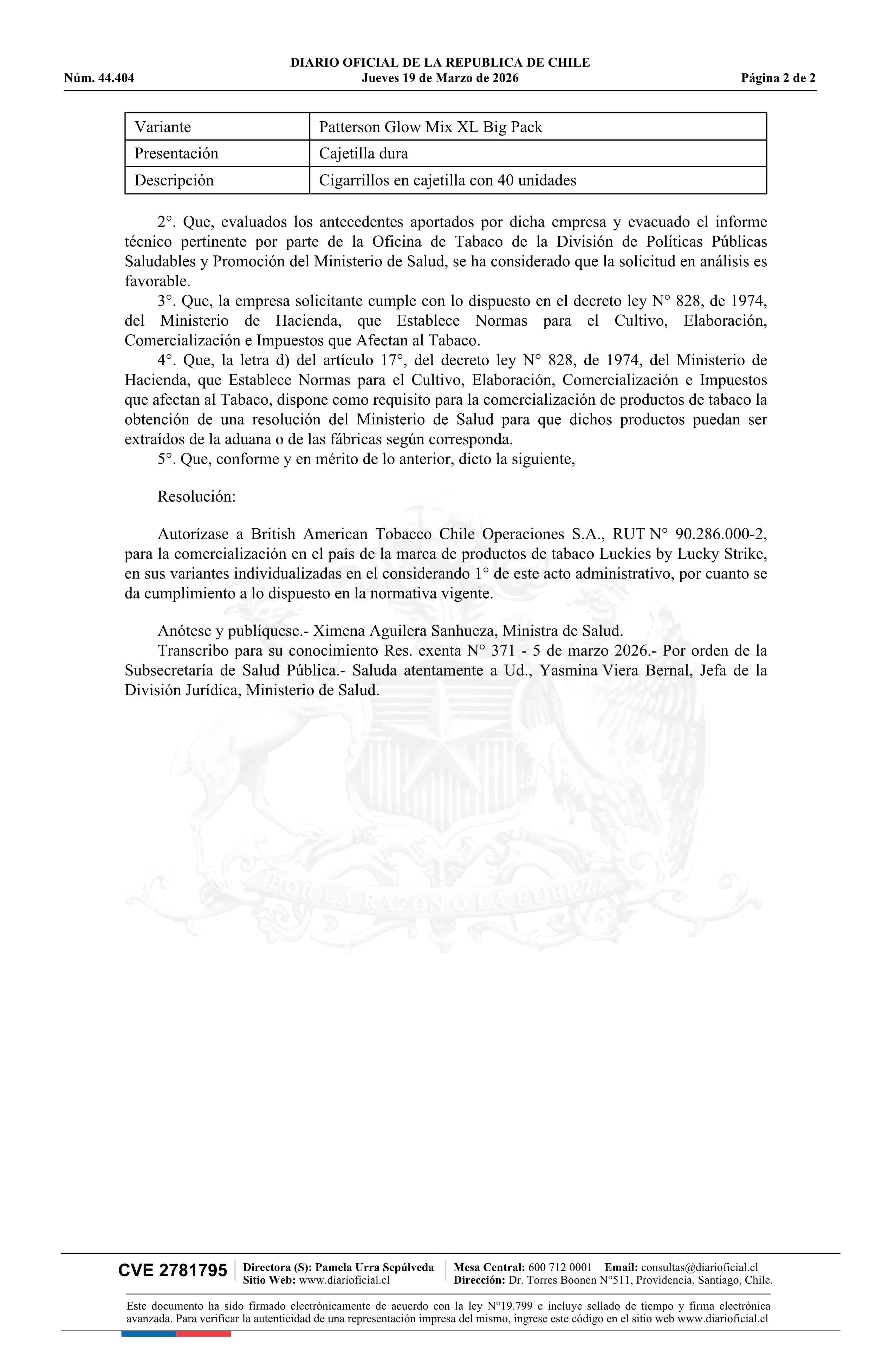 Título: Resolución exenta número 371, de 2026.- Autoriza comercialización de productos de tabaco que indica comercializados por British American Tobacco Chile Operaciones S.A.