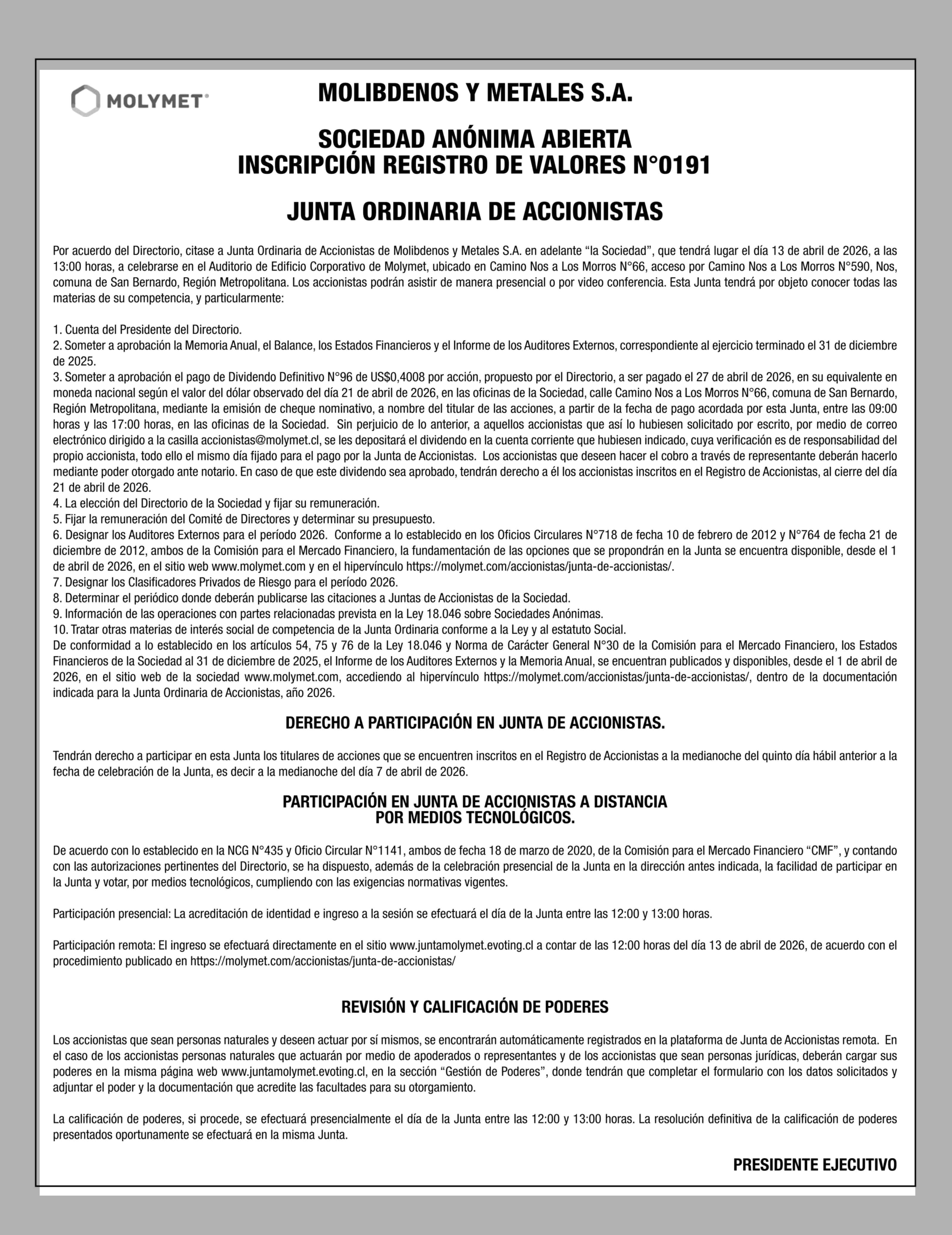 Título: MOLIBDENOS Y METALES S.A.