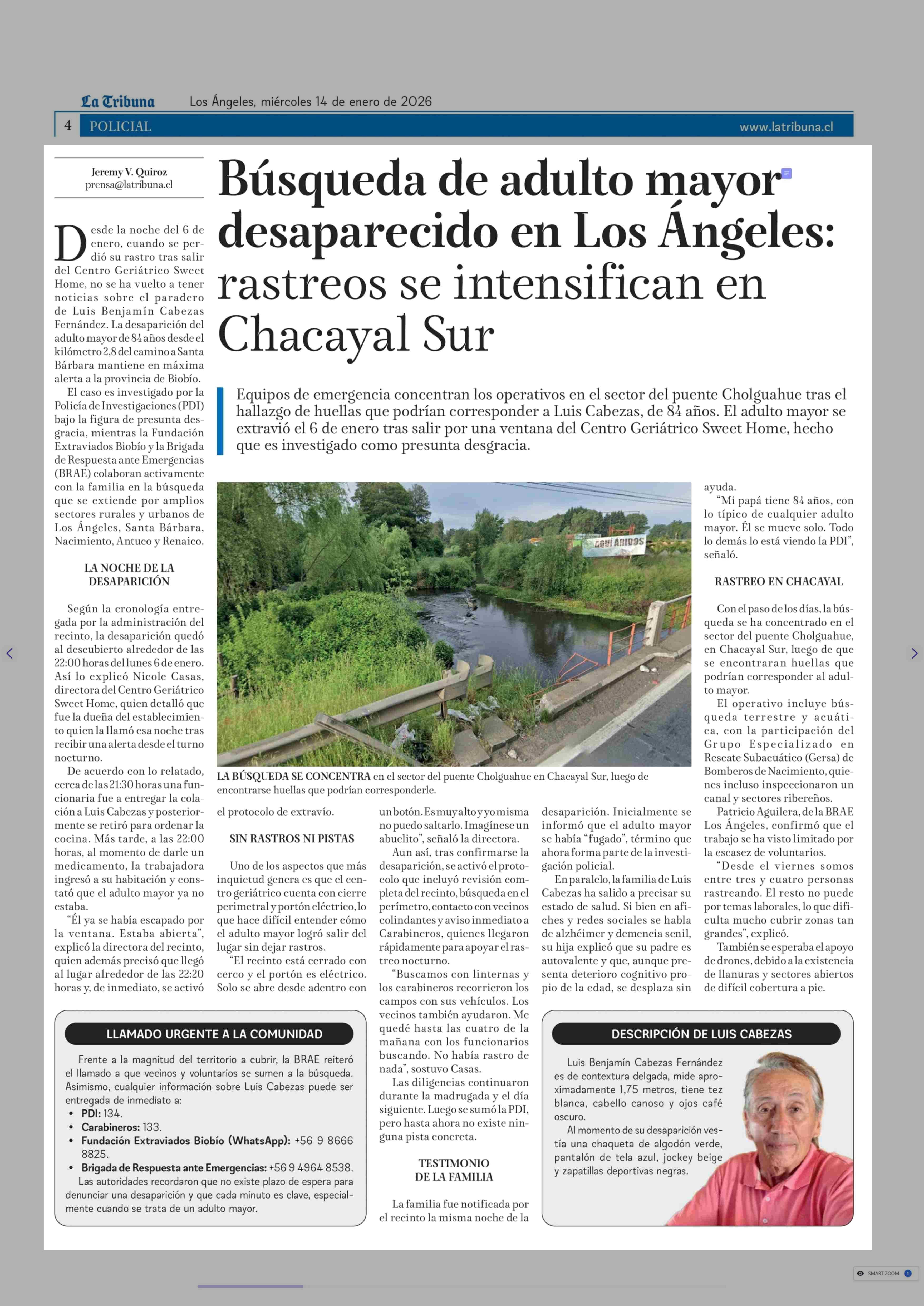 Título: Búsqueda de adulto mayor desaparecido en Los Ángeles: rastreos se intensifican en Chacayal Sur