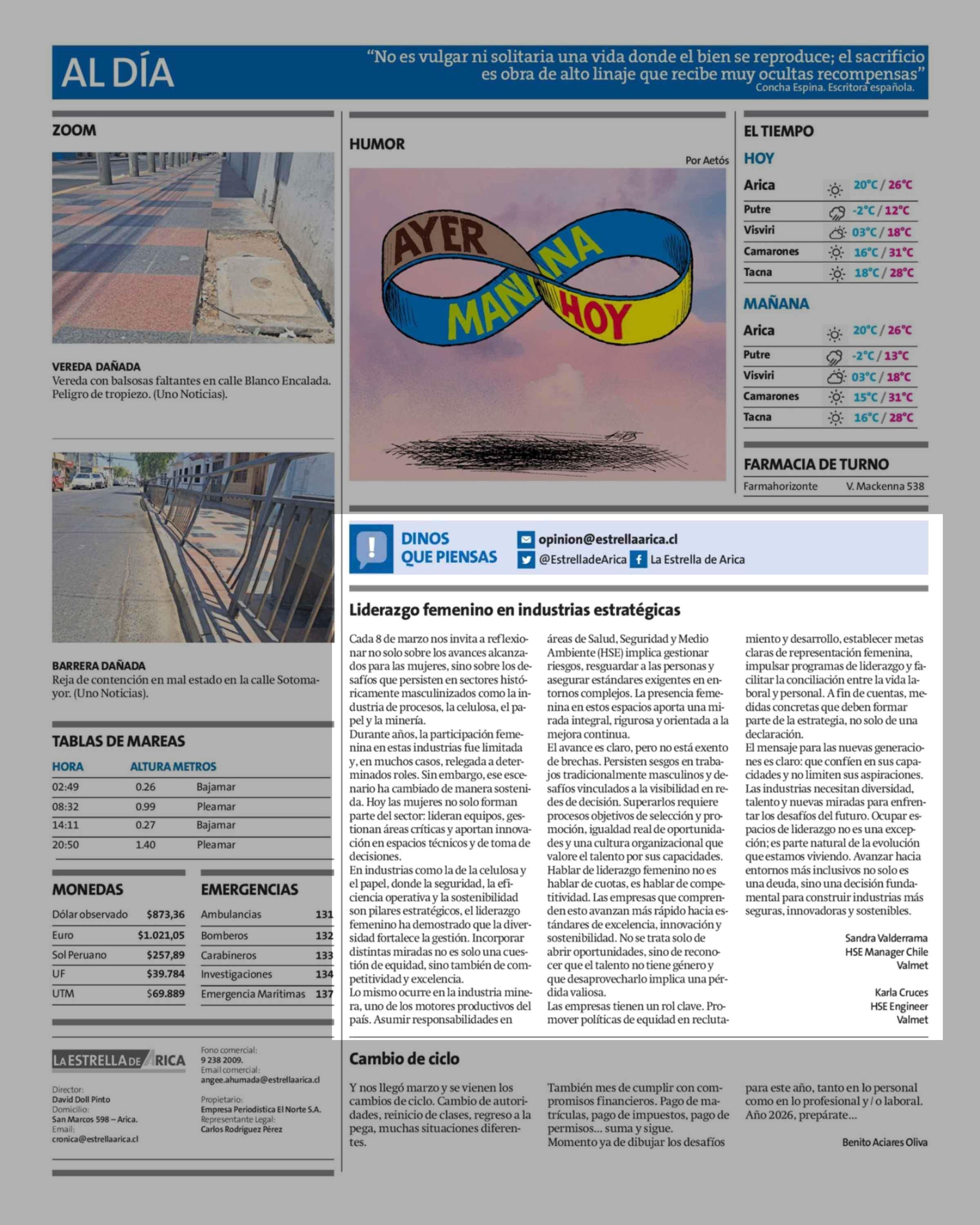 Cartas: Liderazgo femenino en industrias estratégicas 02-03-2026 La Estrella de Arica |