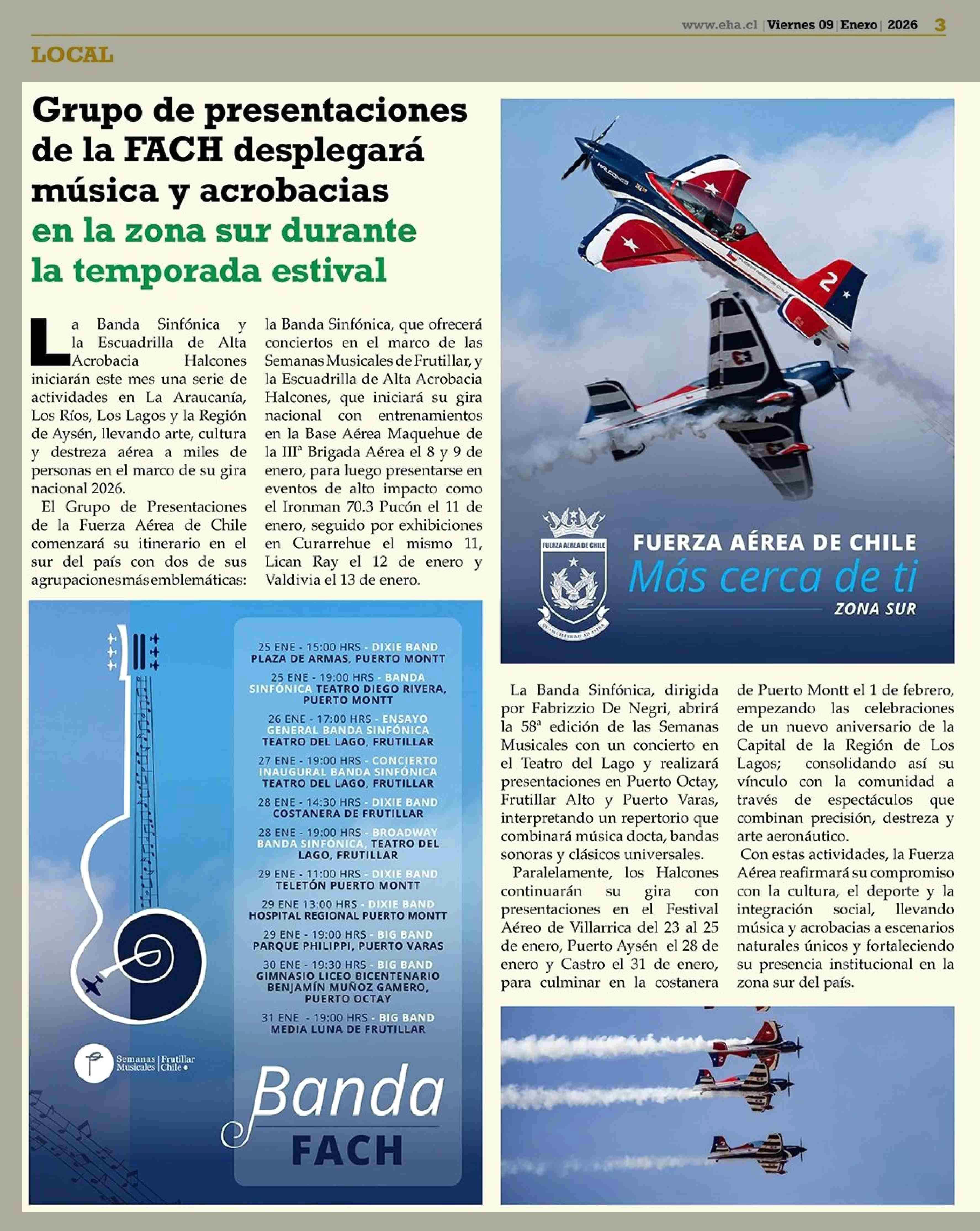 Título: Grupo de presentaciones de la FACH desplegará música y acrobacias en la zona sur durante la temporada estival