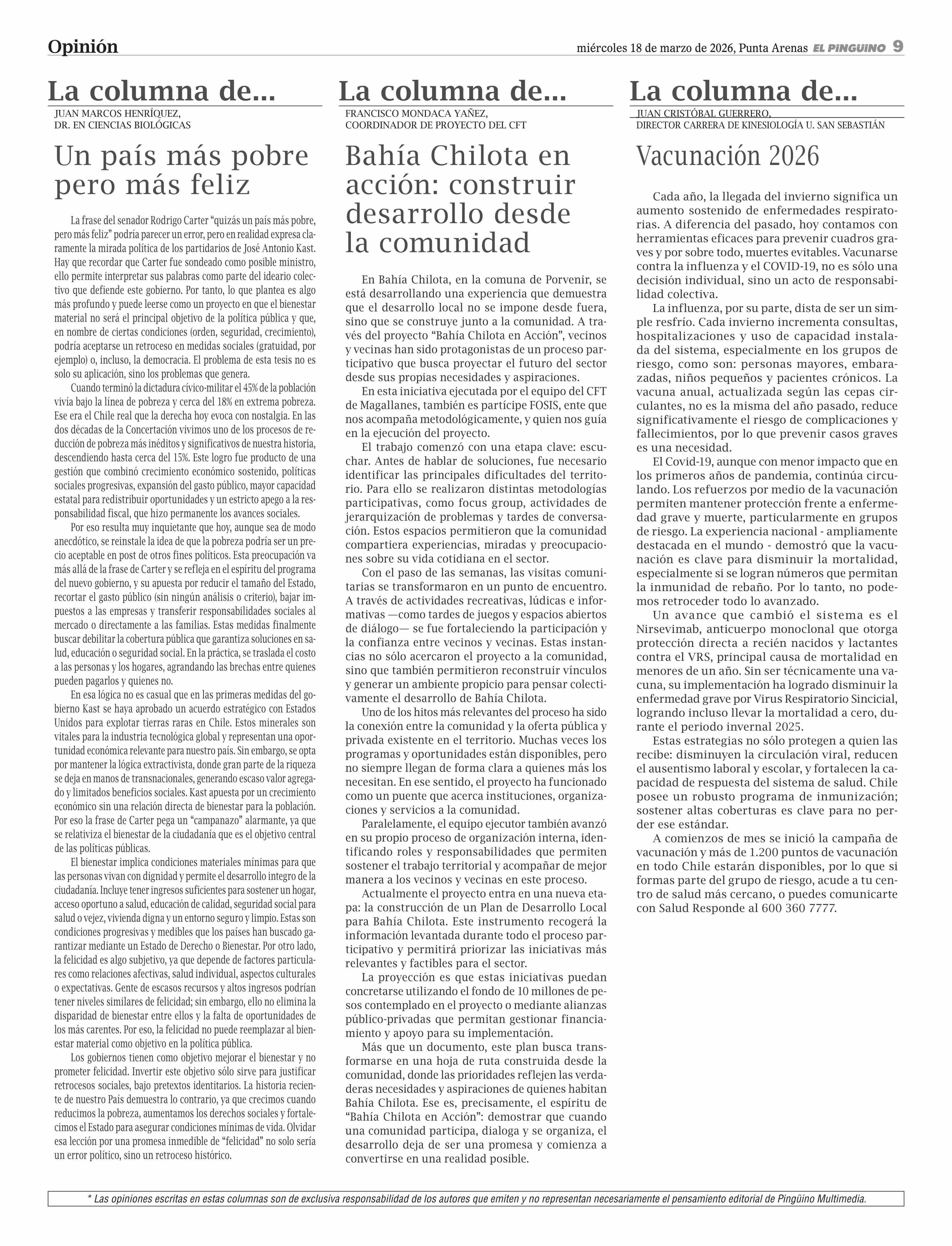 COLUMNAS DE OPINIÓN: Un país más pobre pero más feliz 18-03-2026 El Pingüino |