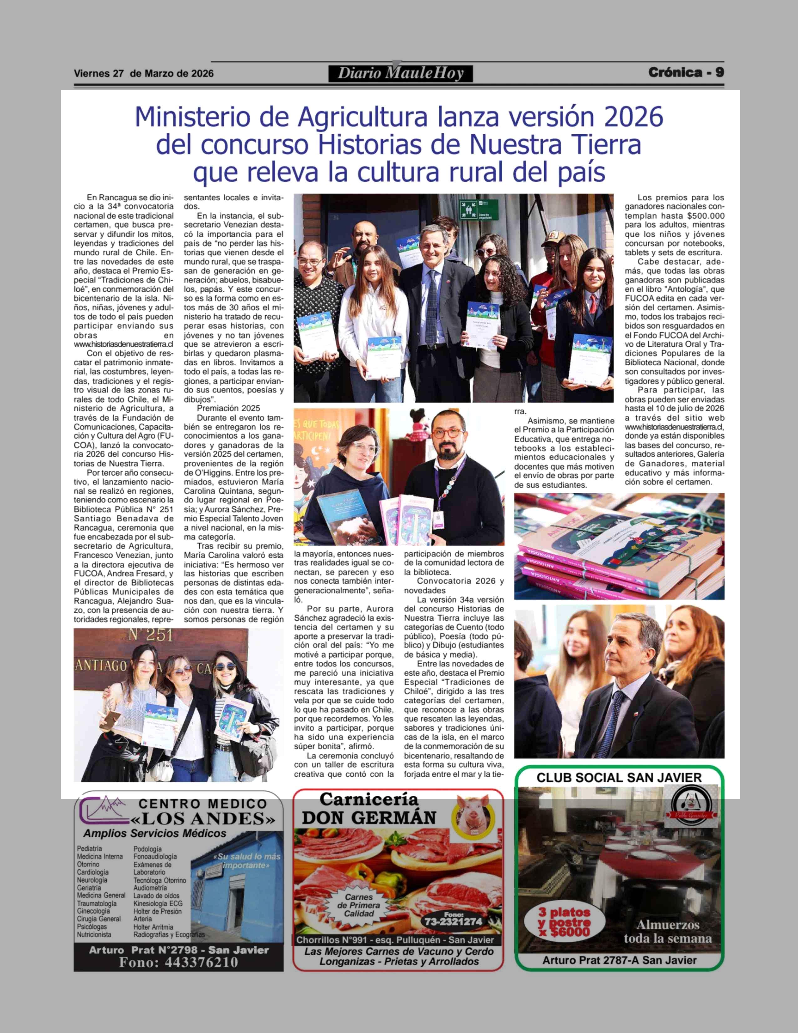 Ministerio de Agricultura lanza versión 2026 del concurso Historias de Nuestra Tierra que releva la cultura rural del país 27-03-2026 Maule Hoy |