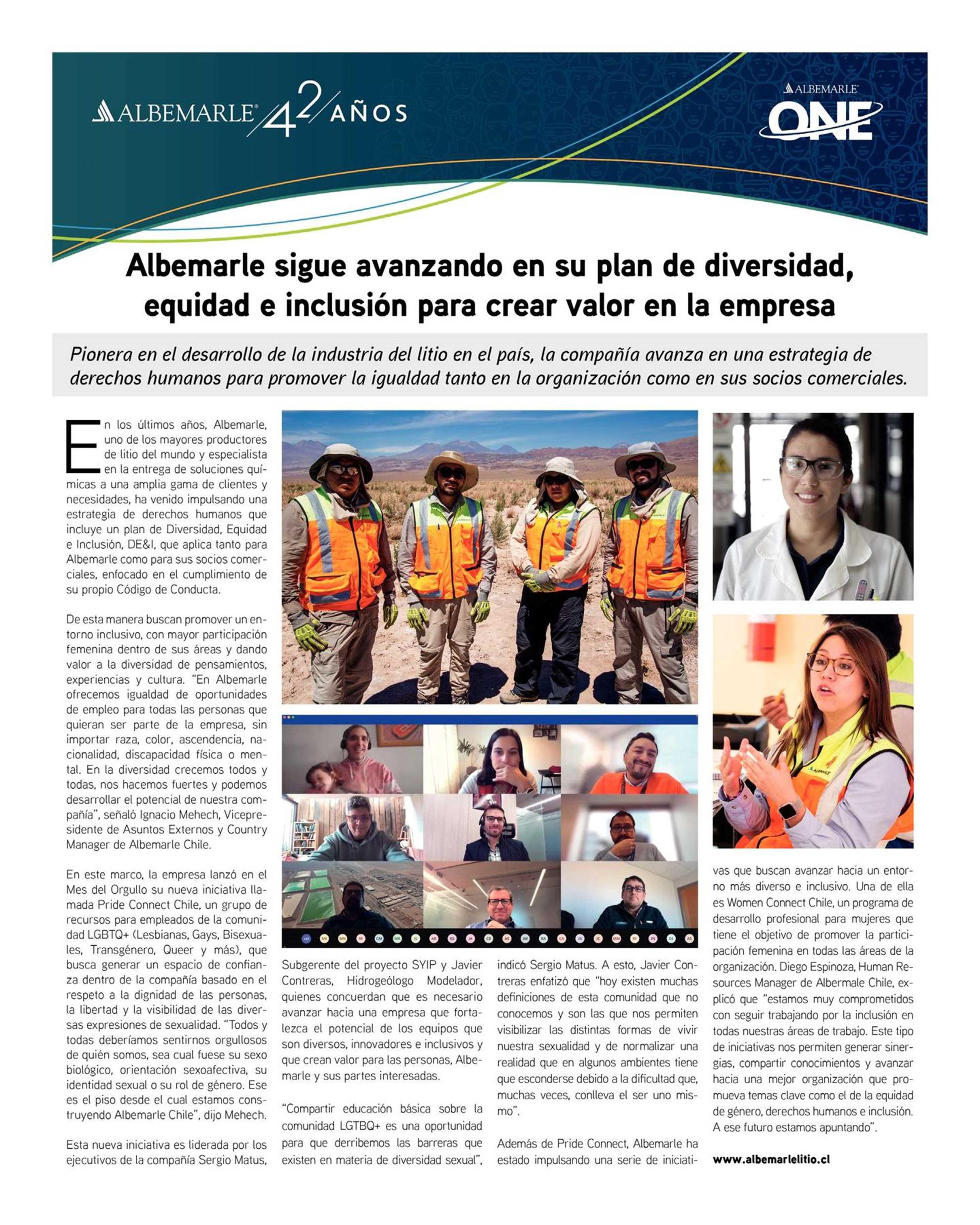 Albemarle sigue avanzando en su plan de diversidad, equidad e inclusión para crear valor en la empresa 10-08-2022 Edición Especial - Regiones I, II, III |