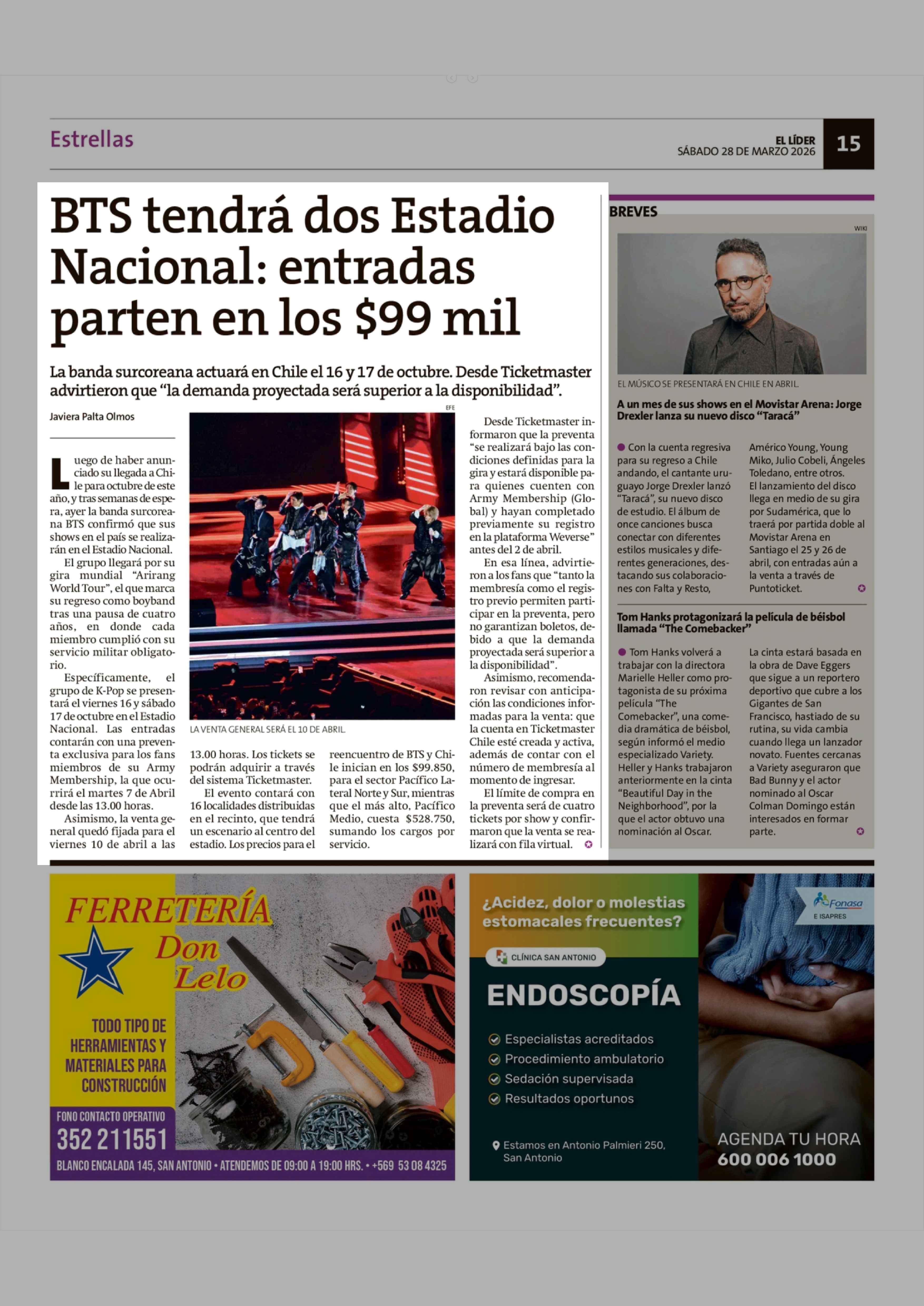 BTS tendrá dos Estadio Nacional: entradas parten en los $99 mil 28-03-2026 El Líder |