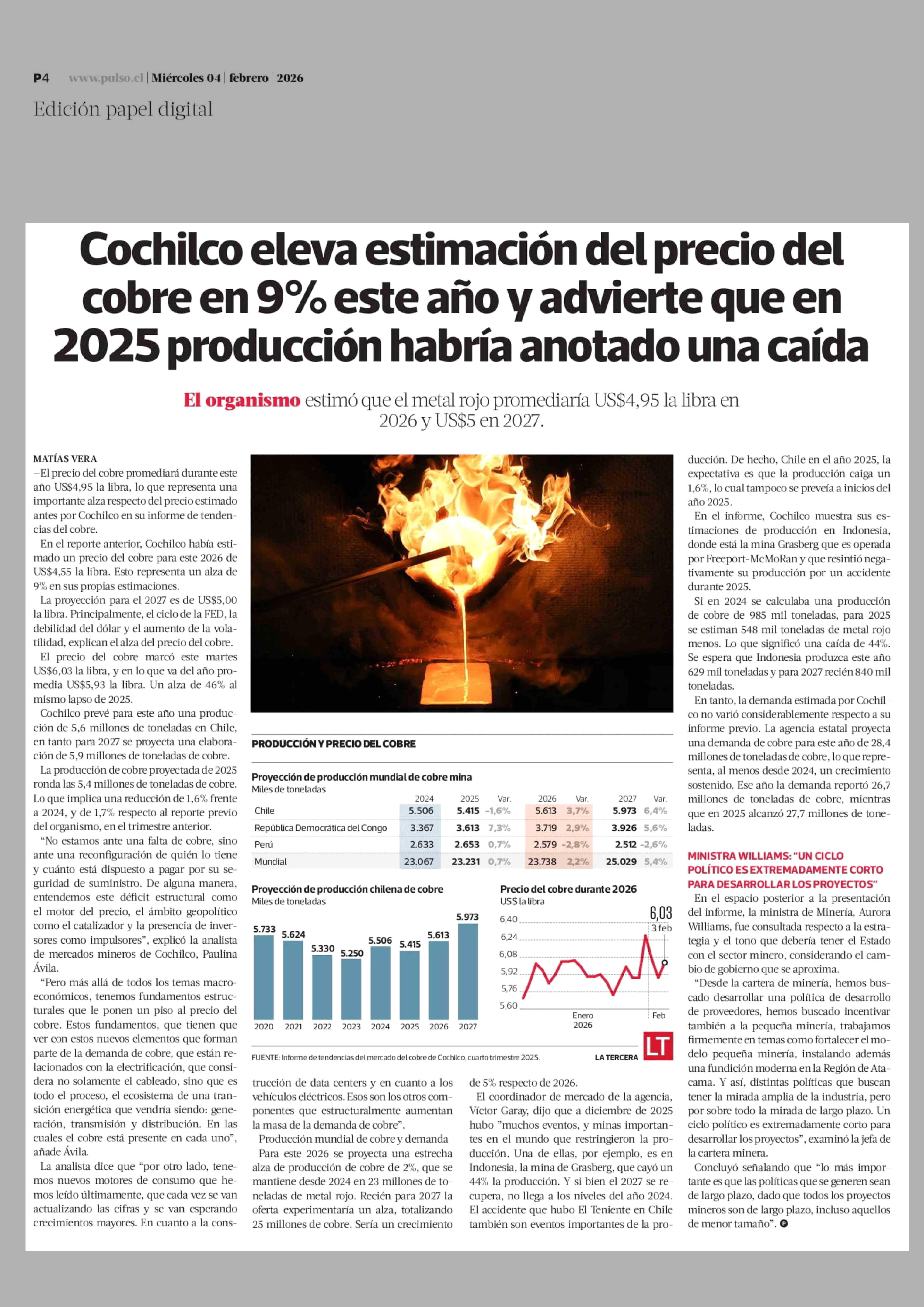 Cochilco eleva estimación del precio del cobre en 9% este año y advierte que en 2025 producción habría anotado una caída 04-02-2026 La Tercera |