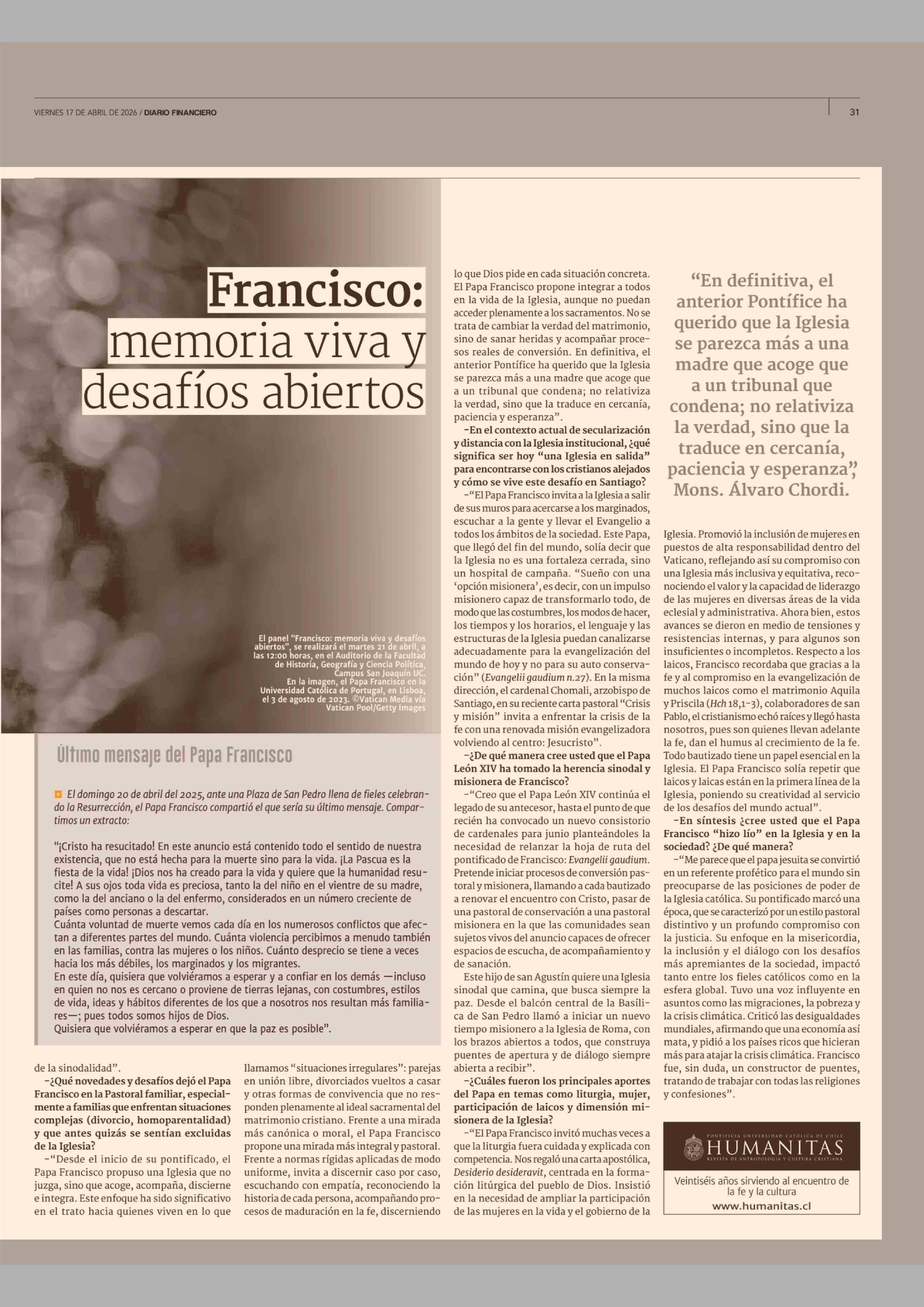 Francisco: memoria viva y desafíos abiertos 17-04-2026 Diario Financiero |