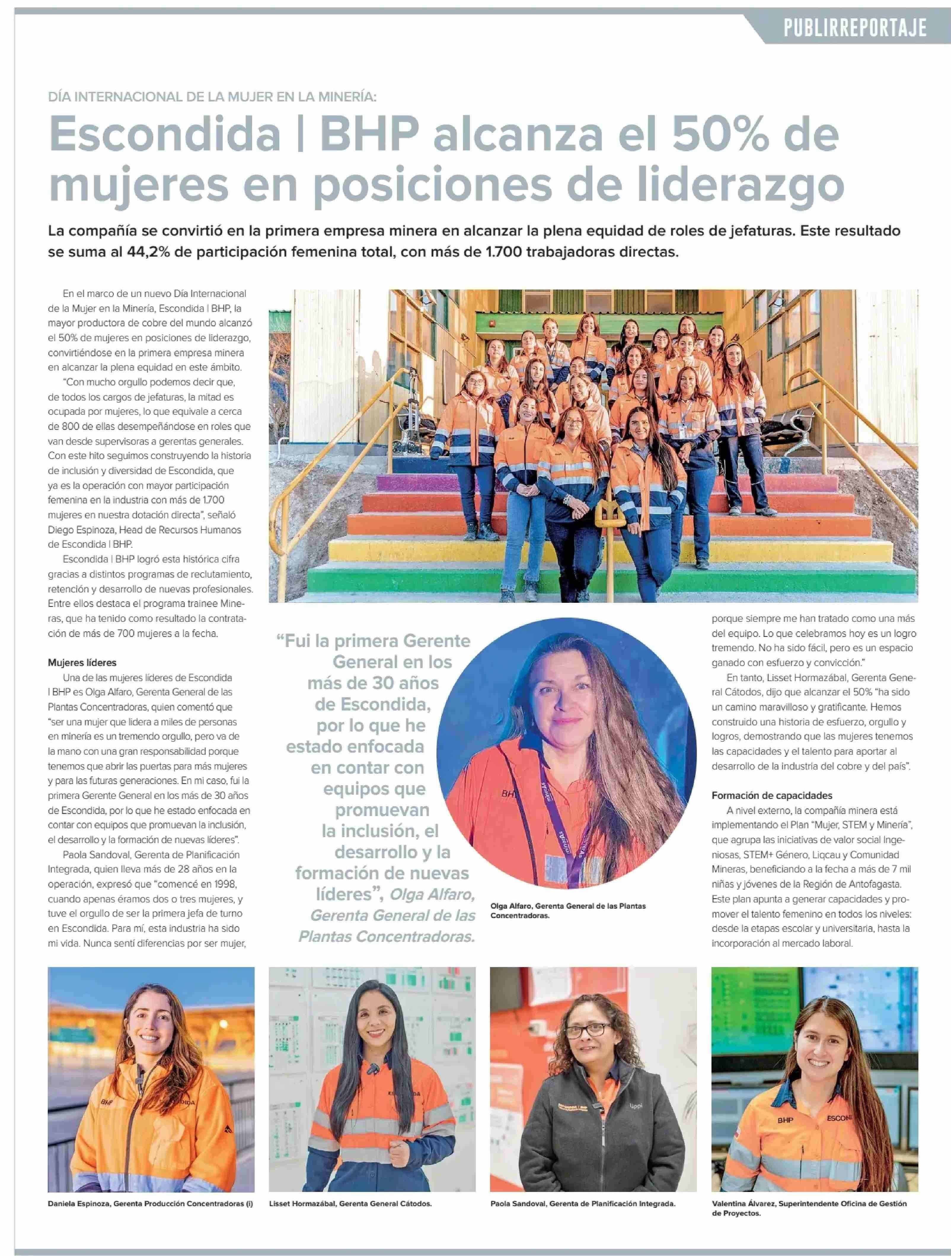 Escondida | BHP alcanza el 50% de mujeres en posiciones de liderazgo 15-06-2025 Diario Financiero |