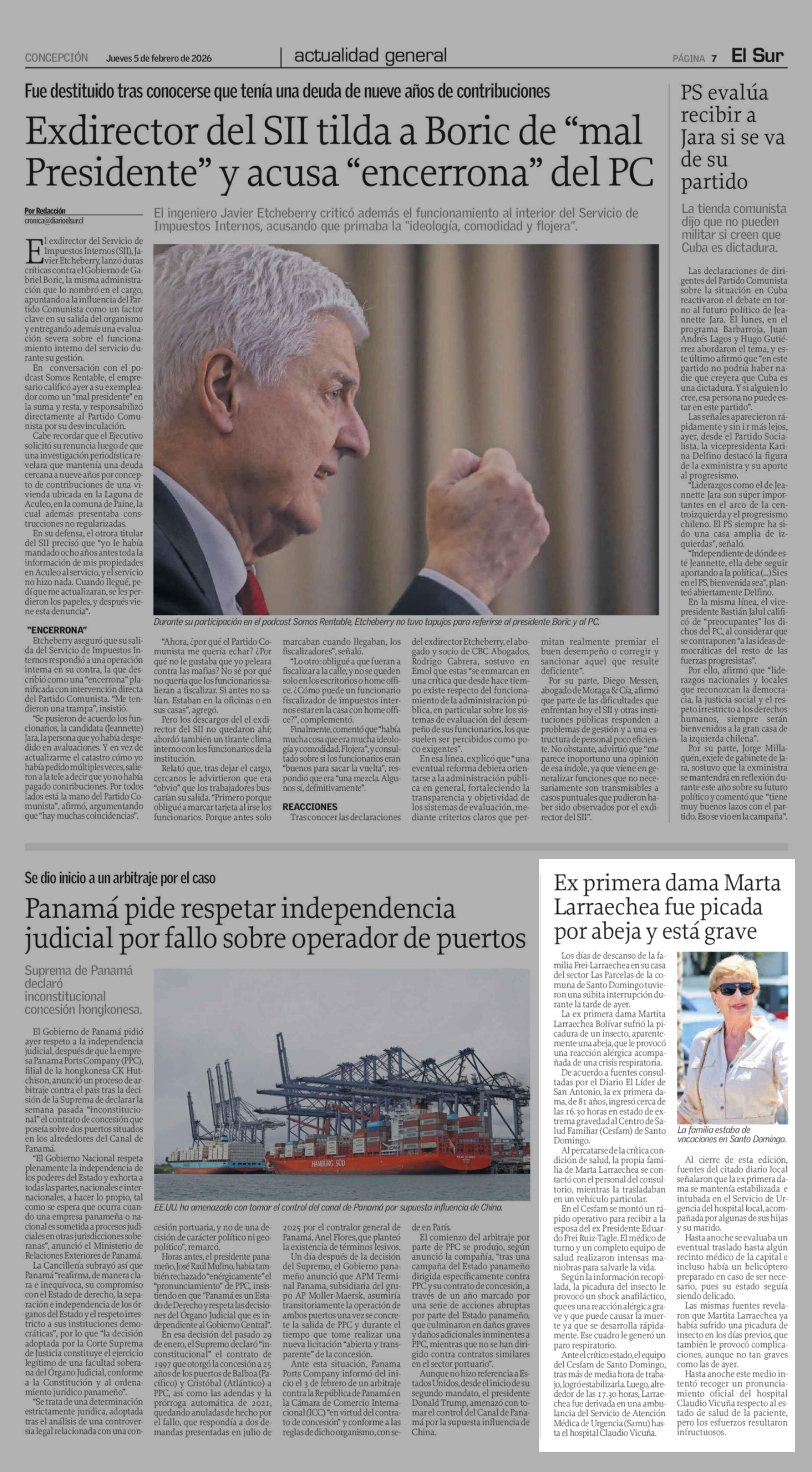 Ex primera dama Marta Larraechea fue picada por abeja y está grave 05-02-2026 El Sur |