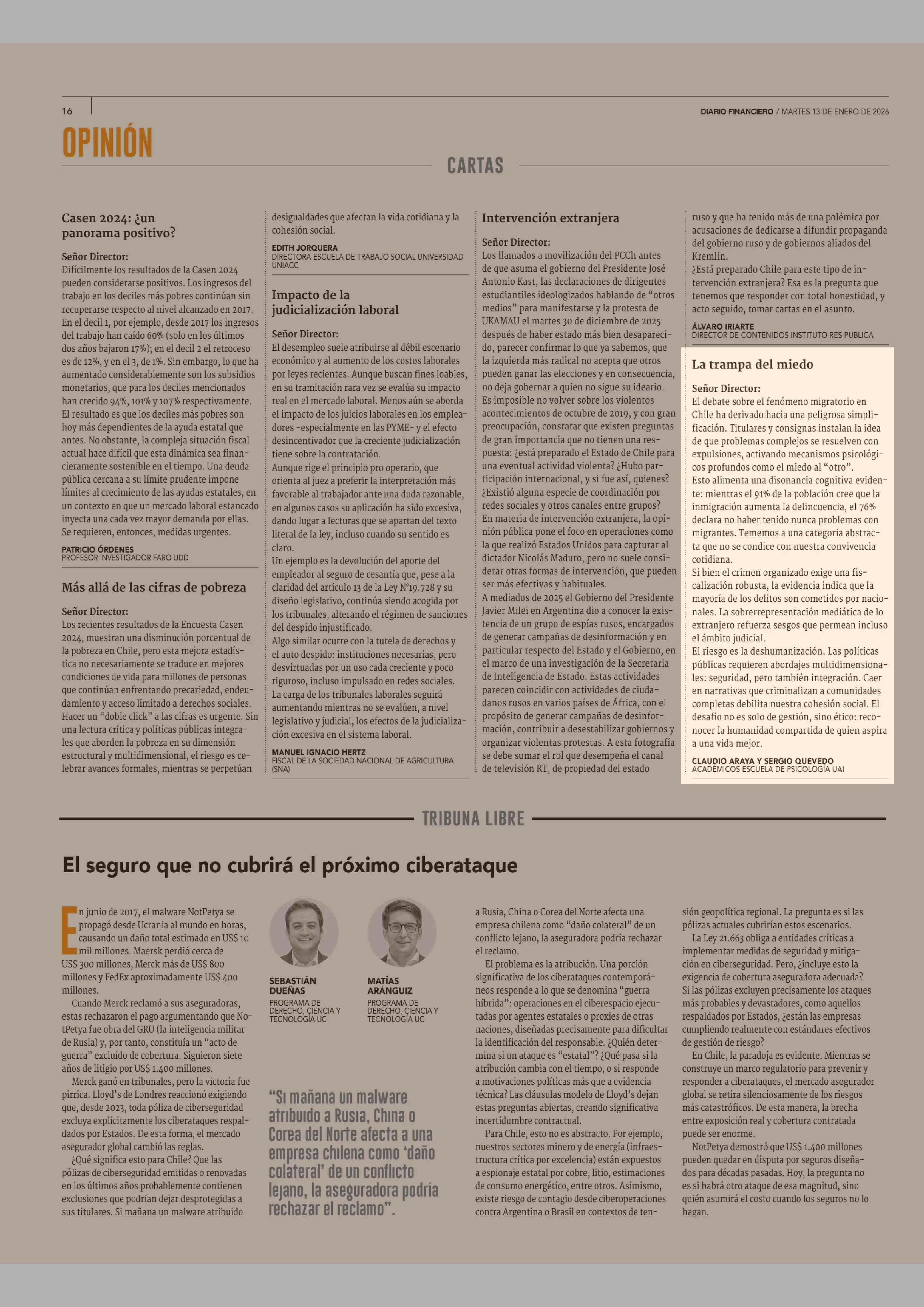 Cartas: La trampa del miedo 13-01-2026 Diario Financiero |