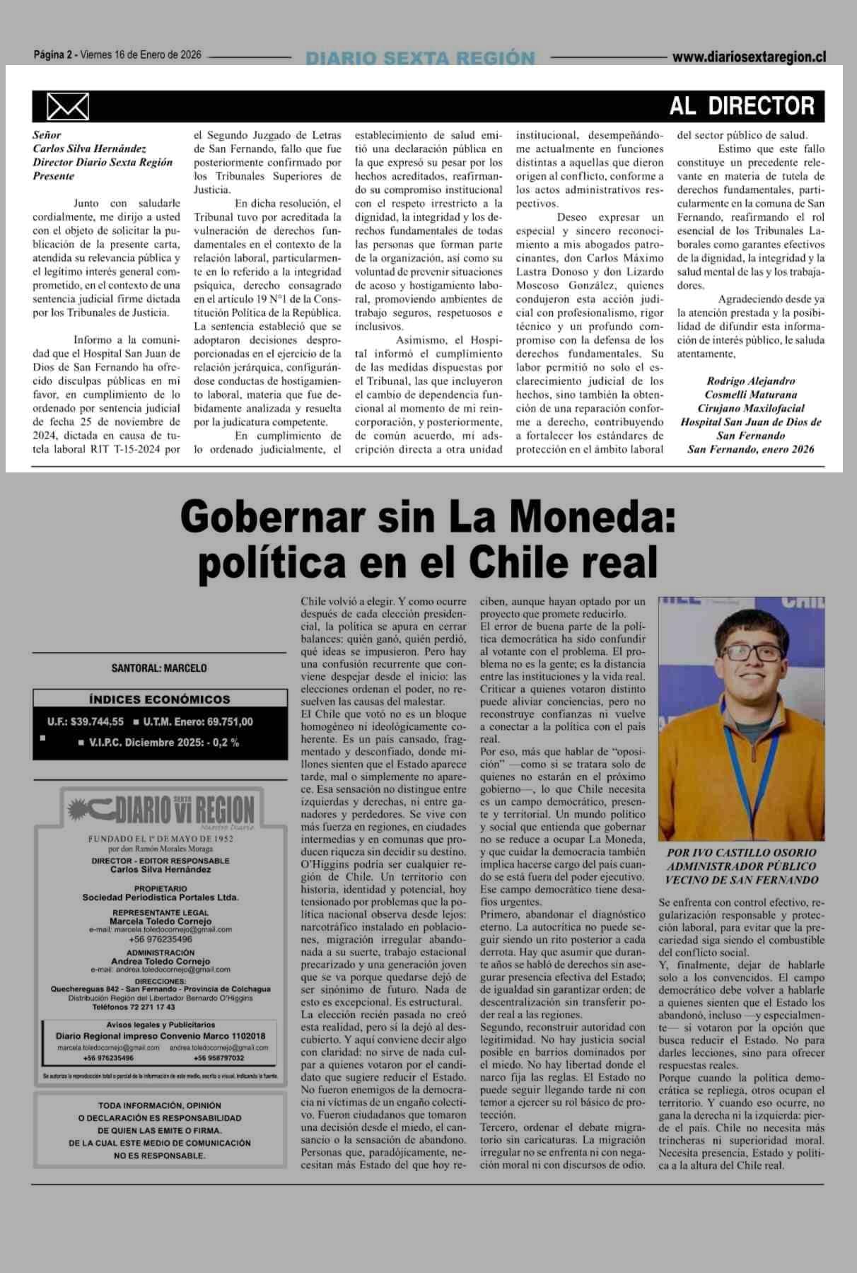 Cartas: AL DIRECTOR 16-01-2026 Diario VI Región |