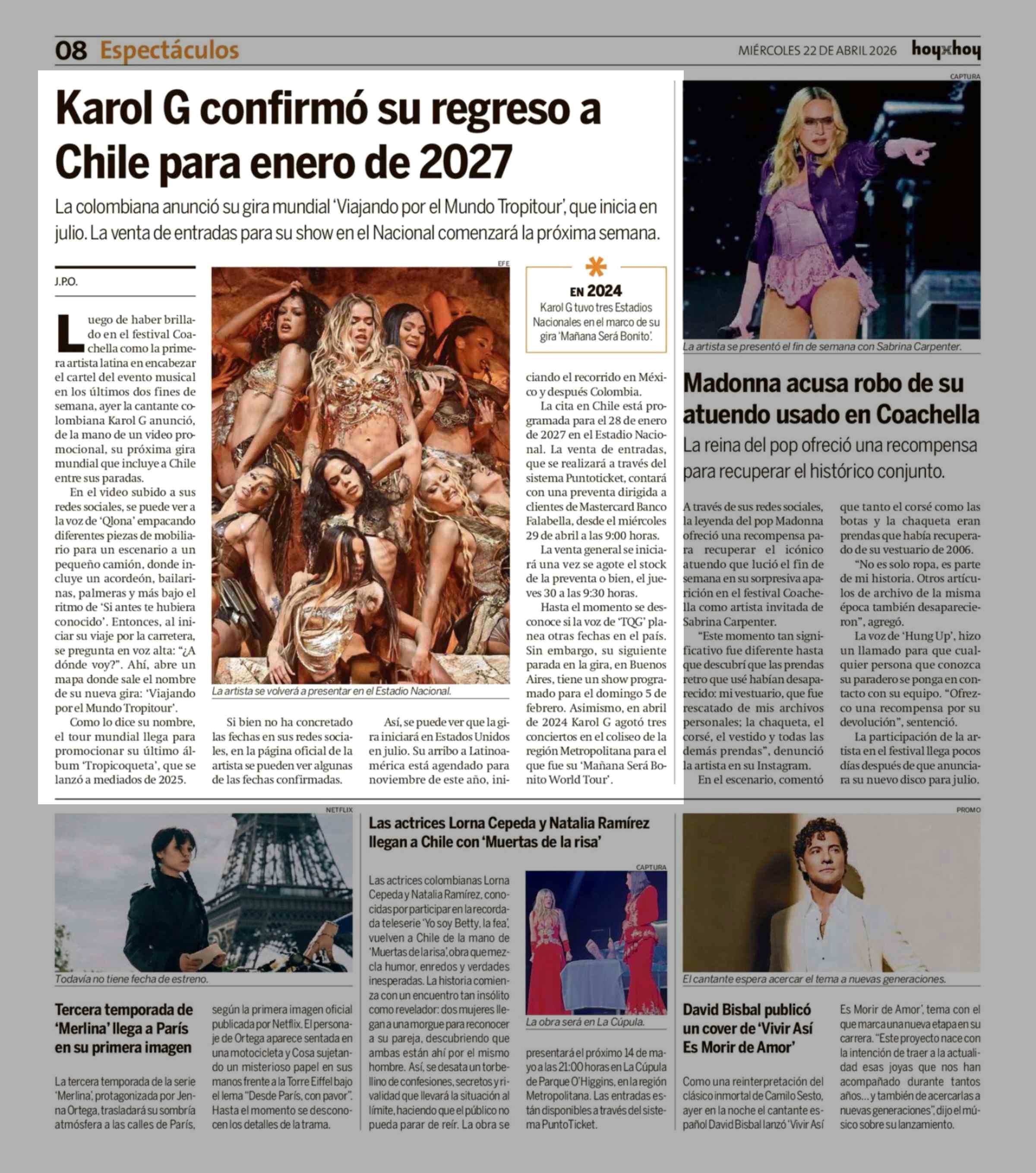 Karol G confirmó su regreso a Chile para enero de 2027 22-04-2026 Hoy x Hoy |