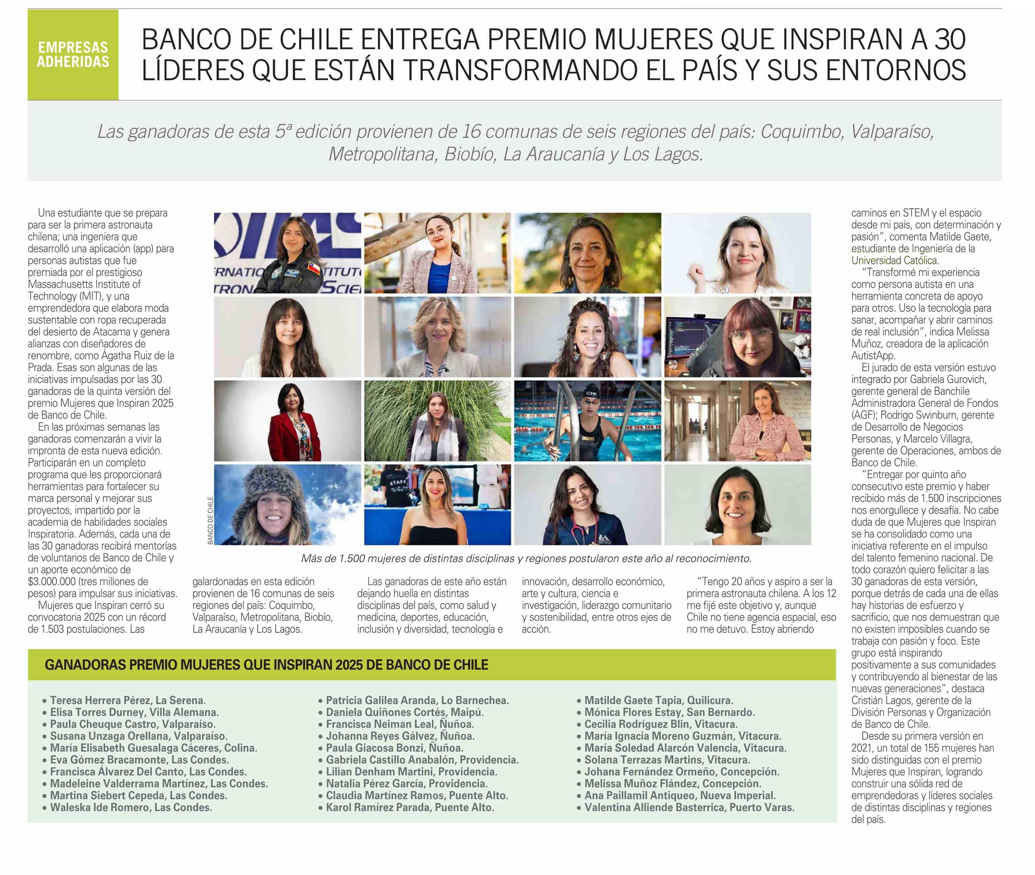 BANCO DE CHILE ENTREGA PREMIO MUJERES QUE INSPIRAN A 30 LÍDERES QUE ESTÁN TRANSFORMANDO EL PAÍS Y SUS ENTORNOS 28-05-2025 El Mercurio |