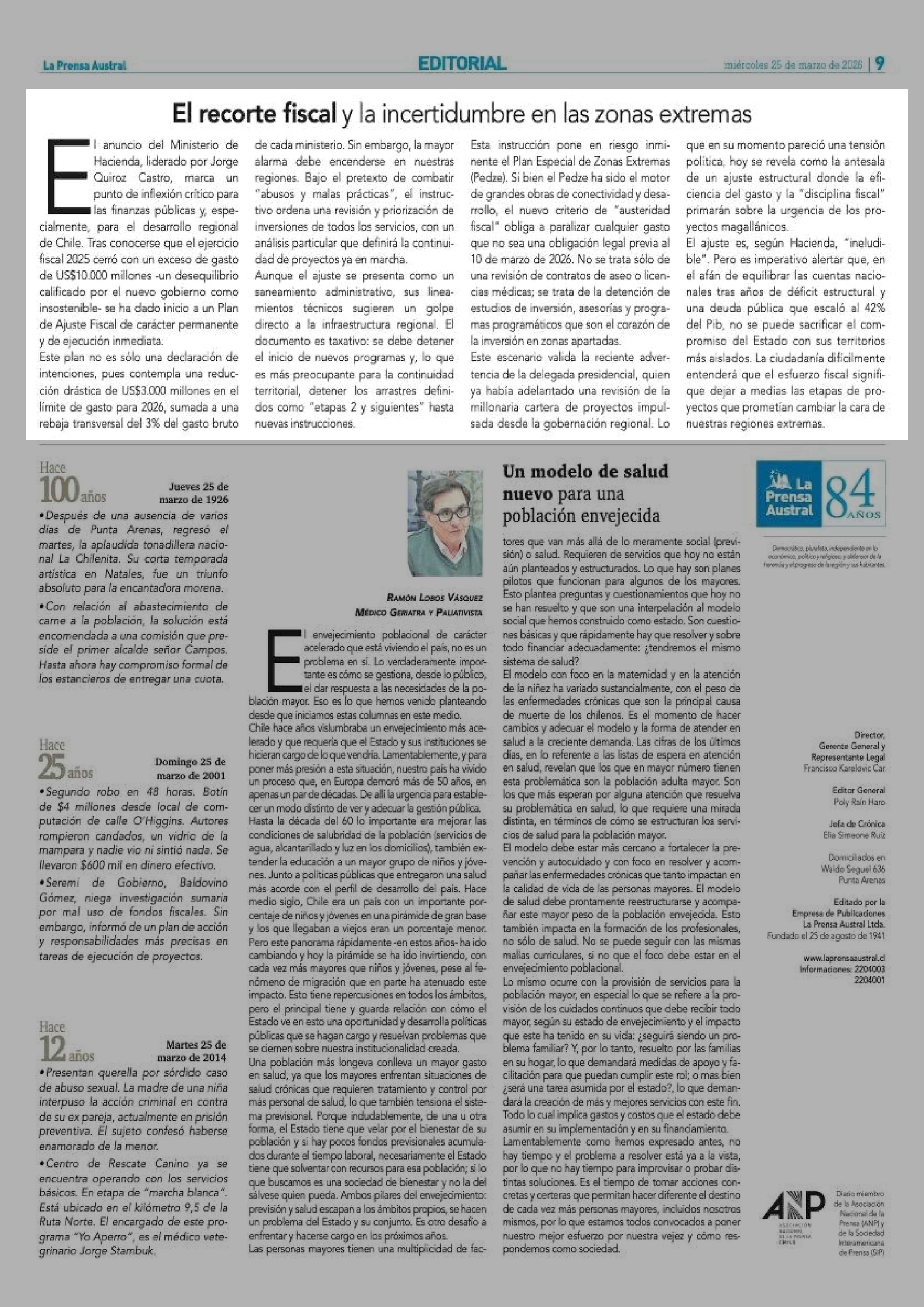 Editorial: El recorte fiscal y la incertidumbre en las zonas extremas 25-03-2026 La Prensa Austral |