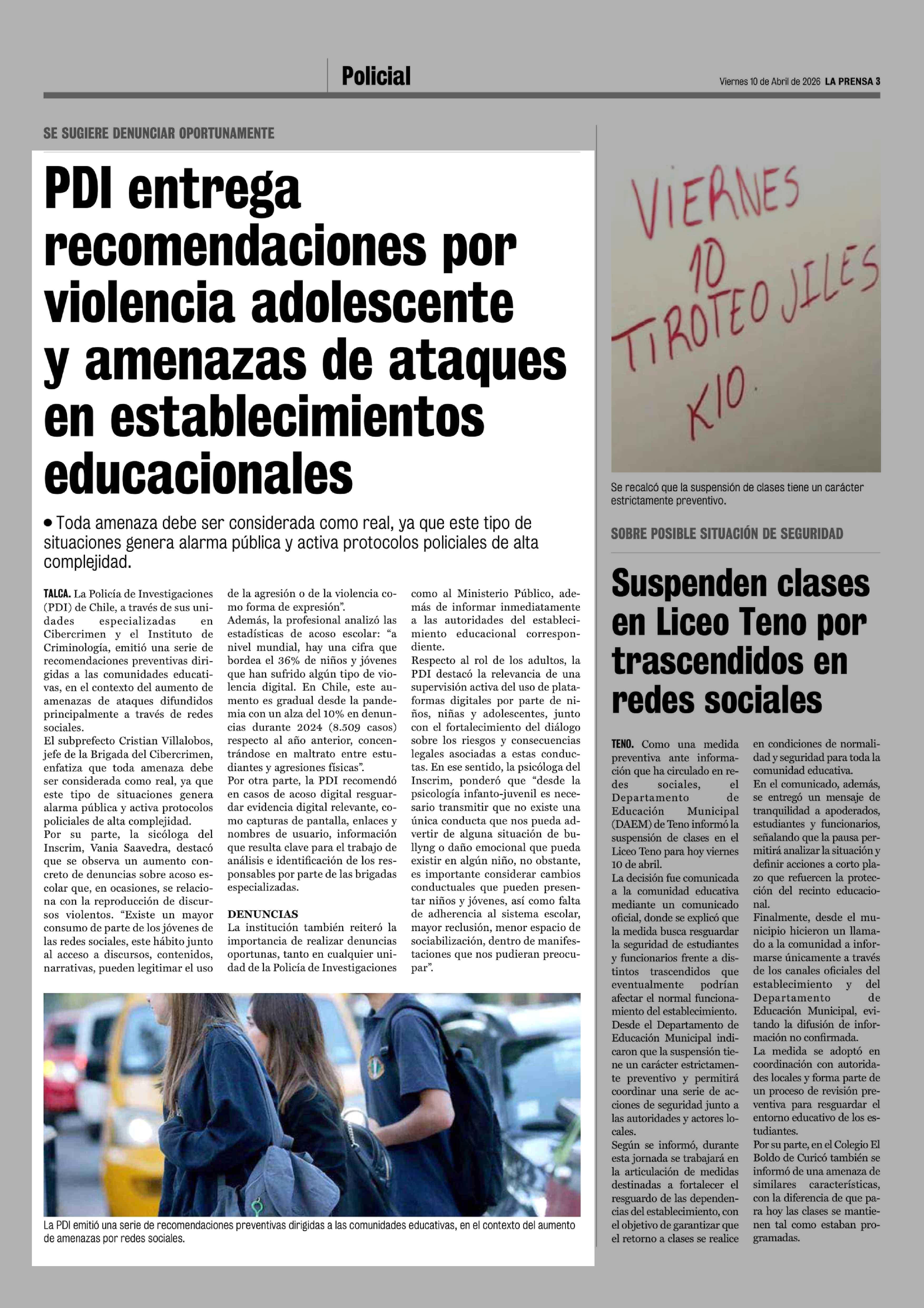 Título: PDI entrega recomendaciones por violencia adolescente y amenazas de ataques en establecimientos educacionales
